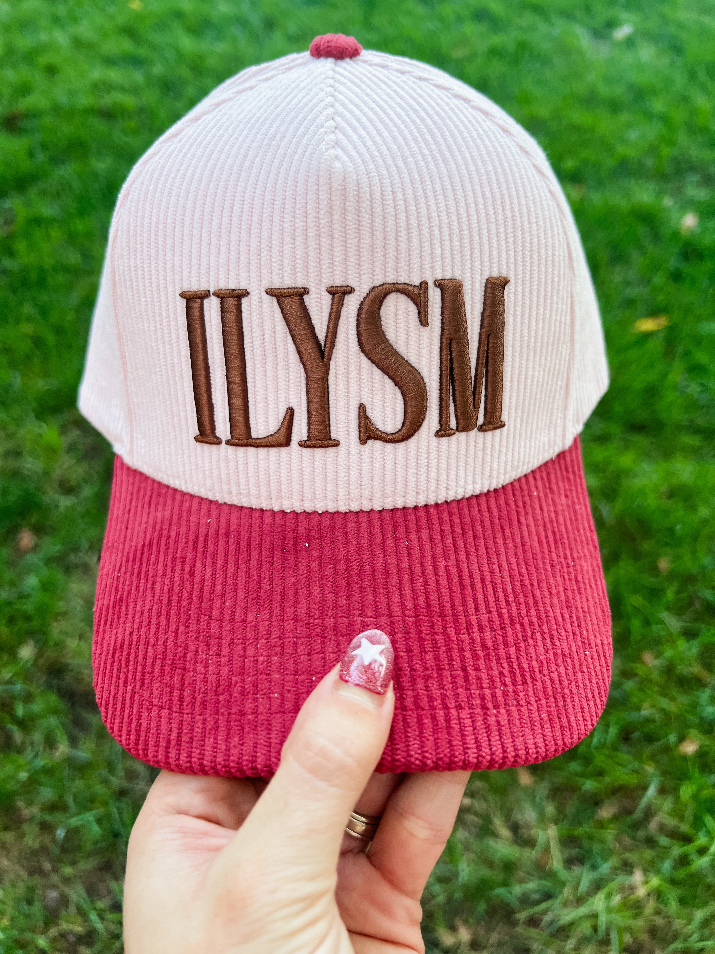 Add a splash of cozy charm to your fall wardrobe with the ILYSM Trucker Hat. Featuring light pink and burgundy corduroy panels, accented with chocolate brown embroidery, this adjustable hat offers a perfect fit for any autumn adventure. Its playful mix of warm colors makes it a fun and stylish way to embrace the season.
