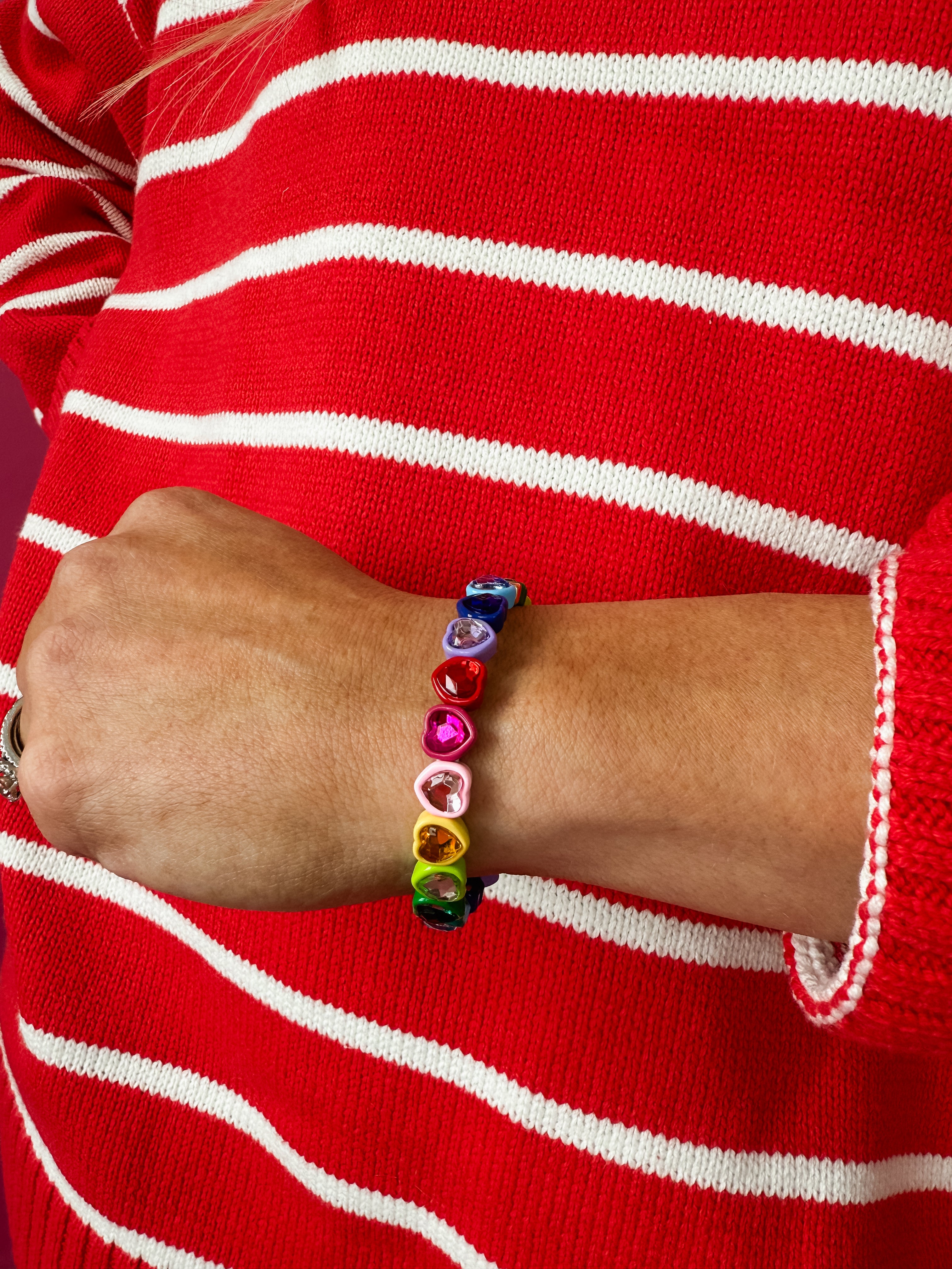 Slip on a burst of color with this charming rainbow heart bracelet! Each vibrant gemstone heart catches the light beautifully, creating a cheerful accessory that celebrates your bold, joyful spirit. The stretch design means effortless on-and-off wear—no clasps needed. Perfect for stacking with other bracelets or wearing solo, this playful piece brings instant happiness to your wrist. A delightful way to express your colorful personality every single day.