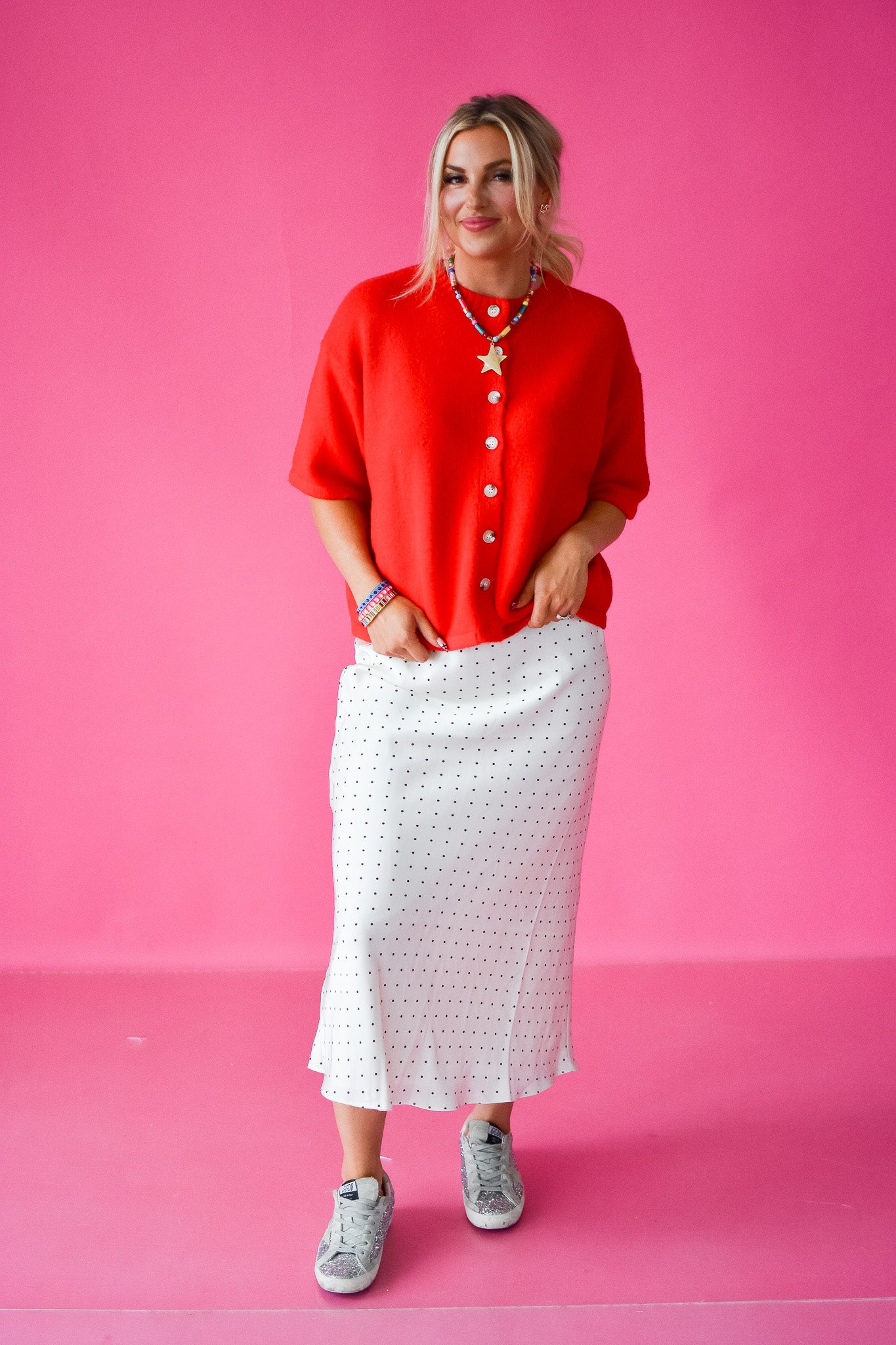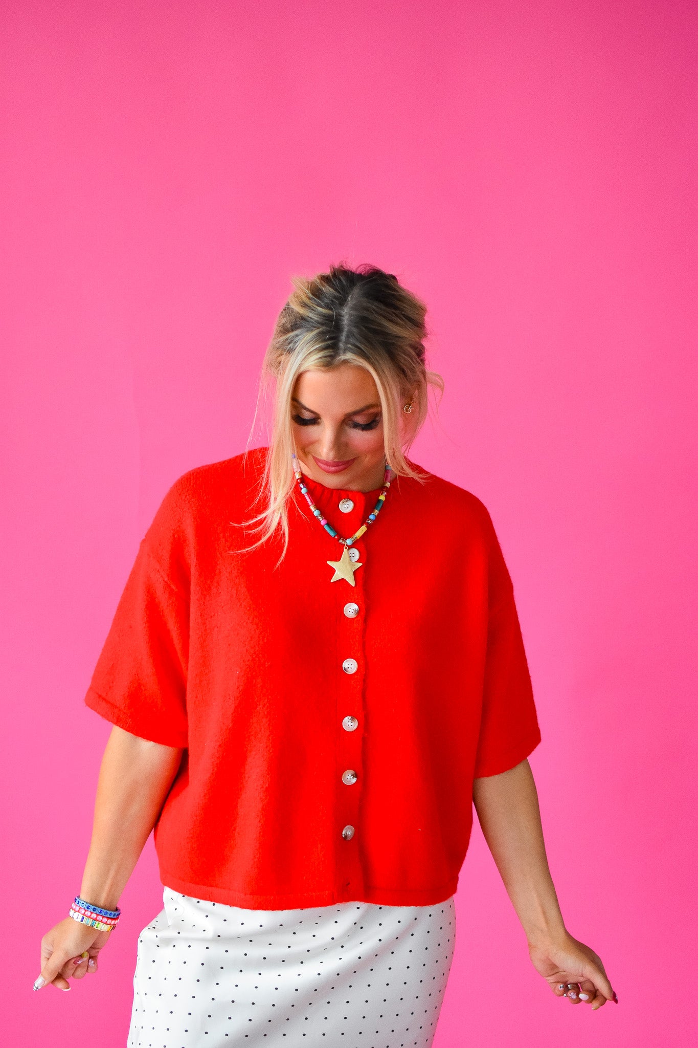 Add a pop of vibrant color to your wardrobe with the Lacie Short Sleeve Cardigan in Cherry. This bright cherry red piece features a relaxed fit and easy button-up front, making it your go-to for effortless style and comfort. Perfect for layering or wearing solo, it blends playful charm with everyday ease.