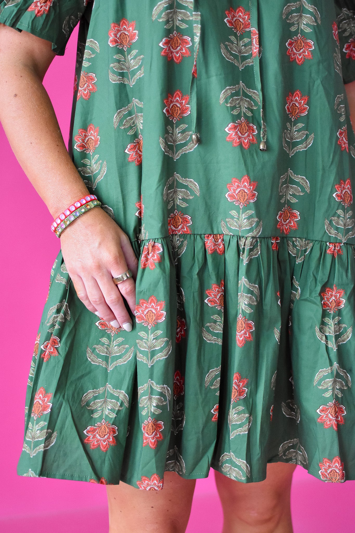 Turn heads in the Maeve Floral Mini Dress, featuring a lively olive green base adorned with charming red floral prints. Its short sleeves keep it breezy and fun, perfect for sunny days or casual nights out. This playful mini dress combines a flirty silhouette with vibrant colors to brighten your wardrobe effortlessly.