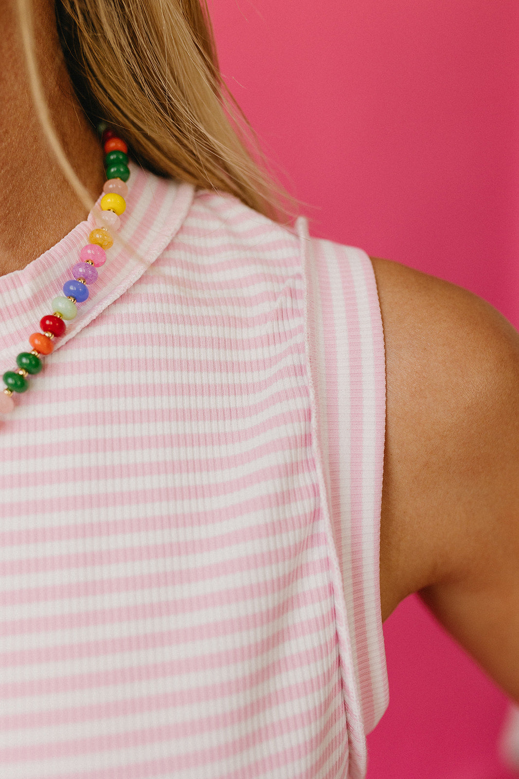 Snag this Cameron Knit Tank Top and you've got yourself a wardrobe MVP for spring! Inspired by Free People's aesthetic, this crew neck essential features a slightly ribbed texture that hugs in all the right ways, plus a chic seam running down the back for added dimension. The raw hem details give it that effortlessly cool vibe, while the super stretchy fabric moves with you all day long. Not cropped, not fussy—just a perfectly proportioned basic that works with everything. baby pink and white colorway? Chef's kiss.
