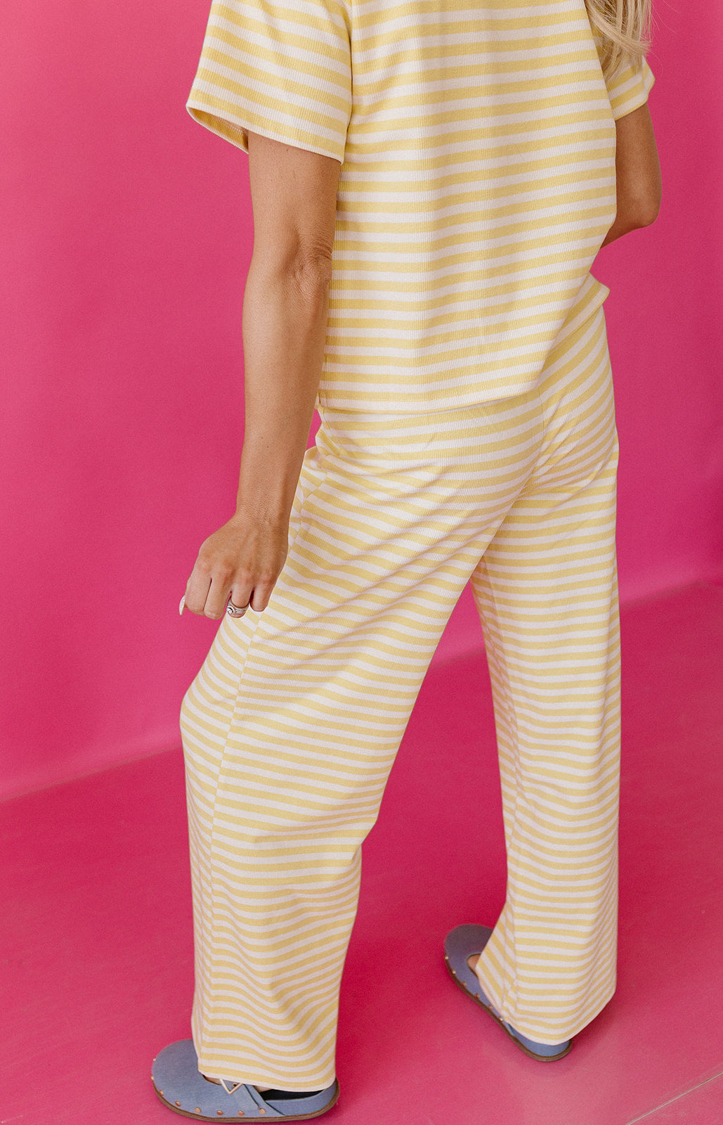 The Ramsey Stripe Short Sleeve Top in Butter Yellow is your new travel essential and cozy-at-home favorite. This crew neck tee features a slightly ribbed fabric that hits the sweet spot—substantial enough to hold its shape, light enough to breathe. Practical side slits add movement and style, while the impeccable fit makes it instantly wearable. Pair it with the matching pants (sold separately) for a coordinated set that transitions seamlessly from airport to armchair. Perfect for anyone who refuses to choose between comfort and looking put-together.