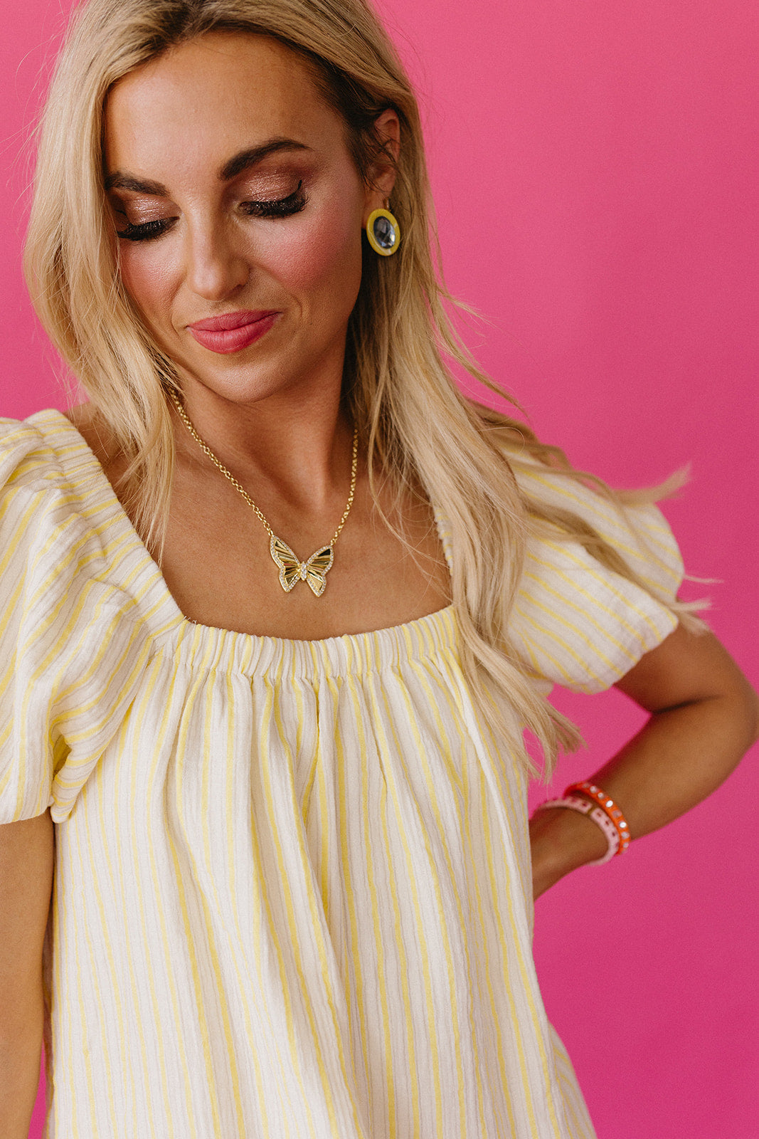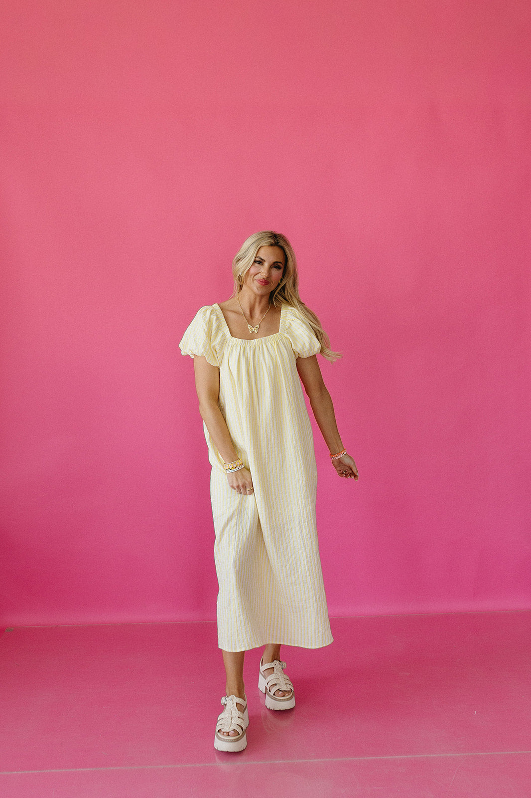 Twirl into spring with the Tanner Puff Sleeve Maxi Dress—a cheerful pick for classroom days and beyond. Soft light yellow stripes dance across the fabric, while charming puff sleeves and a flattering square neckline steal the show. The smocked elastic waist offers a comfortable fit, and the lined interior keeps things polished. Best of all? Functional pockets mean you can actually carry your essentials. Perfect for teachers who want to look put-together without sacrificing comfort.