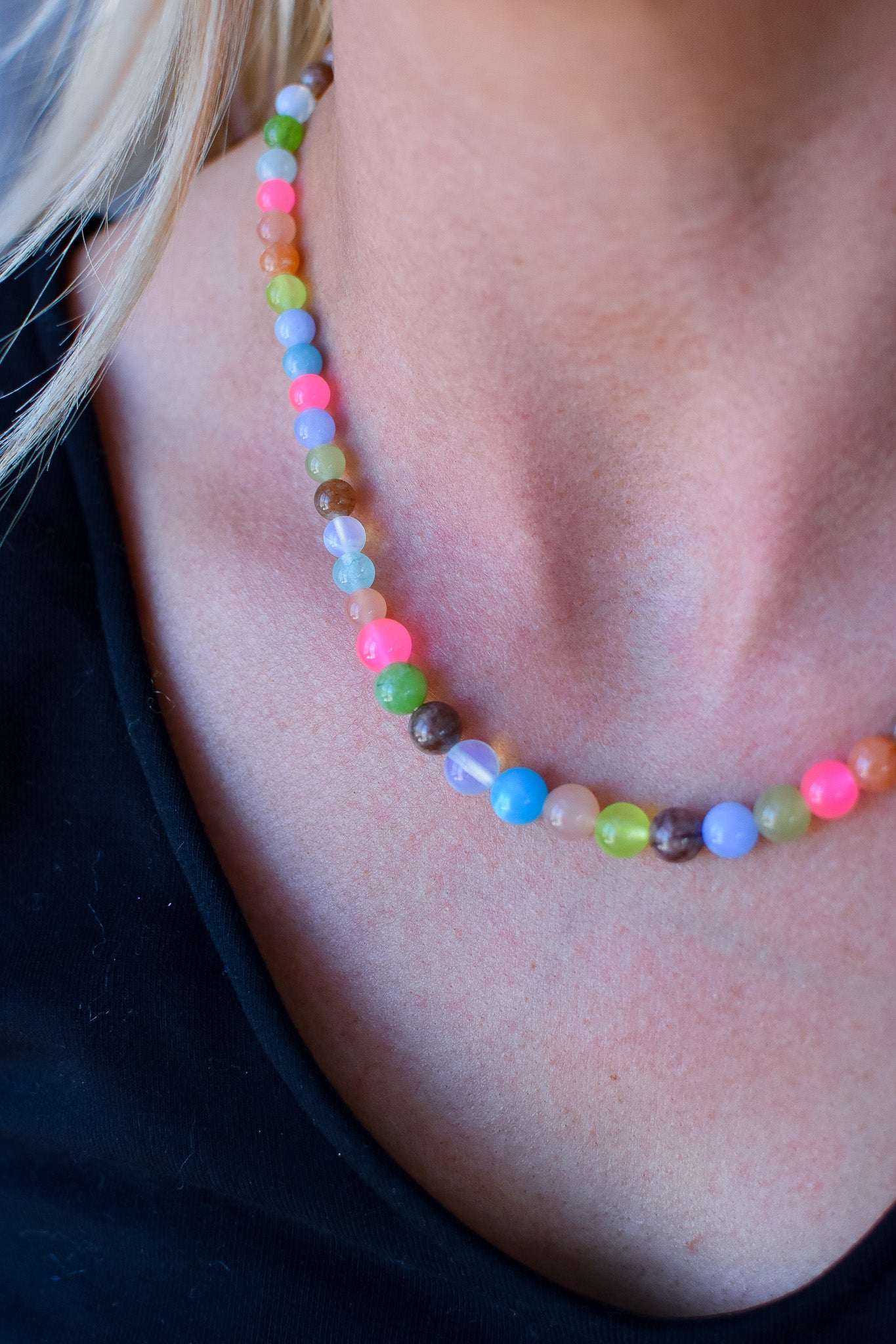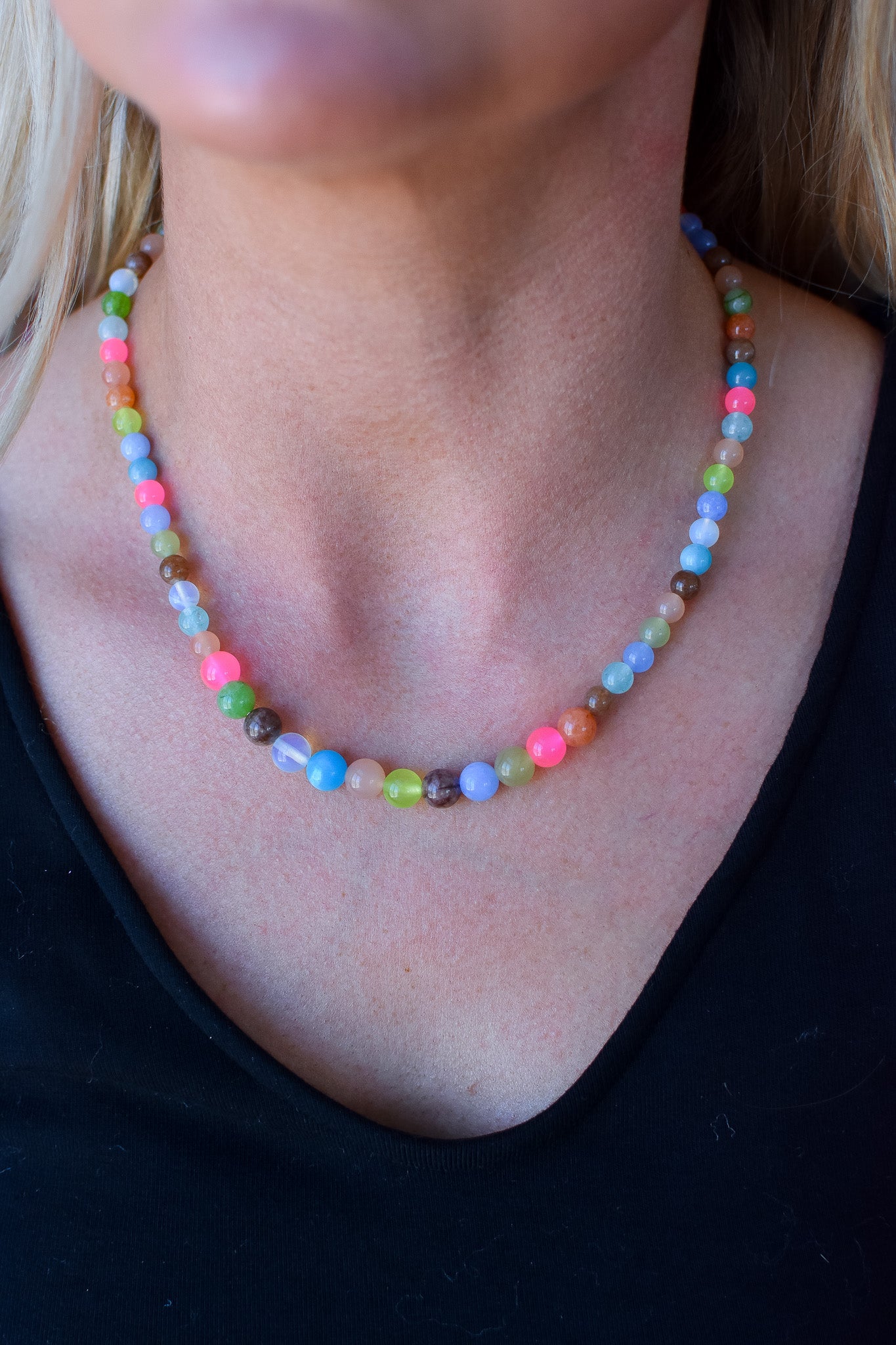 Elevate your fall style with the Hallie Necklace, featuring natural stone beads that bring earthy charm to any outfit. The magnetic clasp makes it a breeze to wear, while the extender chain gives you versatile layering options. Perfect for mixing and matching, this necklace adds a playful touch to your autumn look.