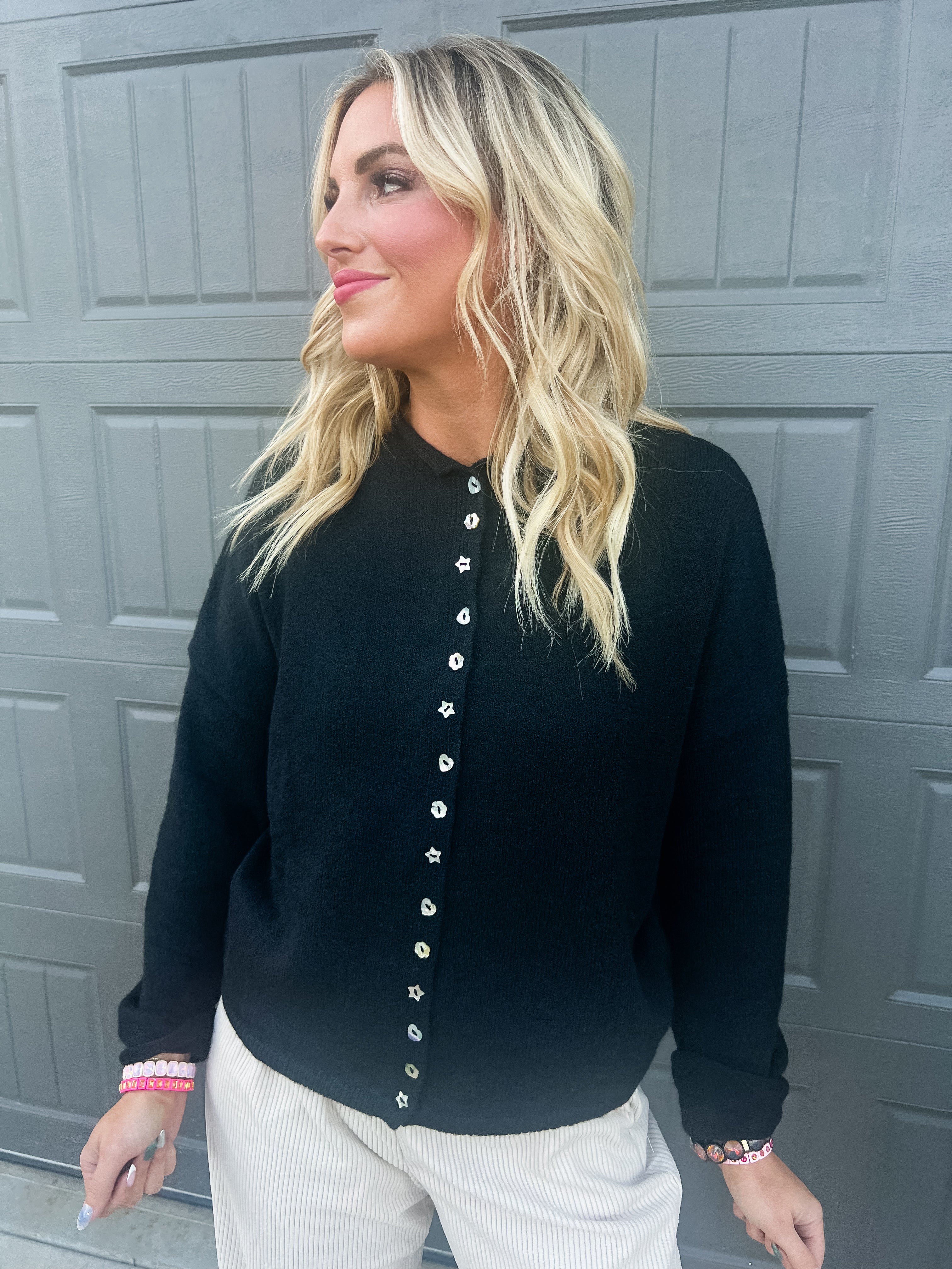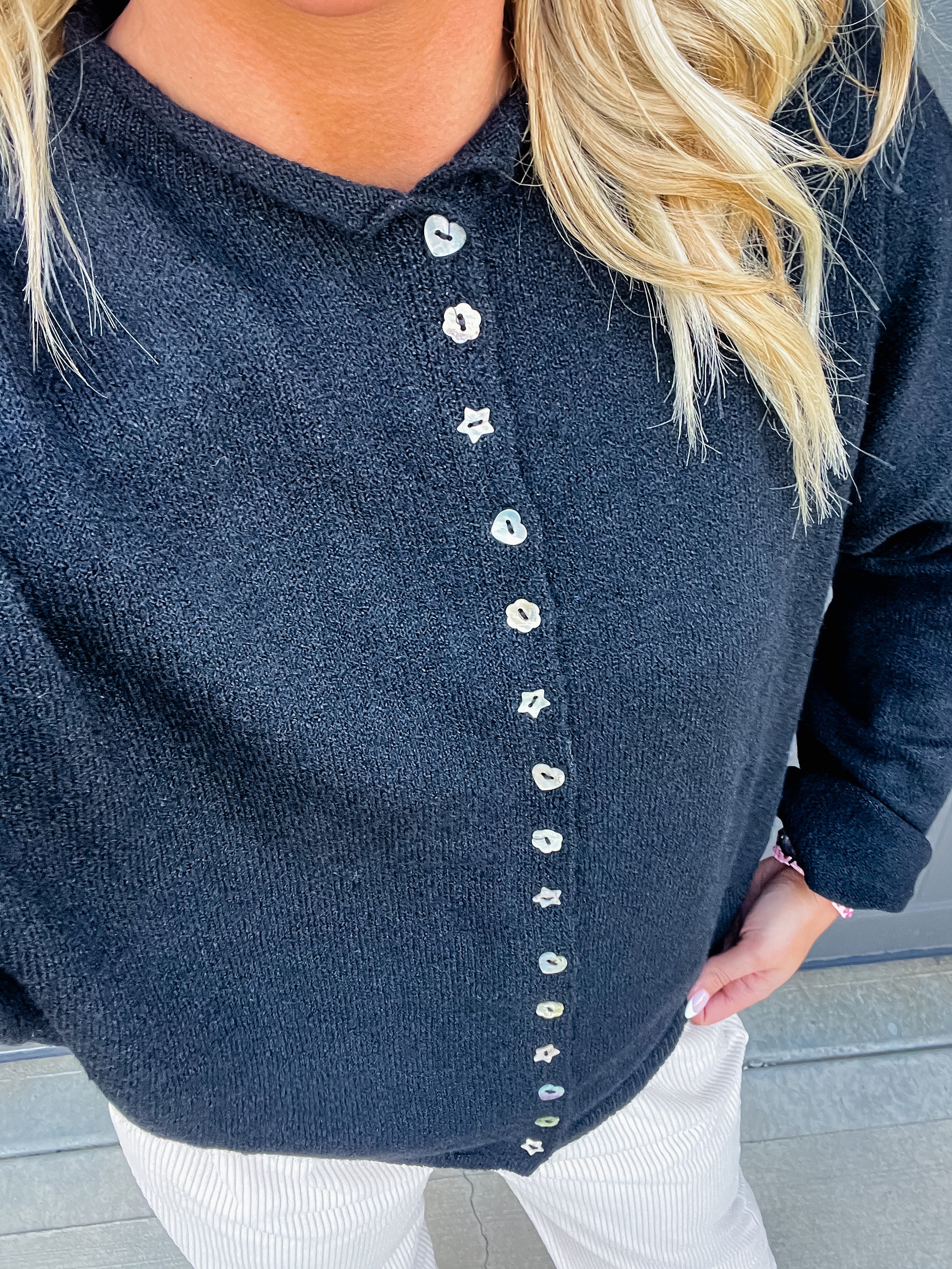 Get ready to go viral in our playful Piper Cardigan! This black mix match button up cardigan features super soft fabric, white buttons and an oversized, relaxed fit for maximum comfort and style. The buttons are pearl and are heart, star, and flower shaped. Truly unique and special!