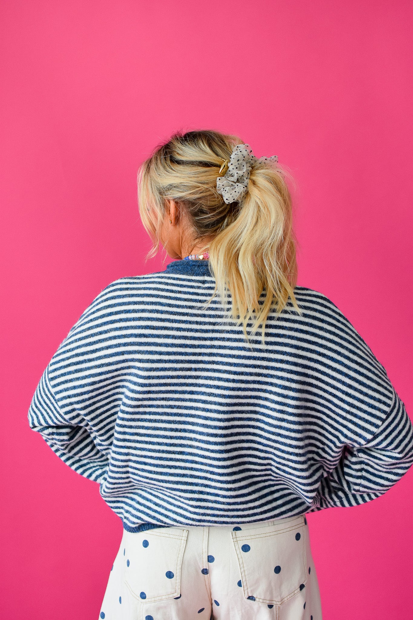 Get ready to go viral in our playful Piper Cardigan! This denim blue and ivory stripe button up cardigan features super soft fabric, white buttons and an oversized, relaxed fit for maximum comfort and style.