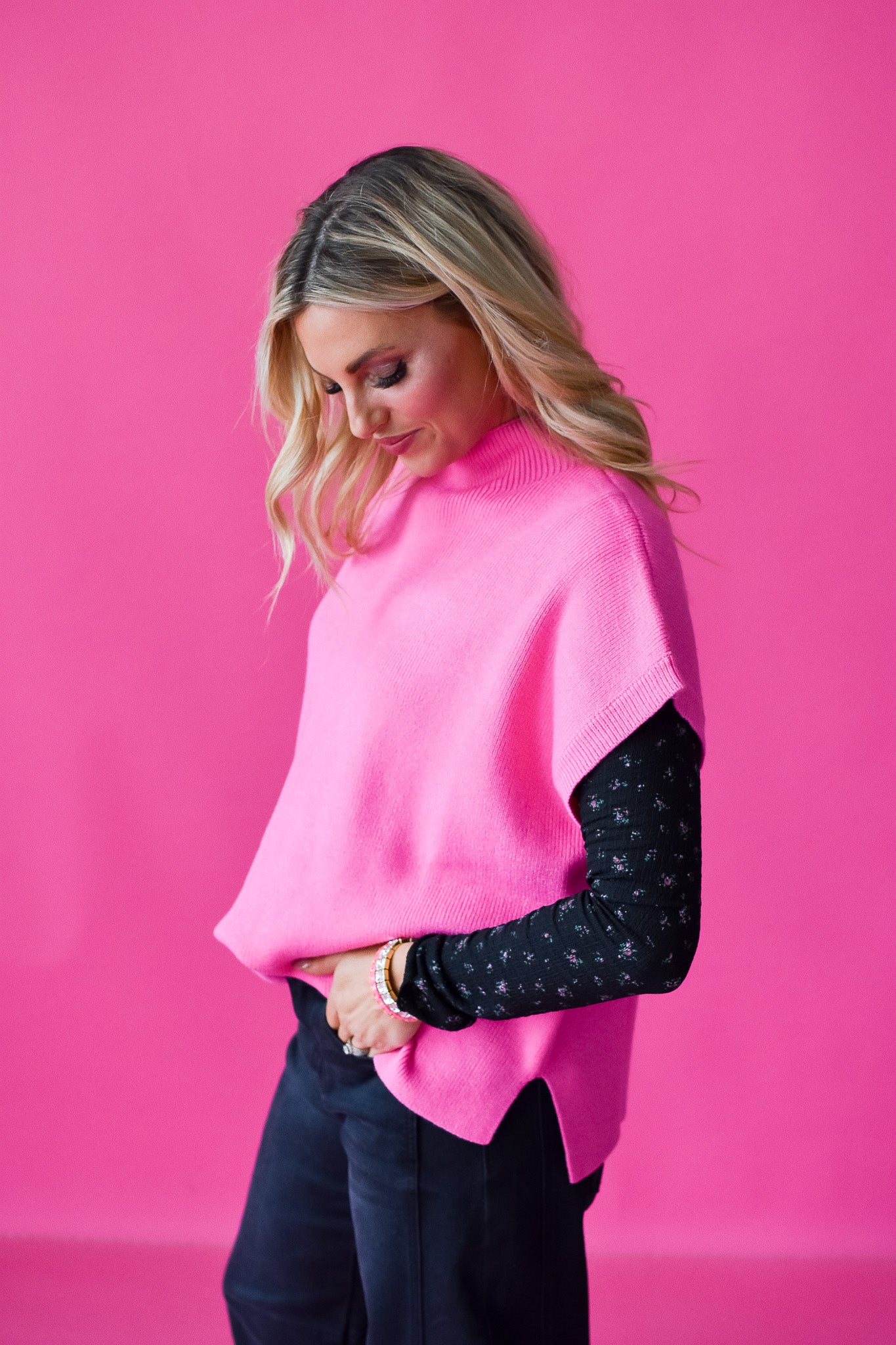 The Willow Floral Long Sleeve Top in Black features a charming pink floral pattern on soft black crinkle fabric. Its playful mock neck adds a flirty touch, making it perfect to wear alone or as a stylish layering piece. Light and comfortable, this top effortlessly brightens any outfit with a pop of color and texture.