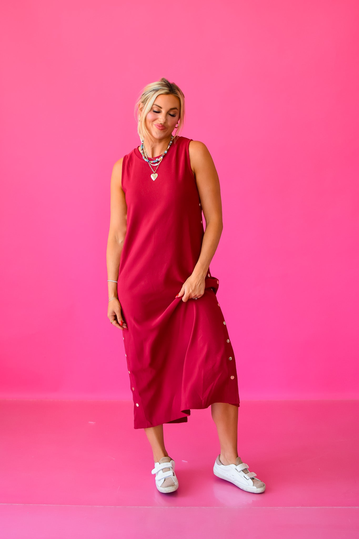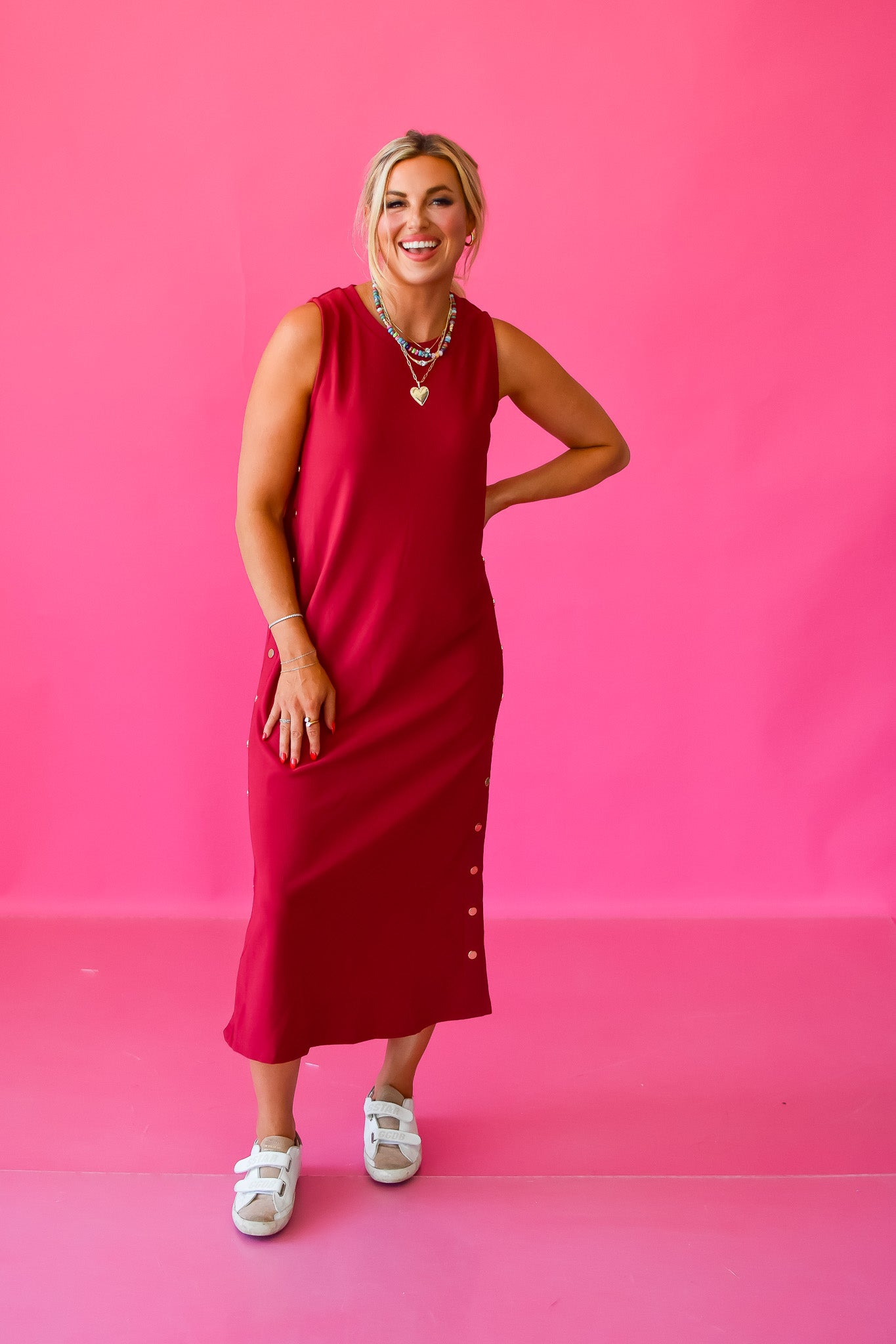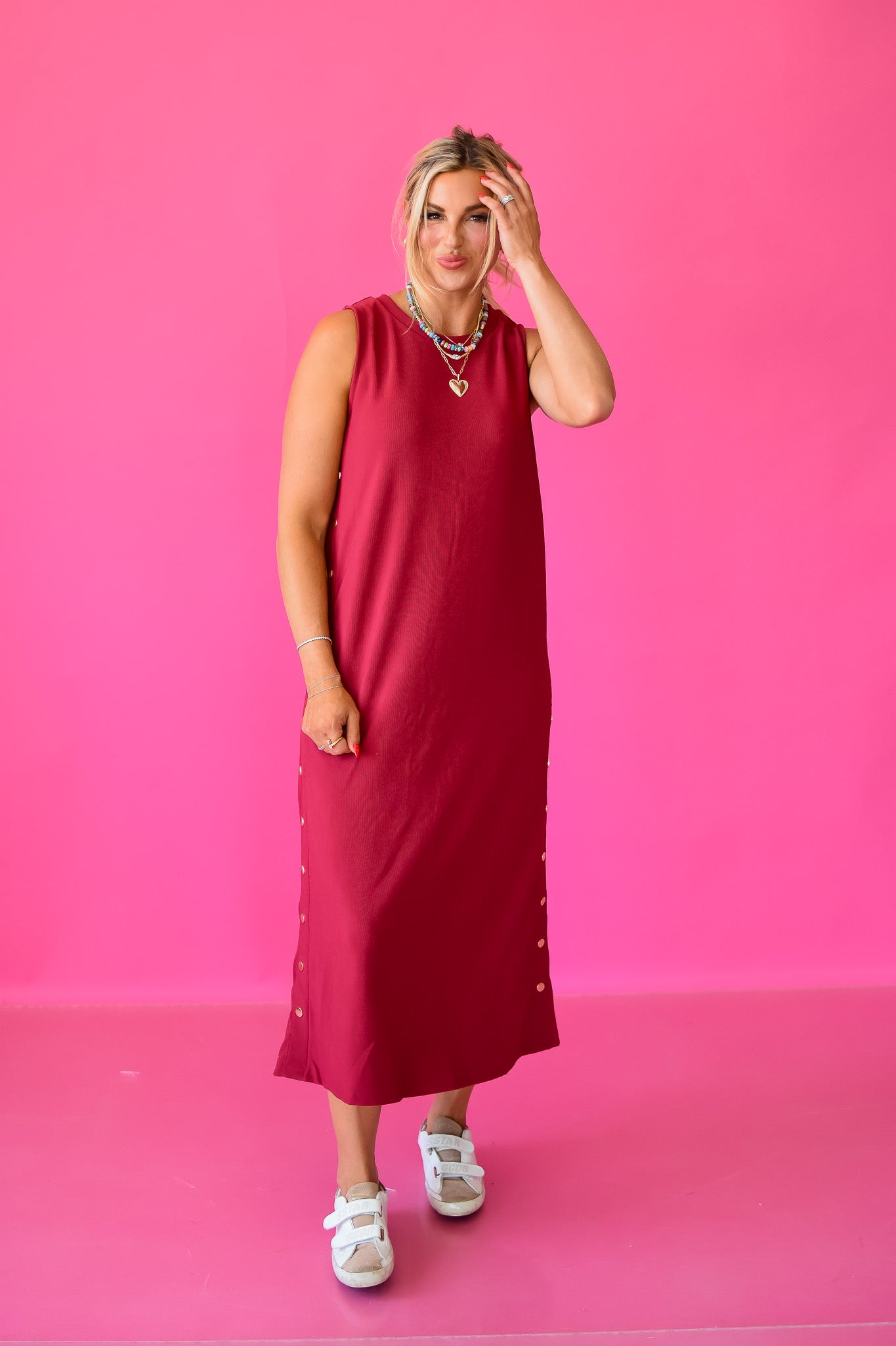 Fall’s favorite just got even better! The Giana Midi Dress in Dark Cherry features a stunning new hue, complete with gorgeous gold studs and a stylish side back slit for effortless slipping on. Made from ribbed, stretchy fabric, this dress moves with you while keeping things cozy and chic. A must-have for your seasonal wardrobe refresh!
