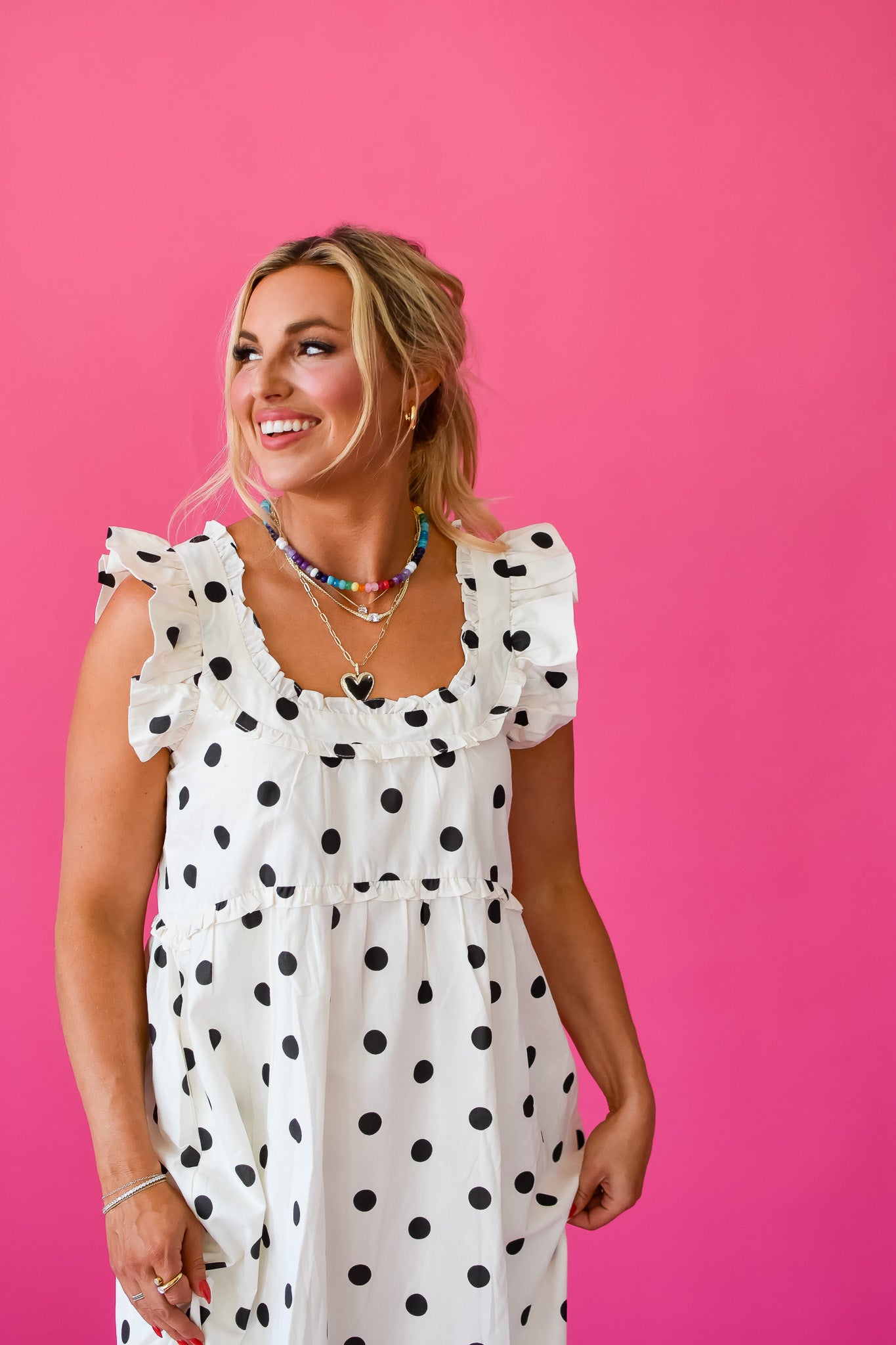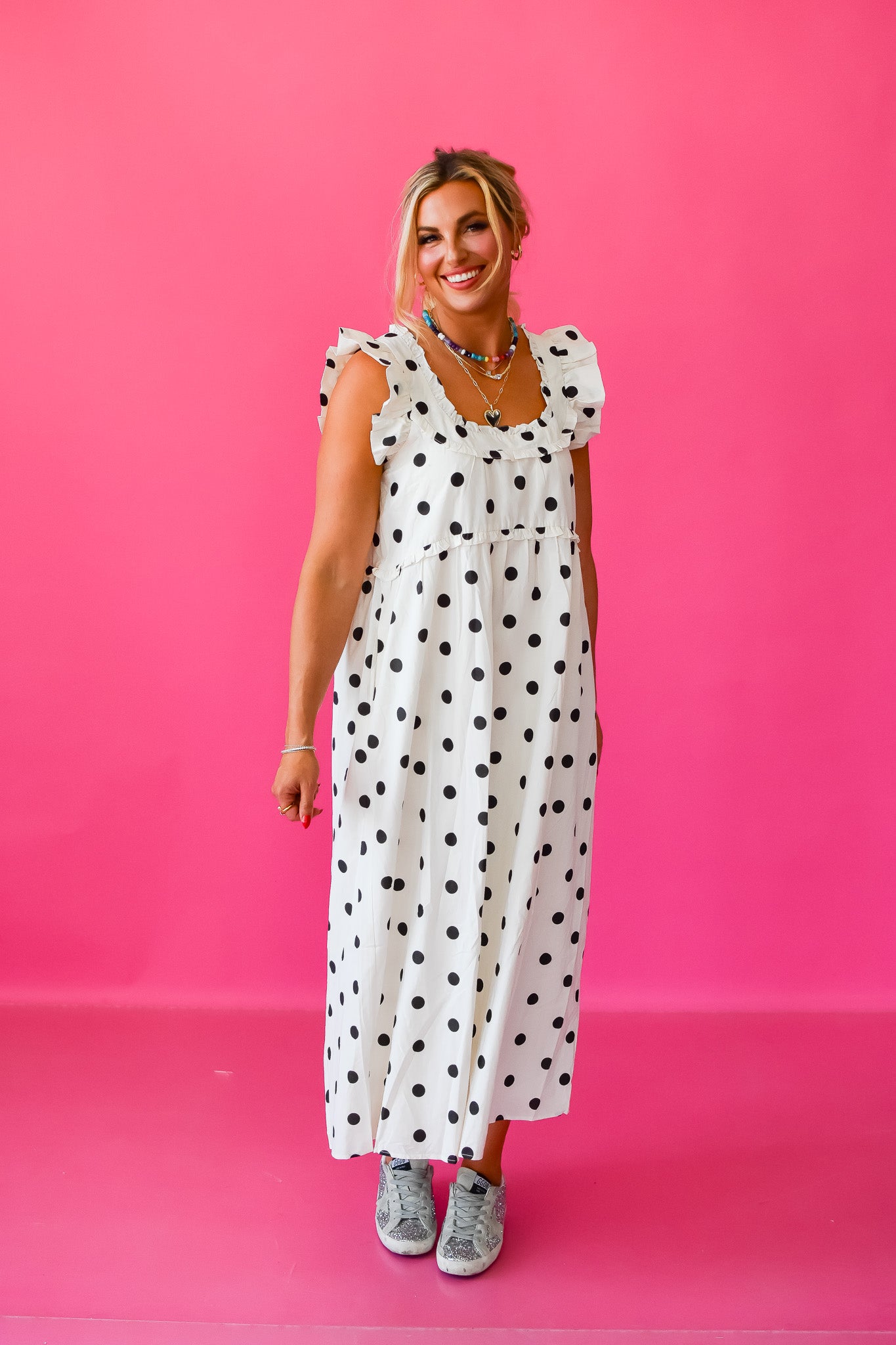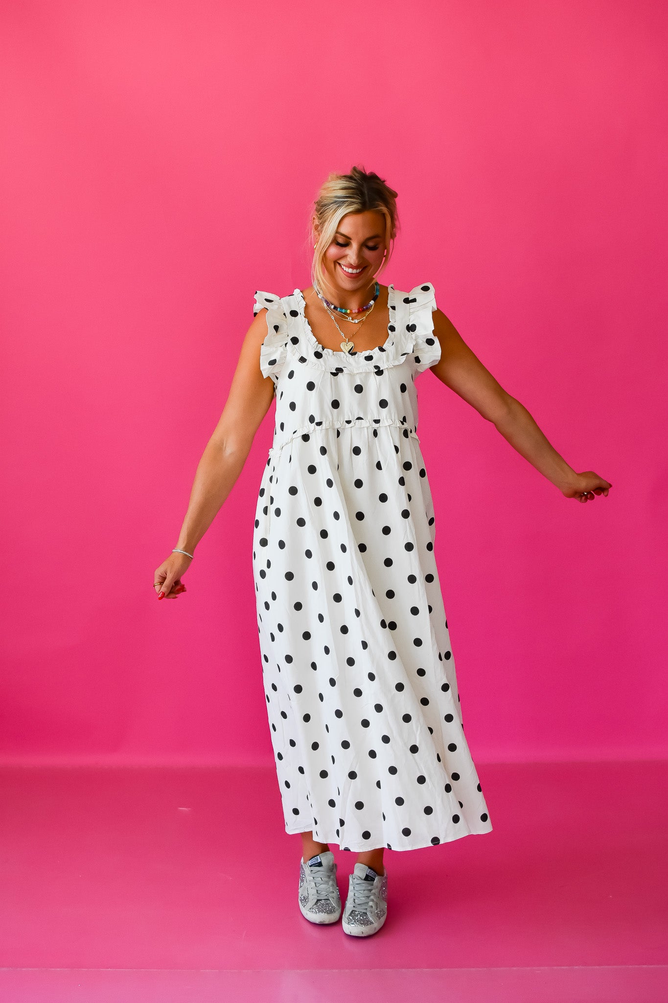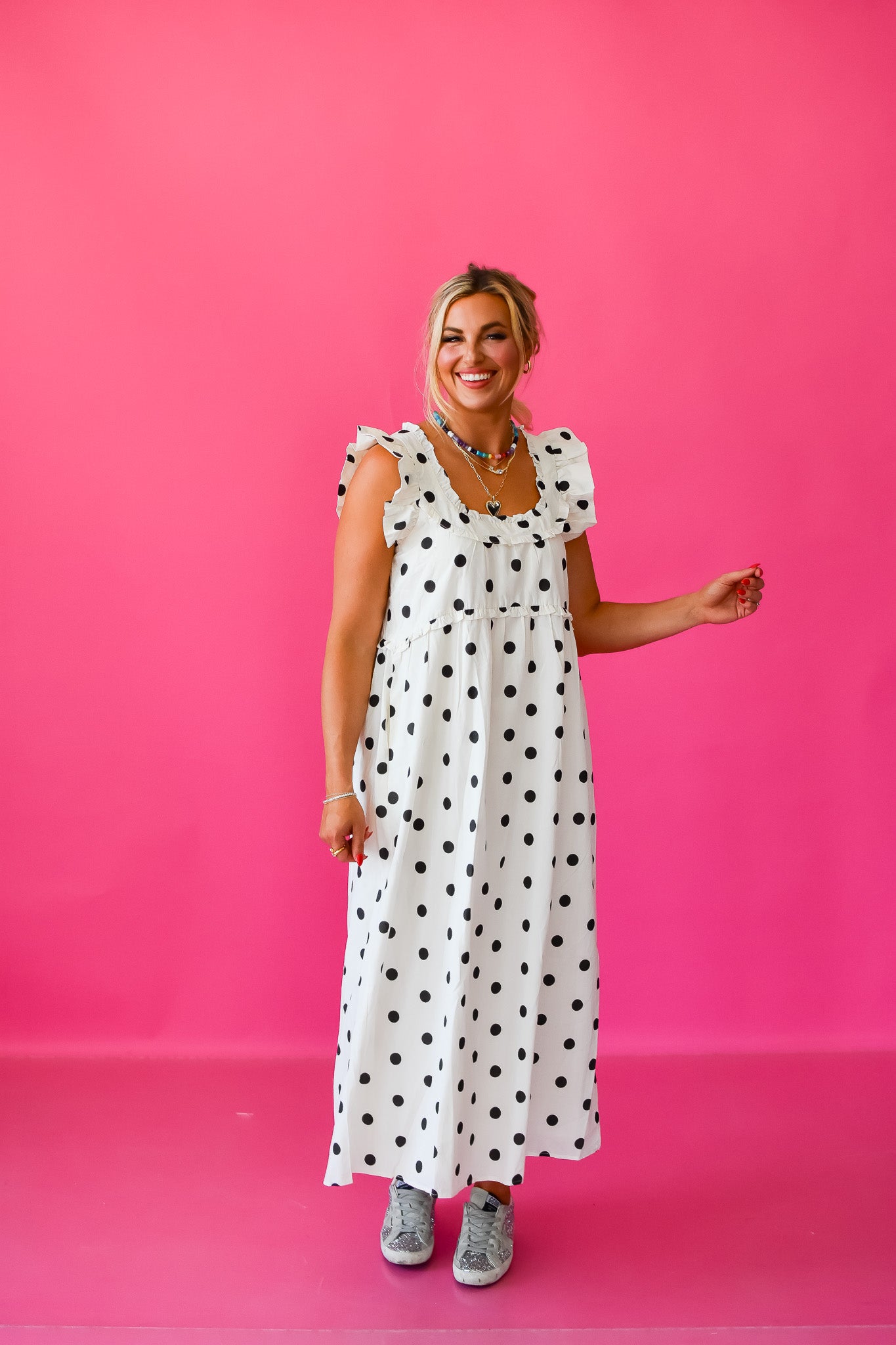 The Penelope Polka Dot Maxi Dress brings playful charm with its ivory and black polka dot pattern. Featuring a round neck, ruffle details, and handy pockets, this fully lined dress is both stylish and comfortable. The darling back tie adds a flirty touch, while the relaxed fit pairs perfectly with sandals or sneakers for an easygoing, casual vibe.
