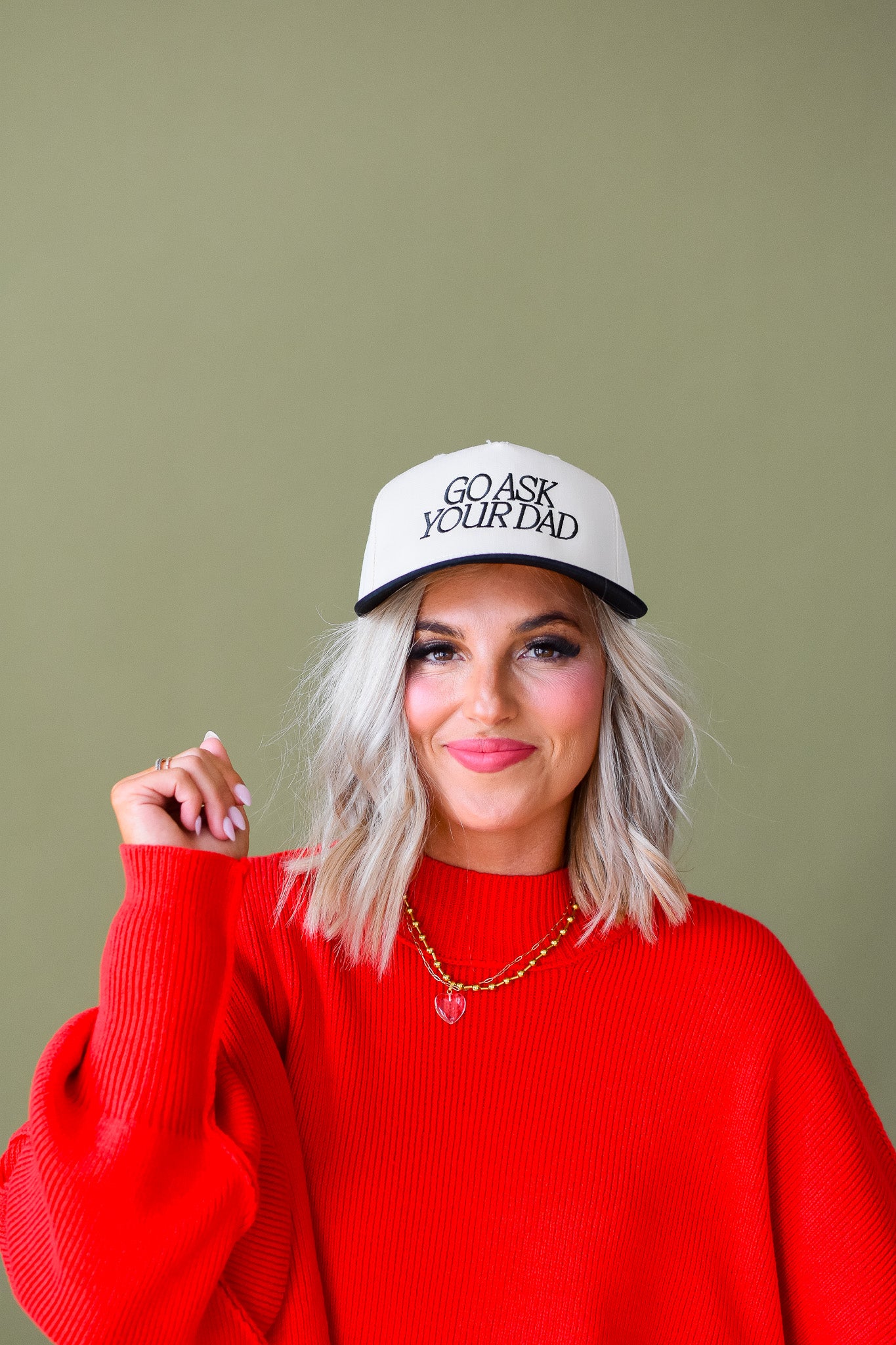 Get ready to rock your retro style with the Go Ask Your Dad Vintage Trucker Hat! Featuring a black and cream canvas design with a playful "go ask your dad" embroidery, this hat adds a touch of fun to any outfit. Perfect for showing off your quirky personality and effortlessly cool vibes.