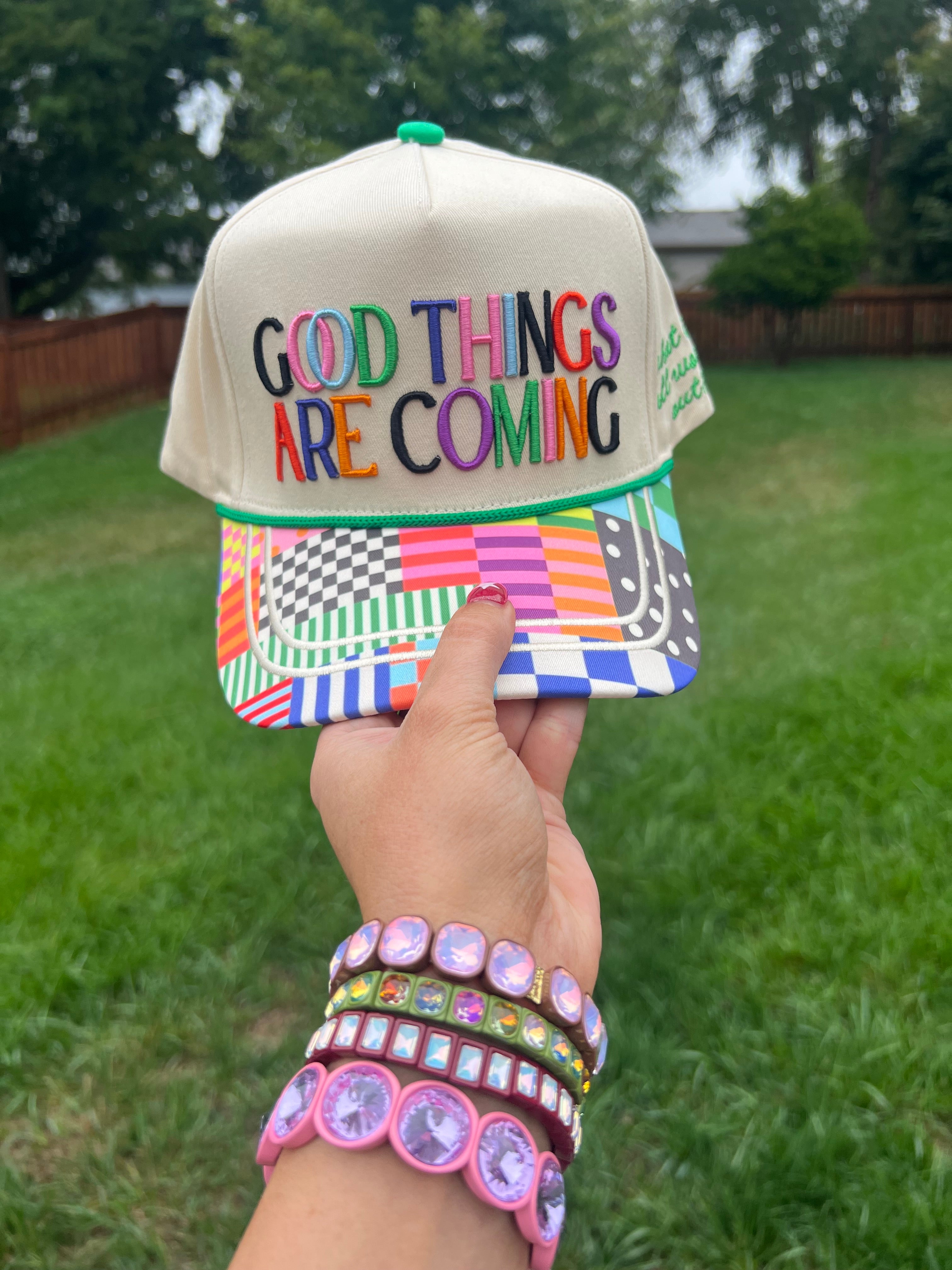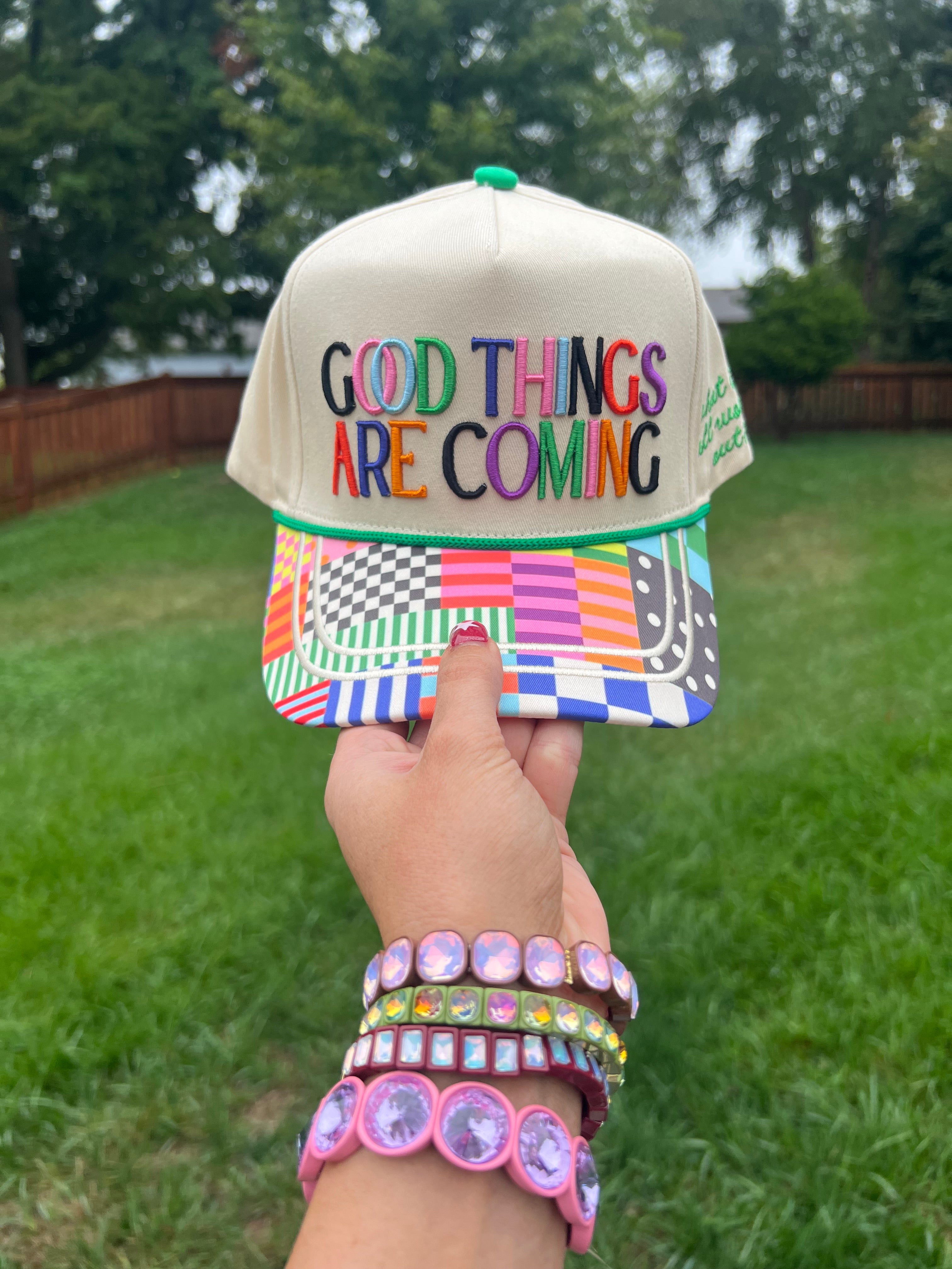 Brighten your day with the Good Things Are Coming Trucker Hat! This playful accessory features vibrant multi-colored embroidery and a fun mix print brim with a side detail that adds personality to every outfit. Perfect for adding a splash of color and good vibes wherever you go.