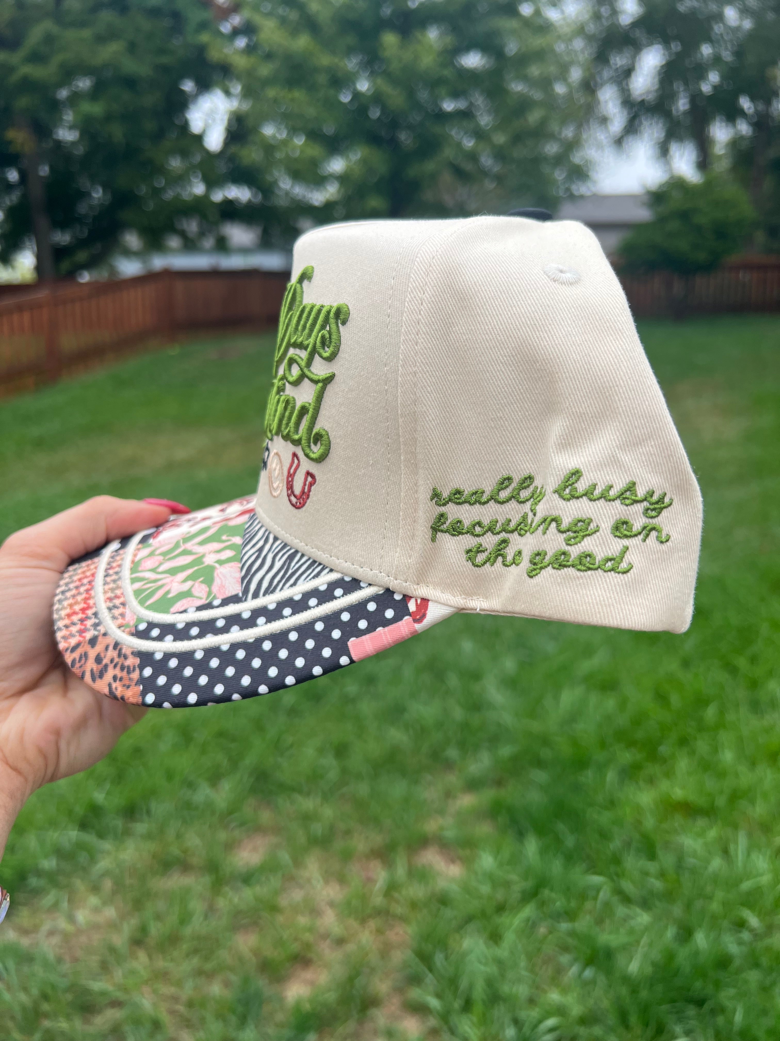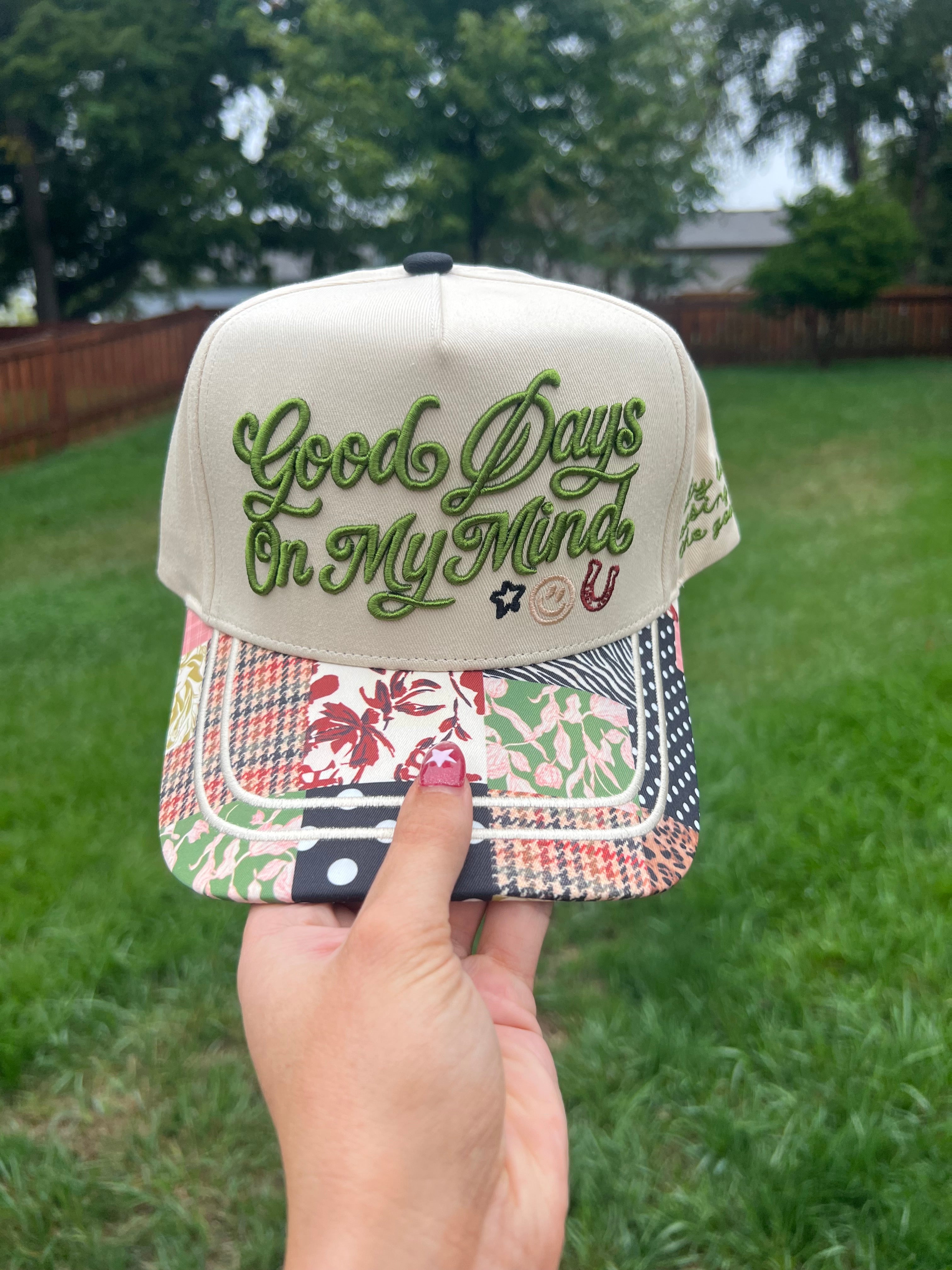 Embrace cozy vibes with the Good Days On My Mind Trucker Hat. Showcasing warm fall hues in an embroidered design, this playful hat features a mix print brim and a charming side detail that makes it stand out. Perfect for keeping good thoughts—and style—front and center all season long.