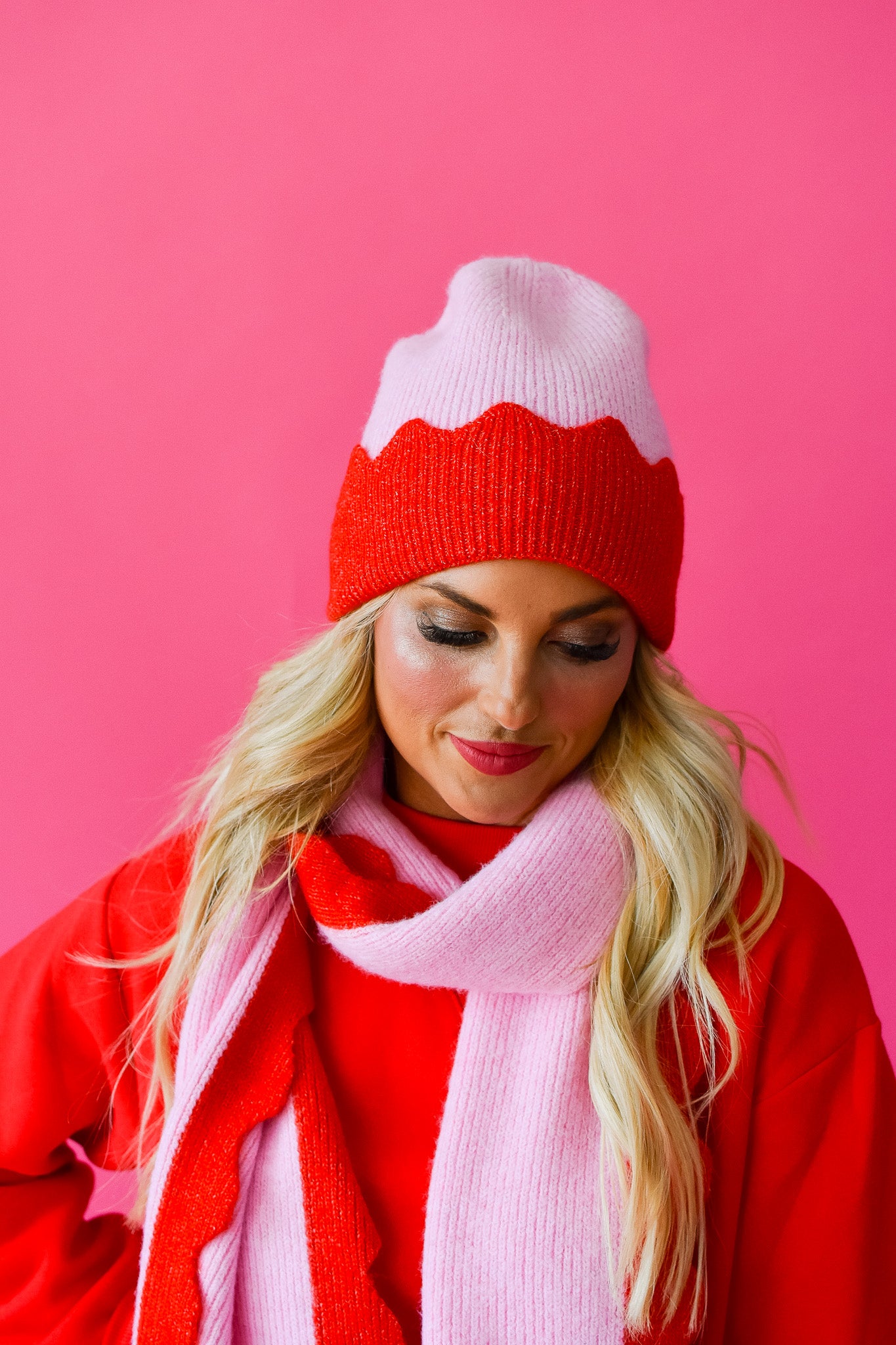 Wrap yourself in holiday warmth with the Melody Beanie, featuring a charming pink and red scalloped design that's impossibly soft and cozy. Perfect for chilly winter days and festive celebrations, this beanie delivers comfort without compromise. The playful color combo brings a pop of personality to any cold-weather outfit, while the plush fabric keeps you snug from first frost through spring thaw. Your new winter essential awaits!