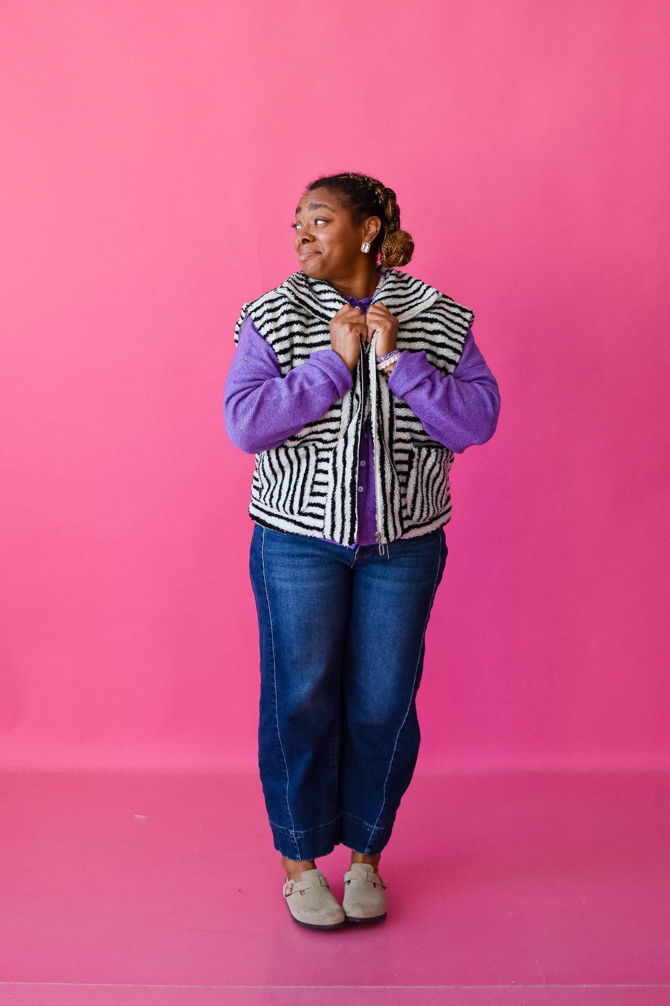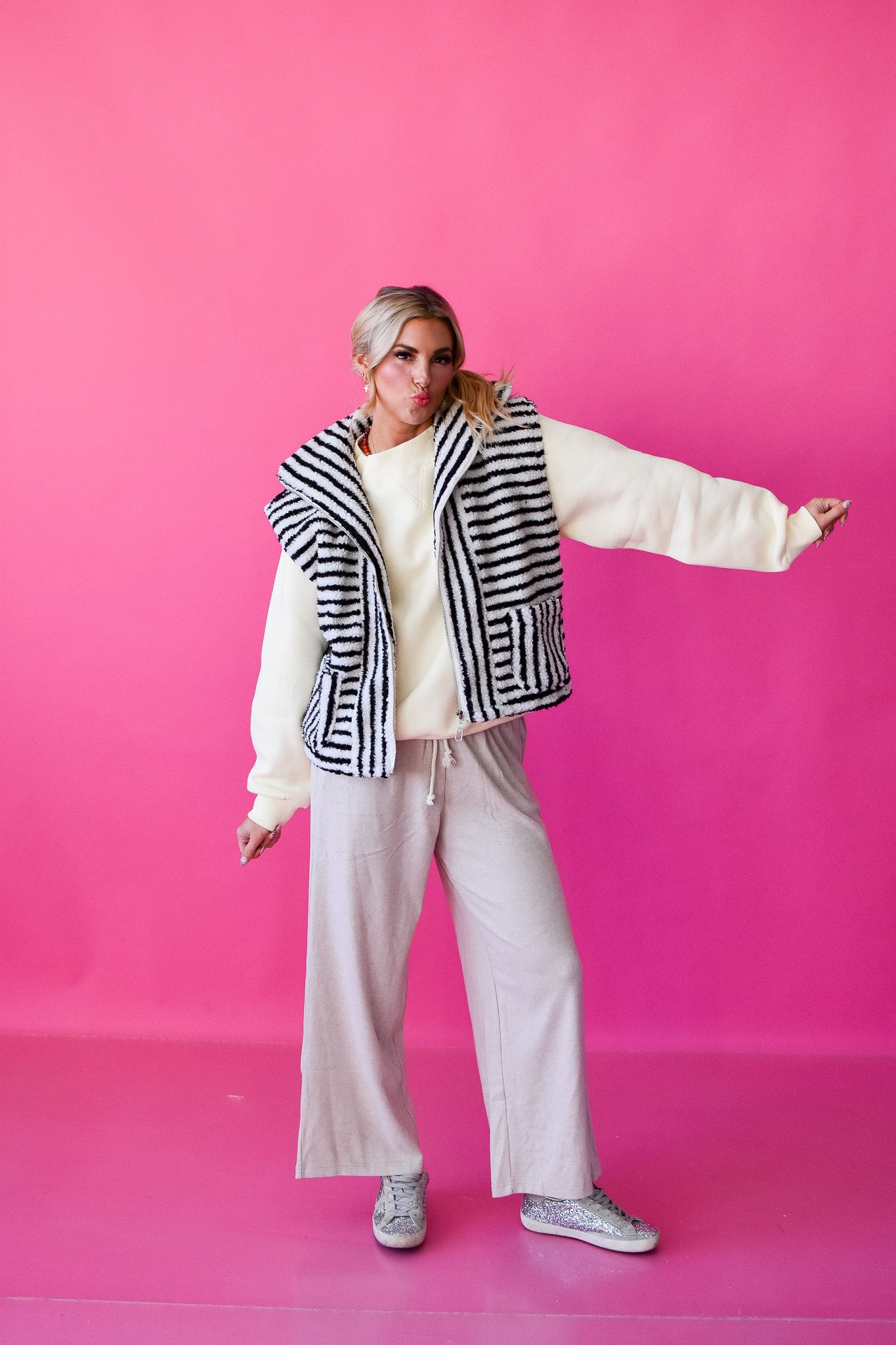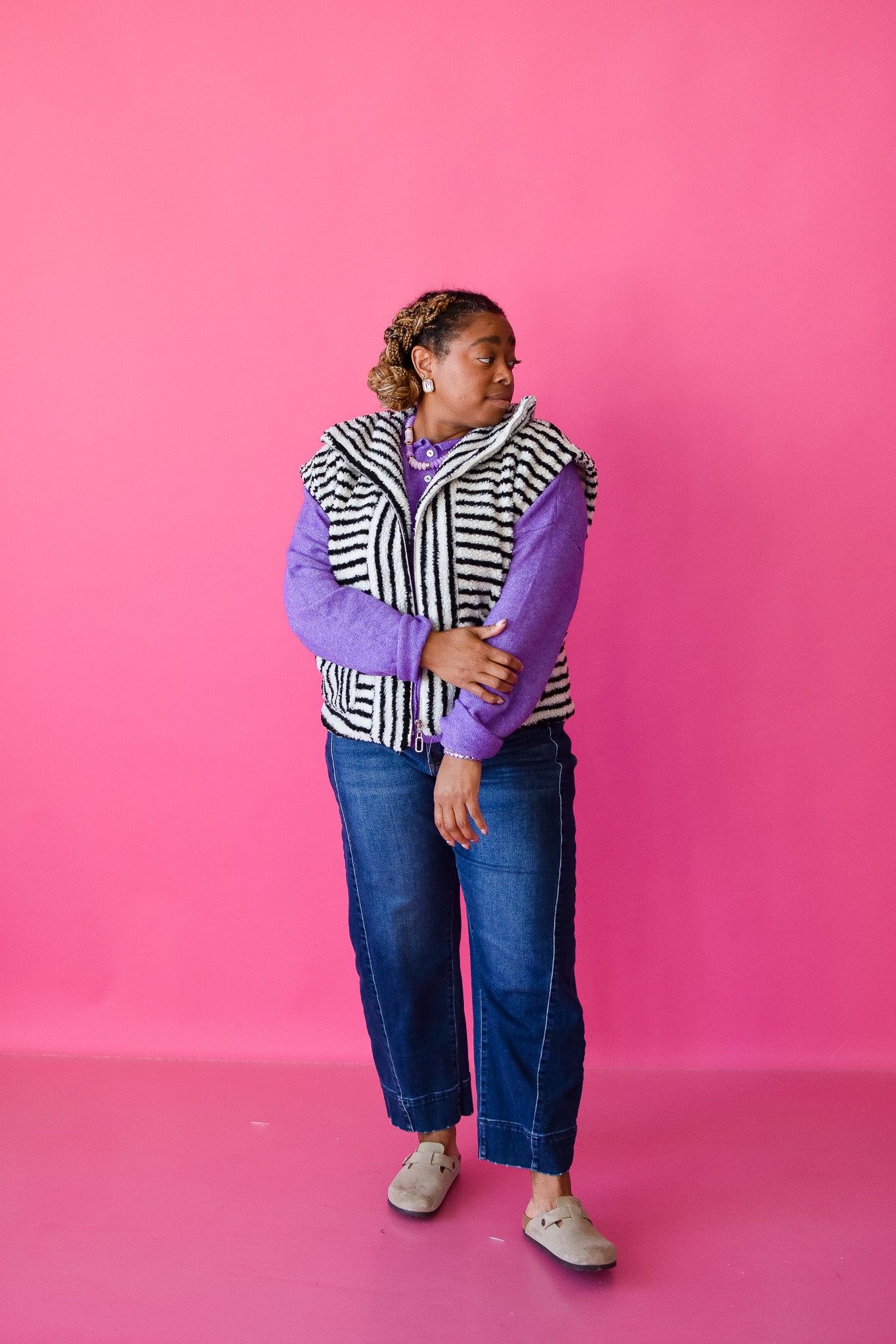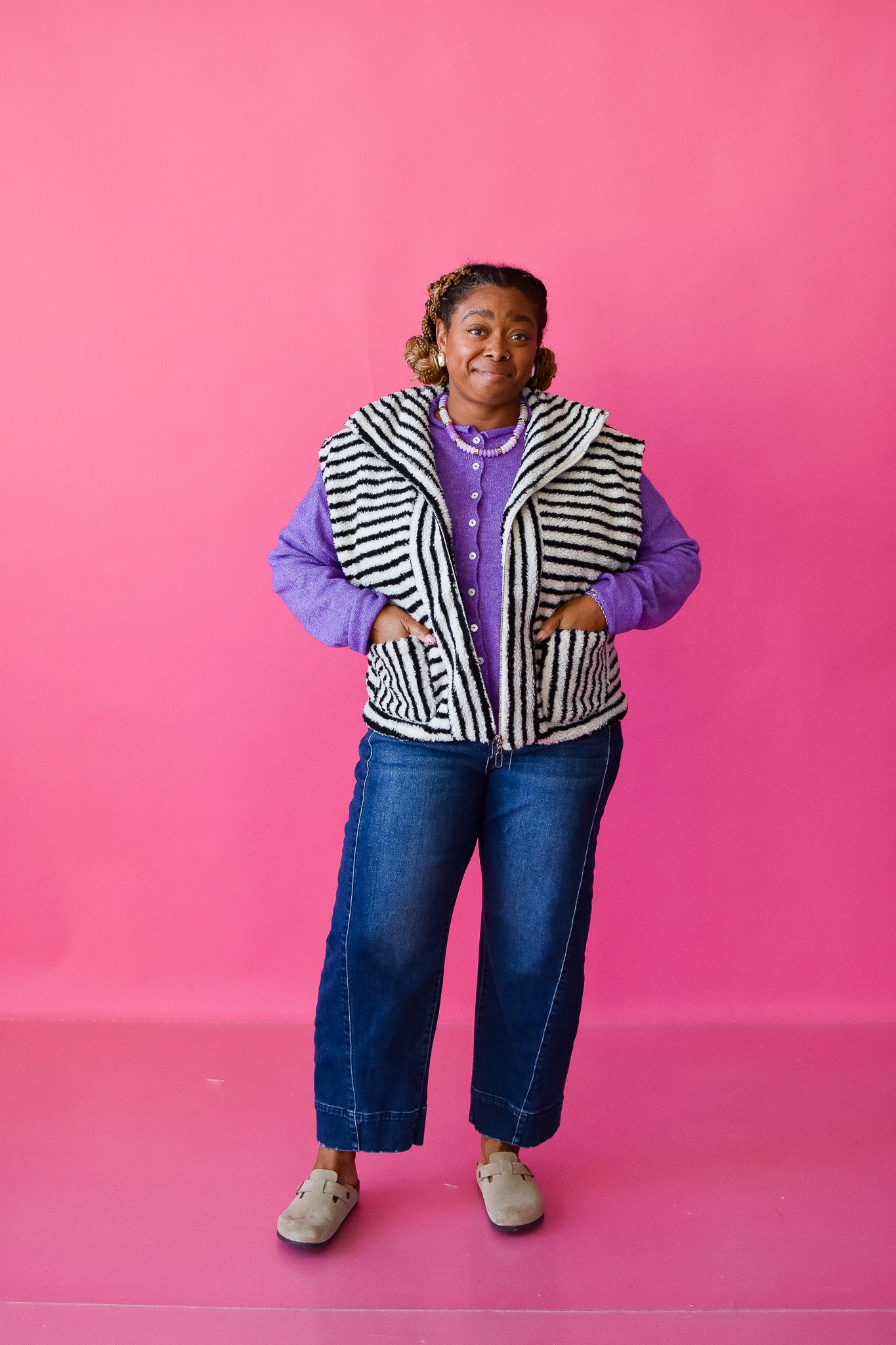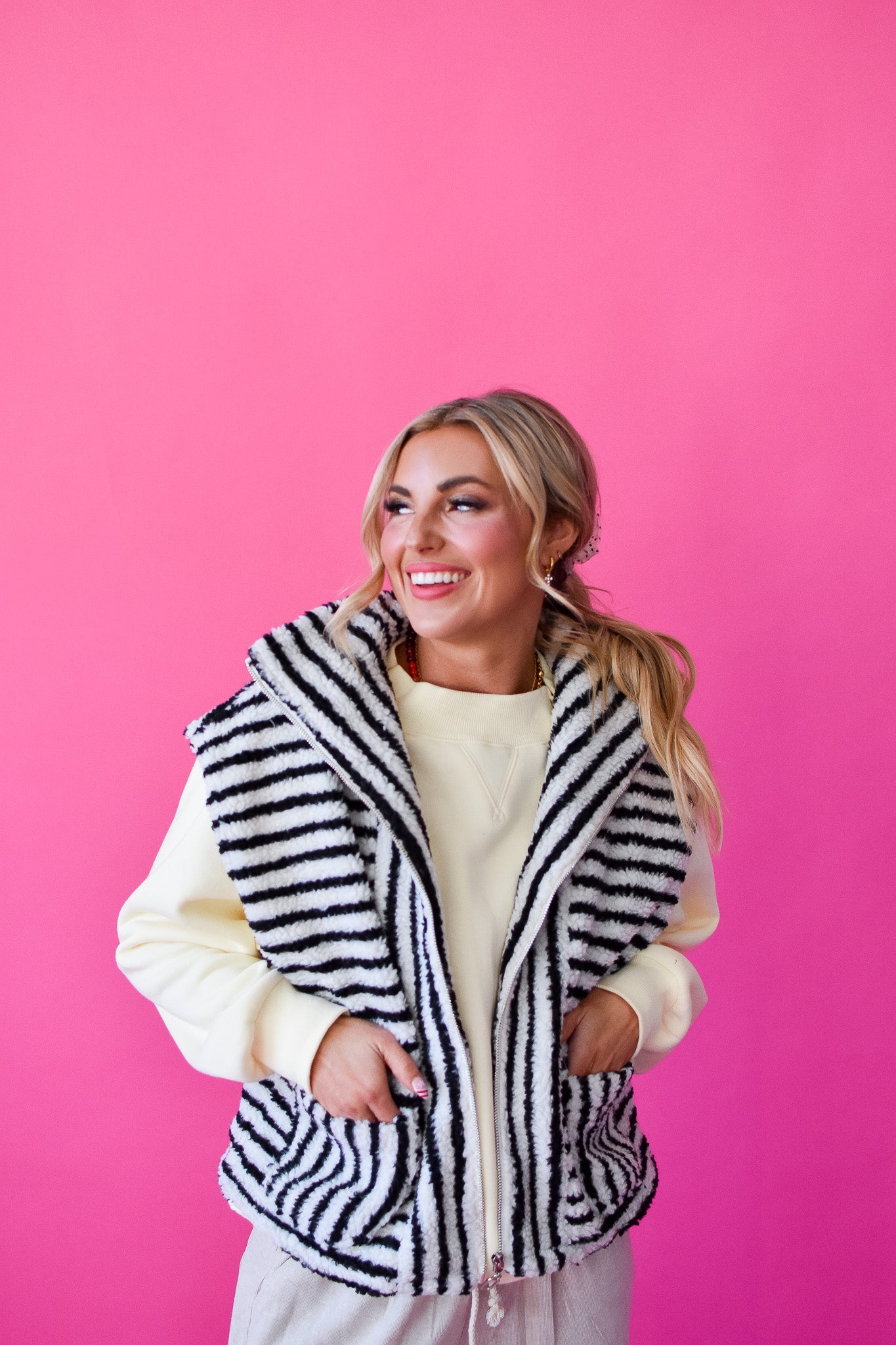 Layer up with cozy vibes in this Iris Sherpa Vest, featuring a black and white stripe pattern that's anything but boring. The soft sherpa keeps you warm and snuggly, while the convenient front zipper makes it easy to slip on and off. Practical front pockets are perfect for stashing your essentials—or just keeping your hands toasty. Whether you're lounging at home or running errands, this striped wonder adds instant comfort and charm to any outfit.
