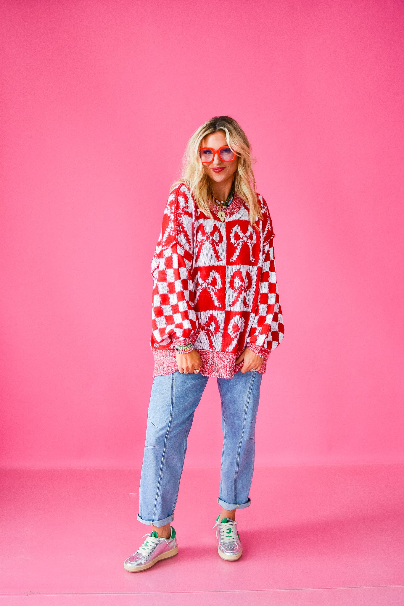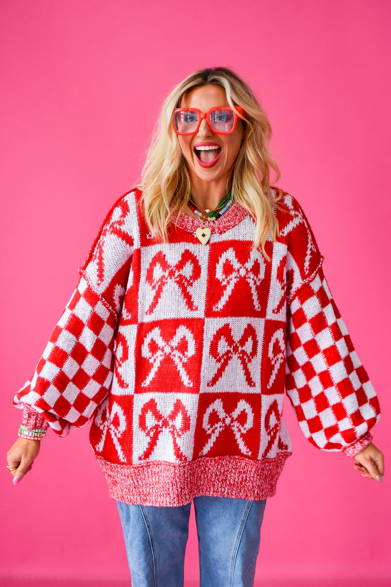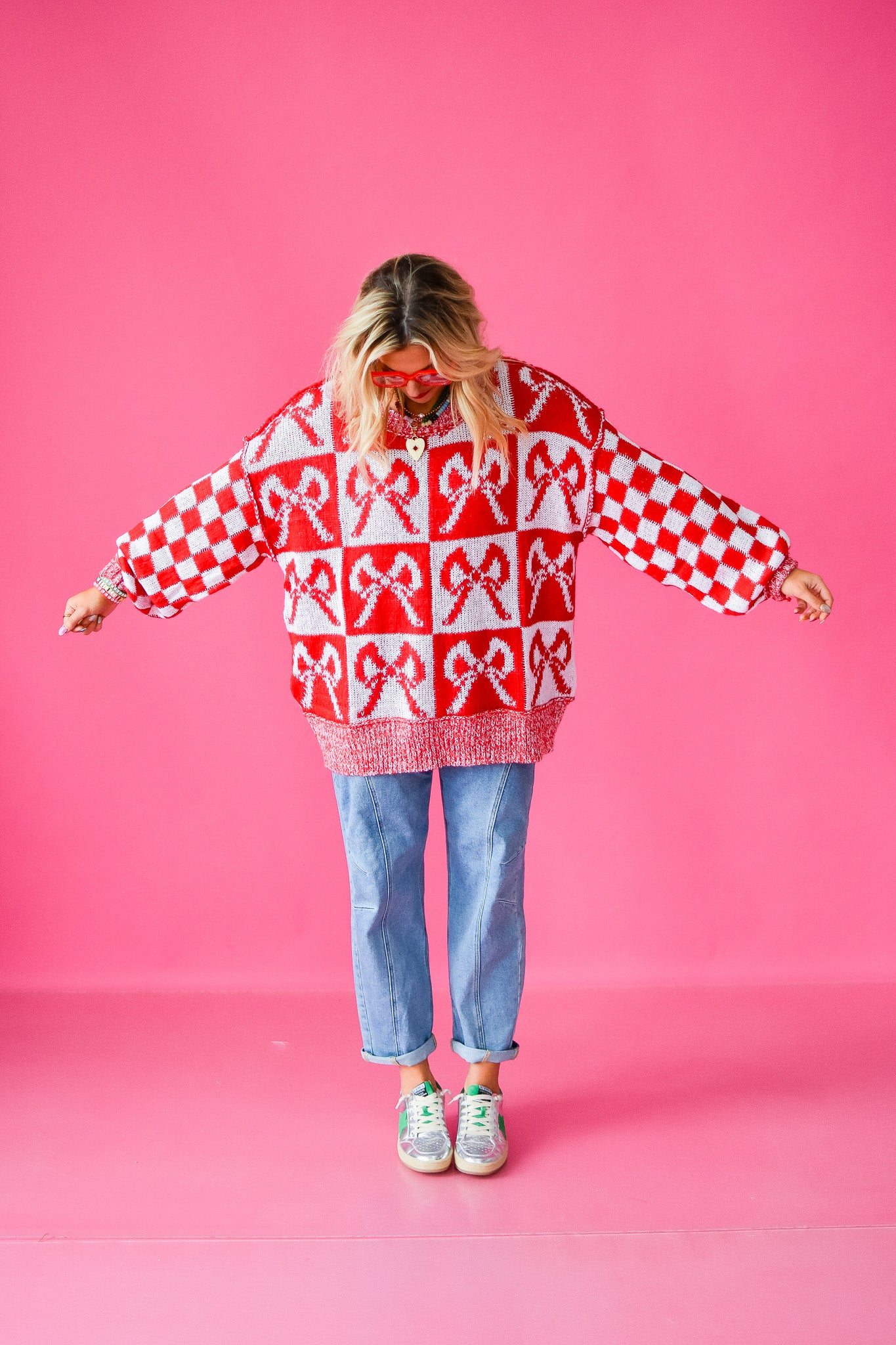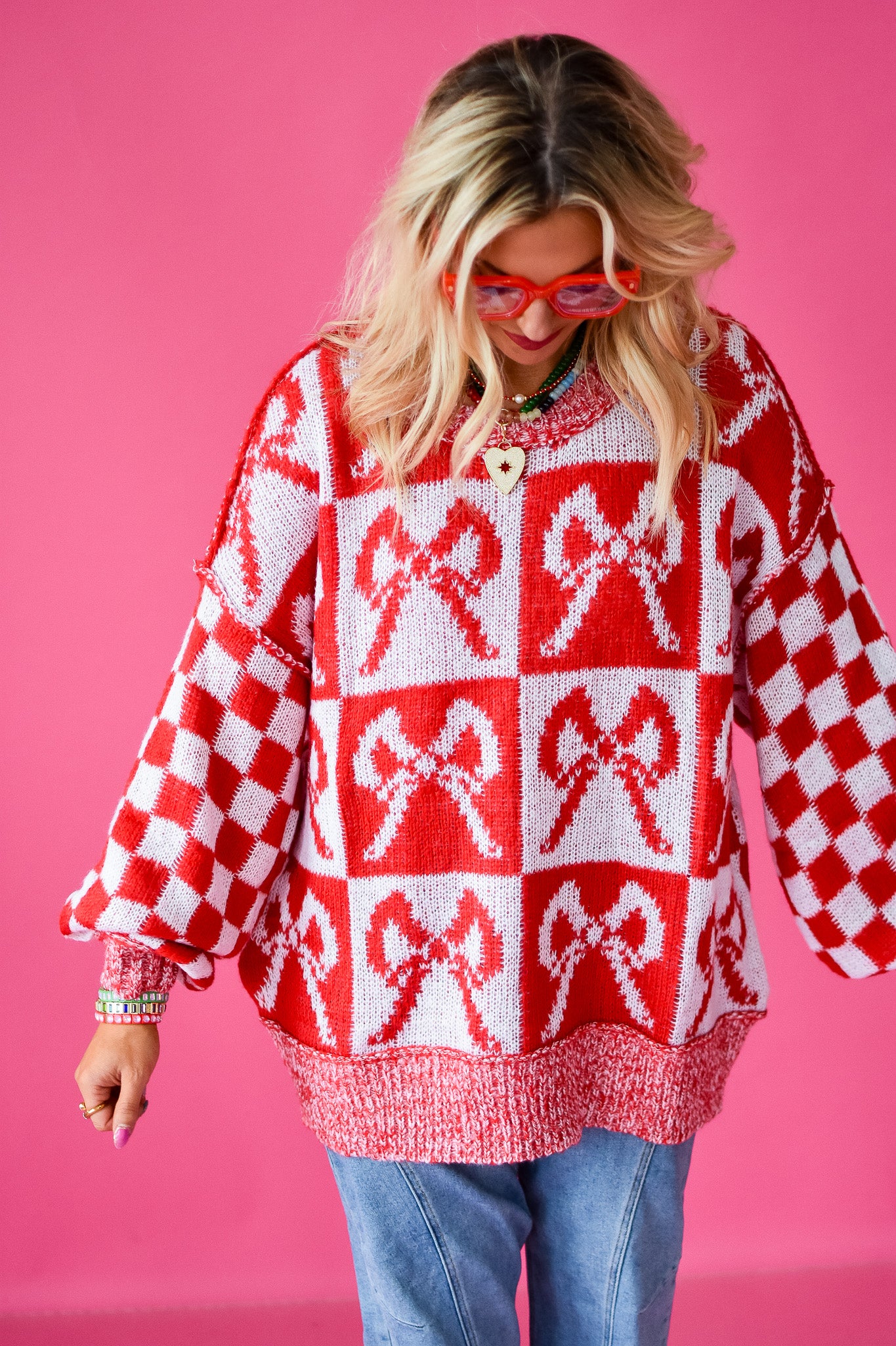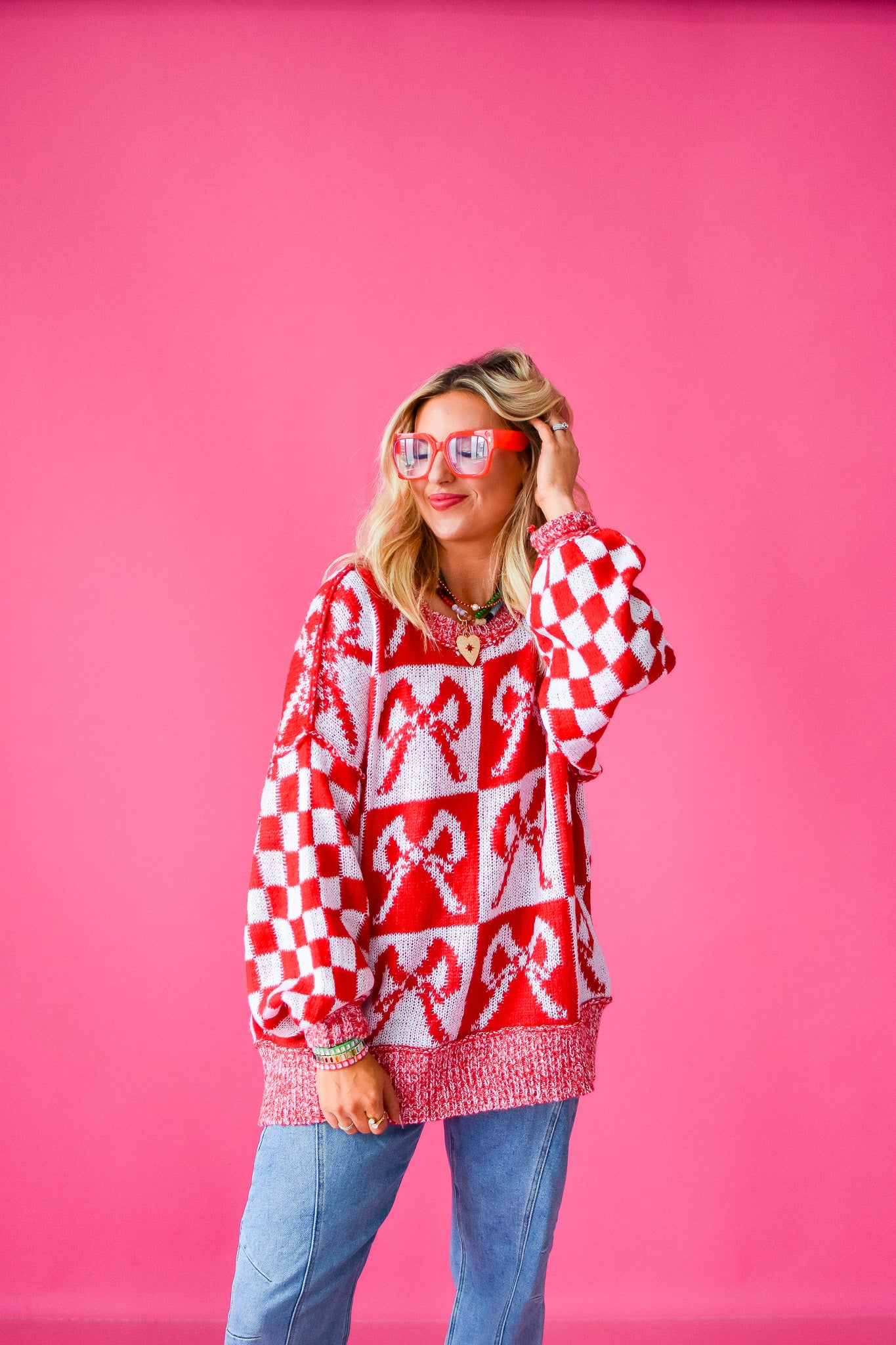Get ready to turn heads in this Checkered Bow Oversized Sweater! The playful red and white checkered bow adds a fun pop to your cozy knit, making it perfect for laid-back days. Pair it with your favorite jeans or leggings for a relaxed, stylish vibe that keeps comfort front and center.