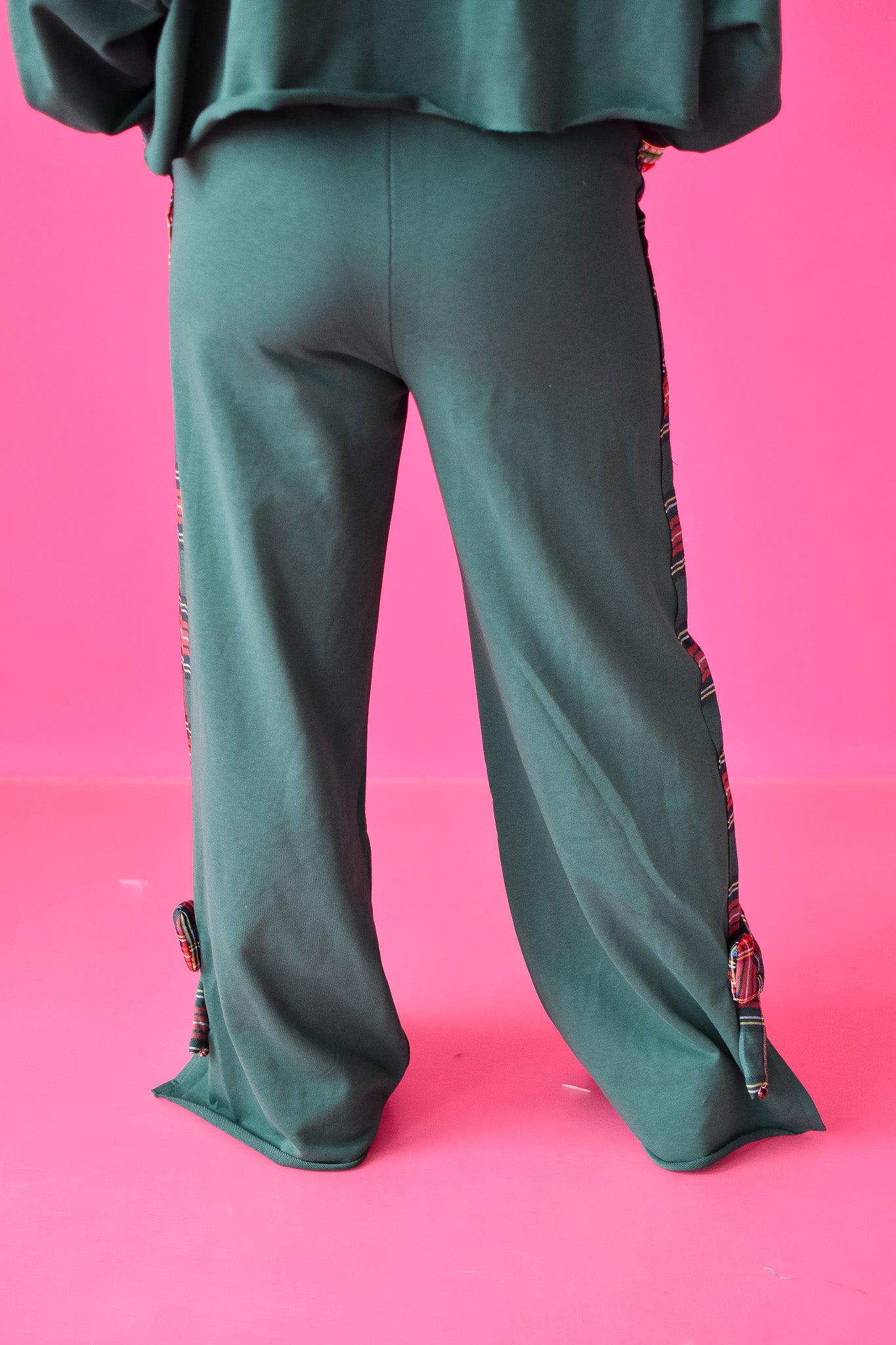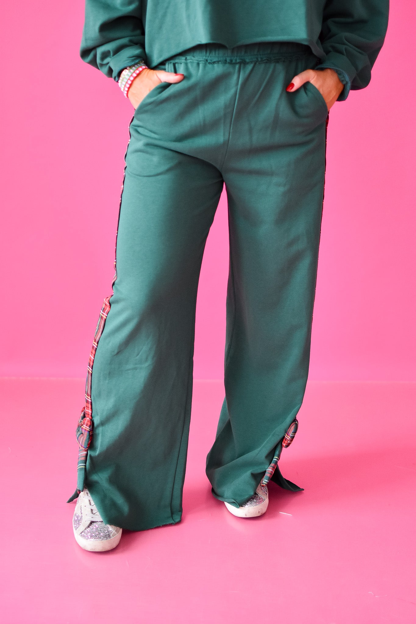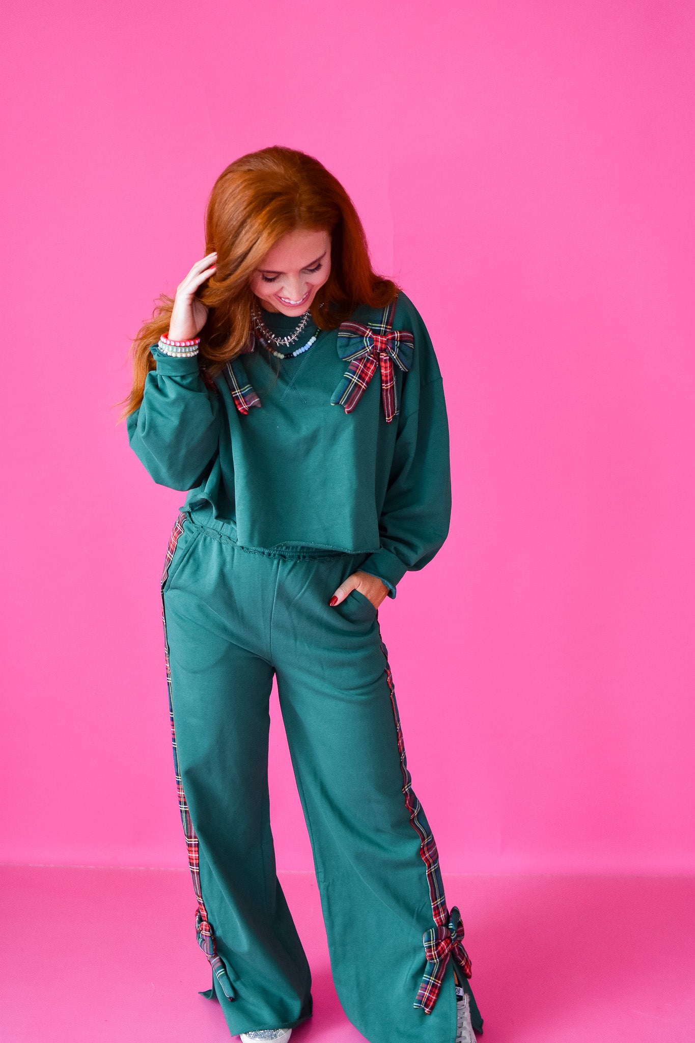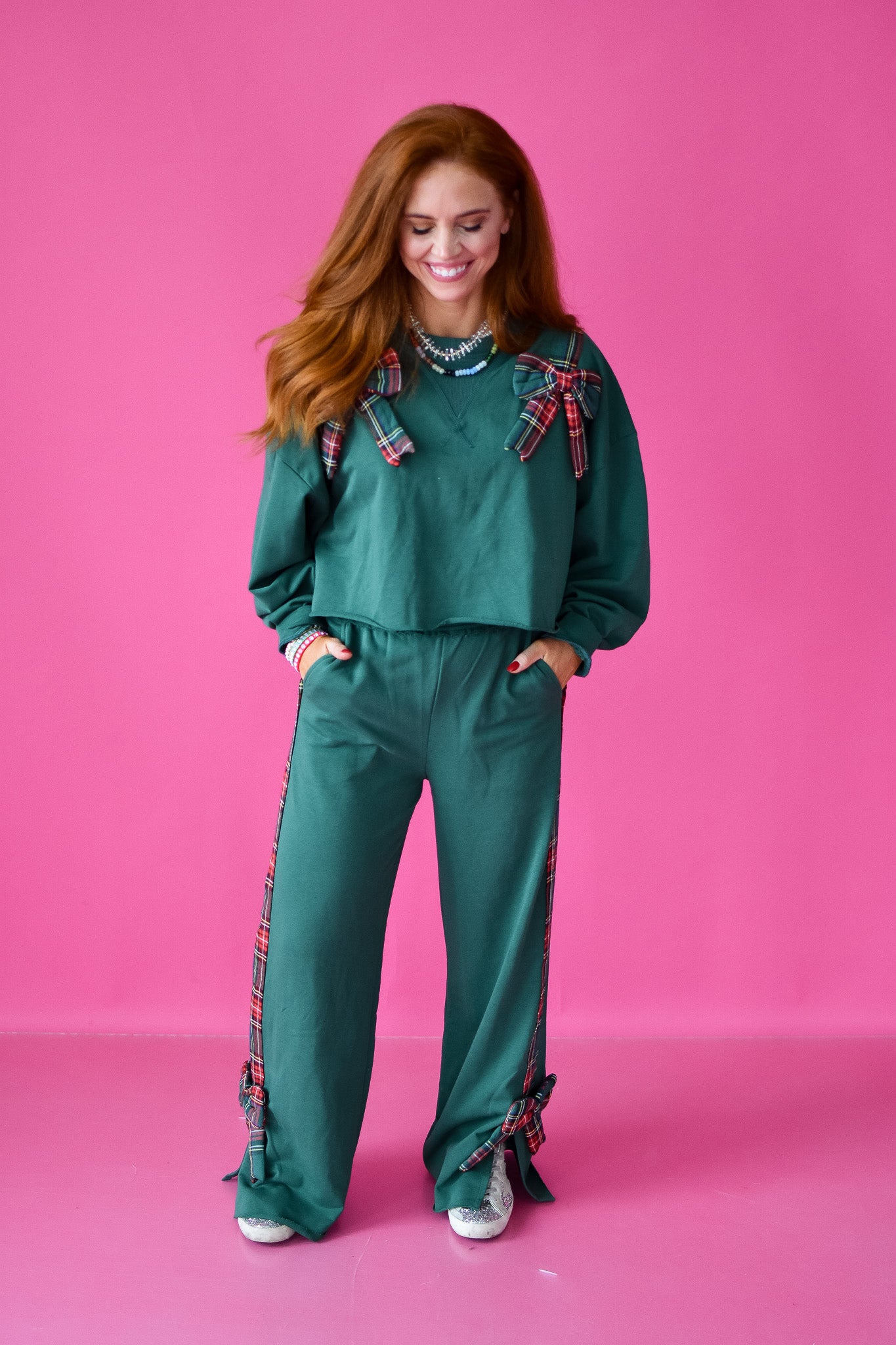 This dark green lounge set brings cozy comfort with a playful twist. Featuring a slightly cropped, boxy top, it’s decorated with festive red Christmas plaid bows on the shoulders, matching the bow detail on the pant hems. The pants offer an elastic waist for easy wear, making this set perfect for relaxed days with a touch of holiday cheer.