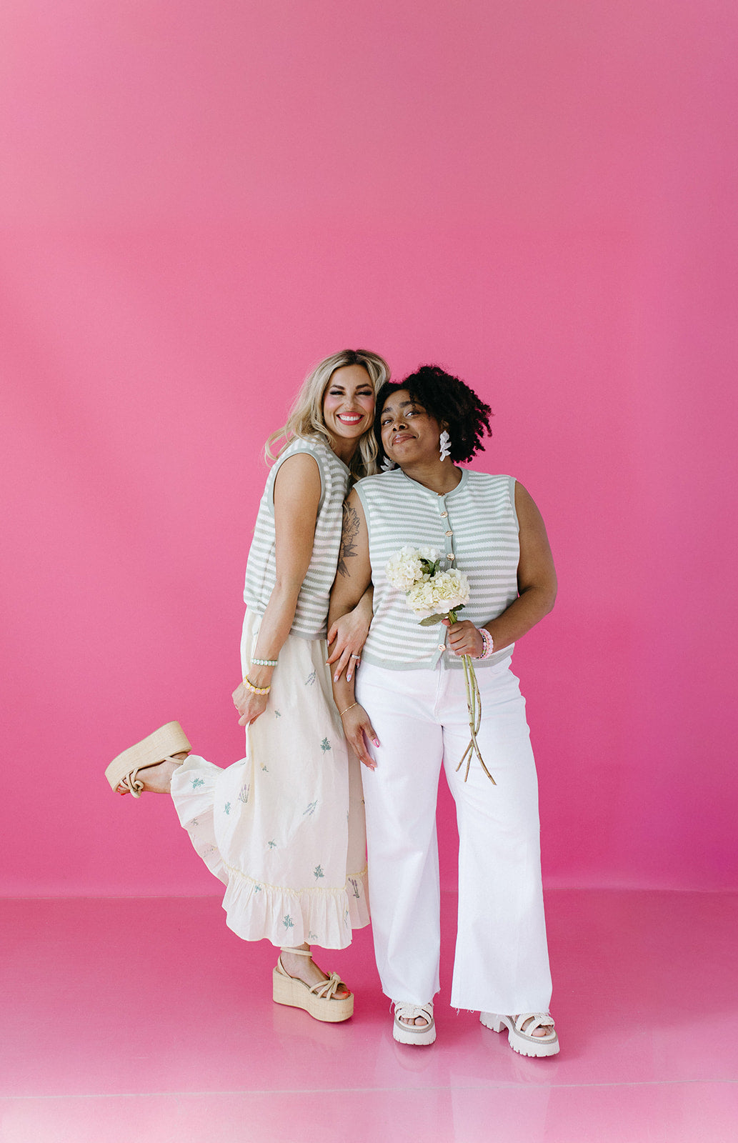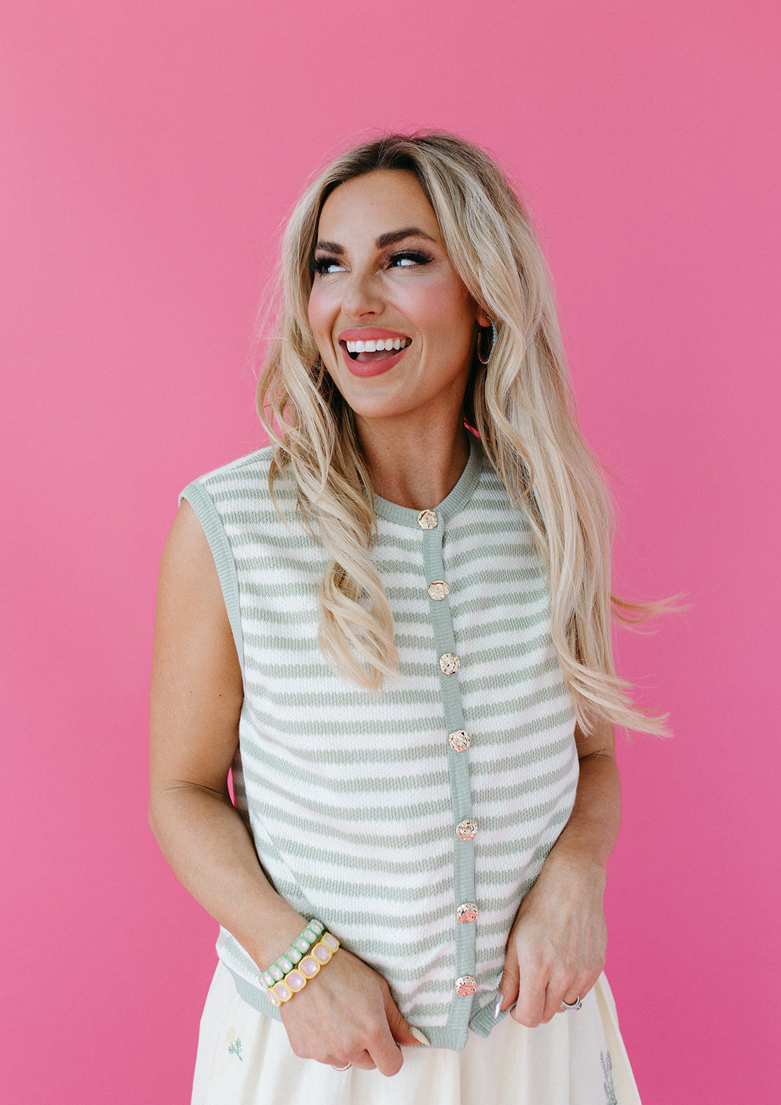 The Alma Stripe Sweater Vest in Mint is your go-to layering piece this season — soft, slightly cropped, and styled in a fresh sage green that pairs with just about everything in your closet. The waffle knit texture and brushed underside give it that cozy-meets-polished feel you'll want to reach for on repeat.