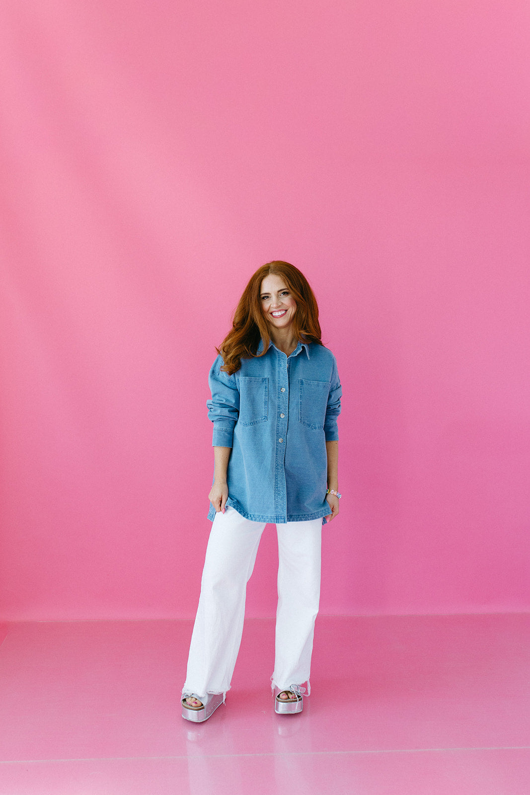 Runs oversized — true to size for a roomy, shacket-style fit. Size down if you prefer a more fitted look. Karley (5'5", 34A) and Ali (5'1", 34B) both wear a small.