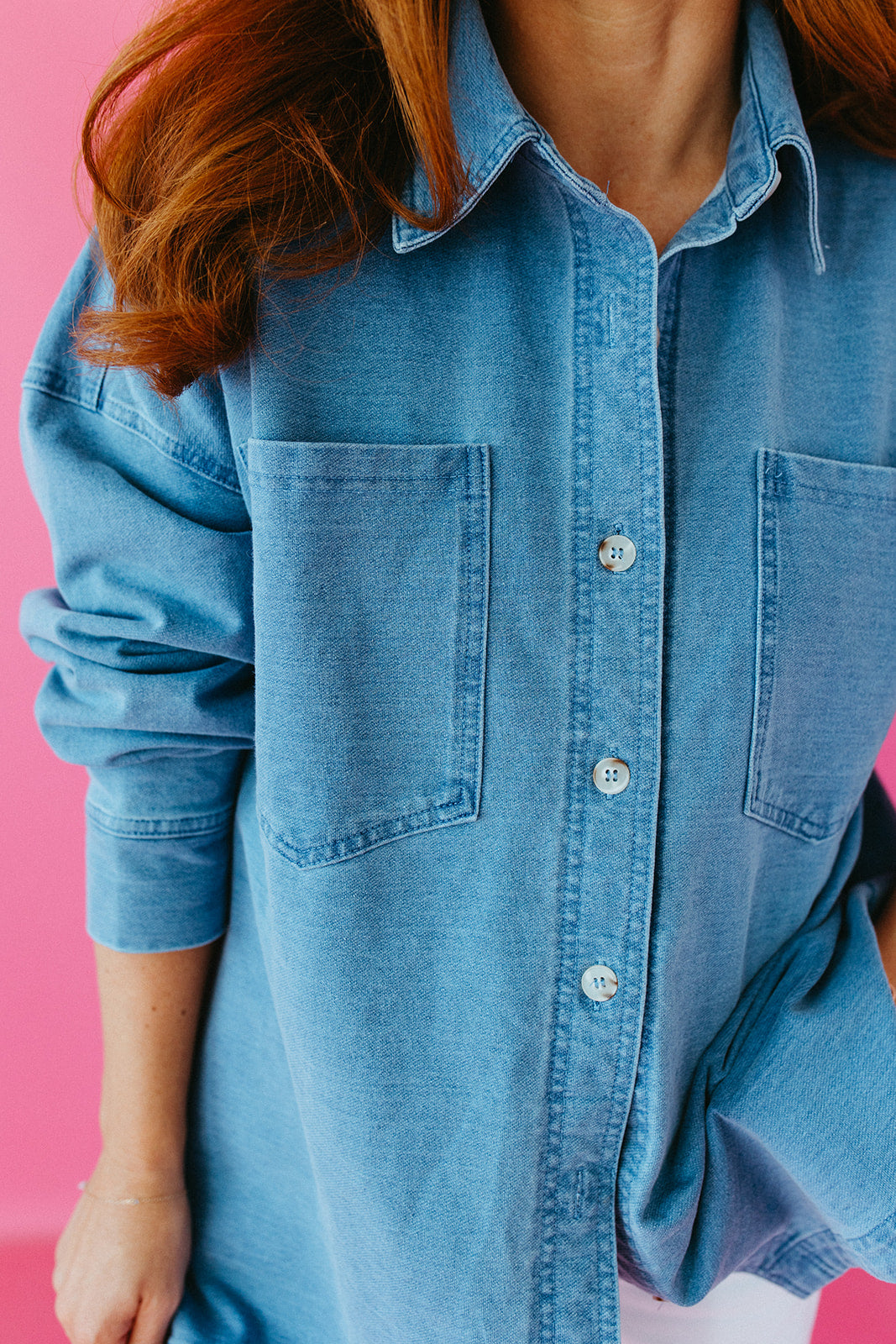 The Aria Washed Stretch Denim Jacket is the effortless layering piece your wardrobe has been waiting for. With its oversized, shacket-inspired silhouette, soft washed denim, and functional buttons and front pockets, it's the kind of jacket you'll reach for morning after morning — whether you're layering it over a dress or throwing it on with jeans.