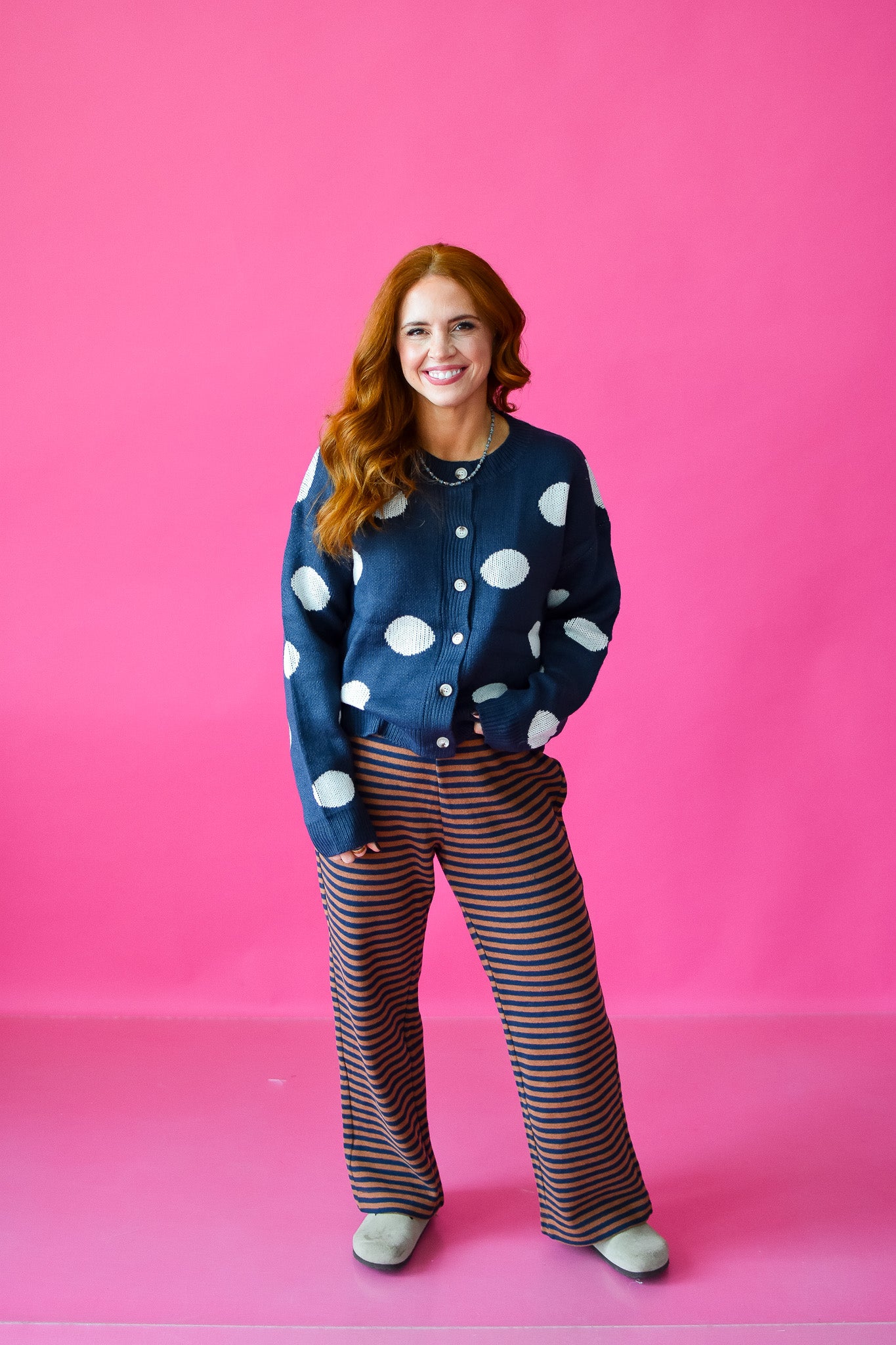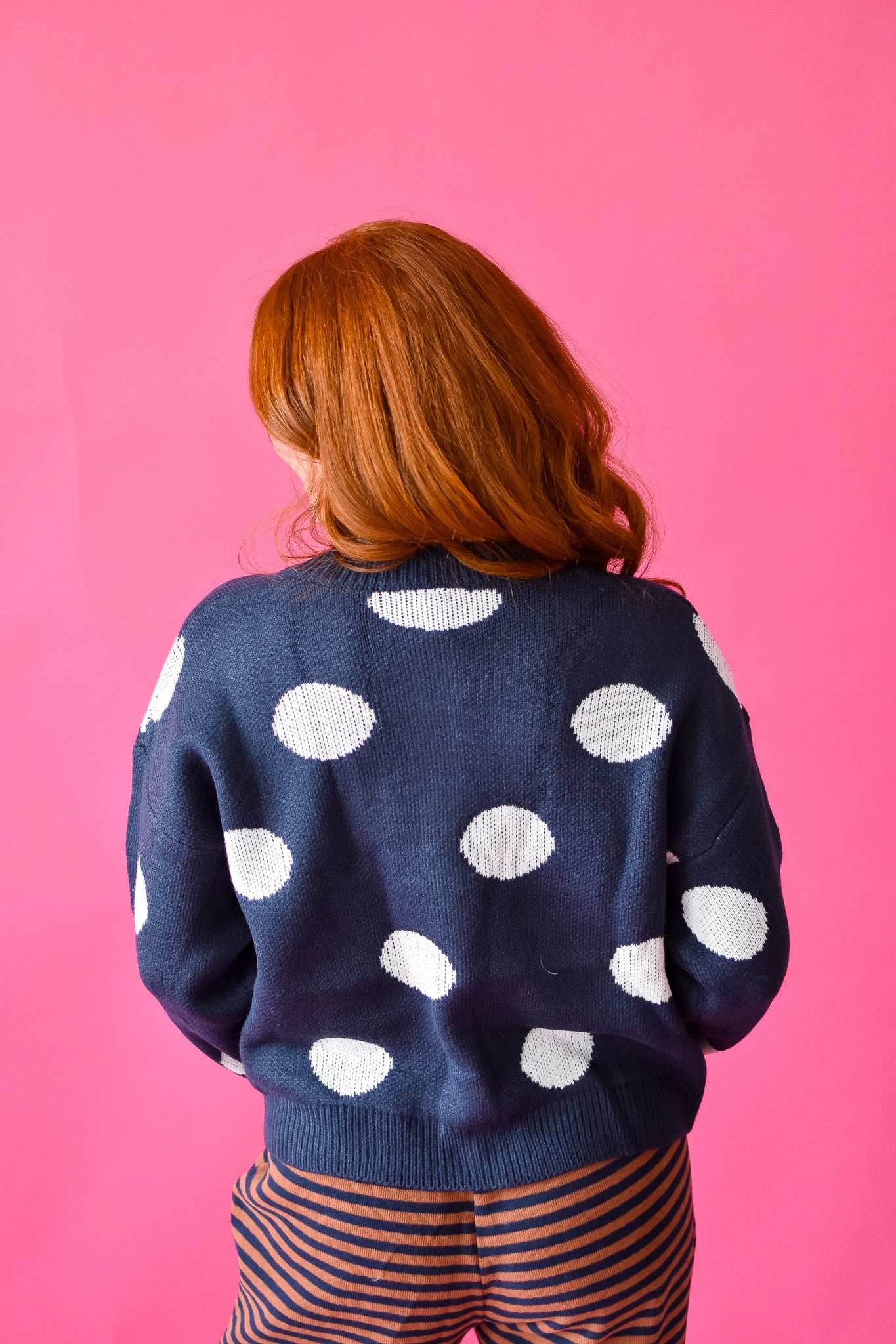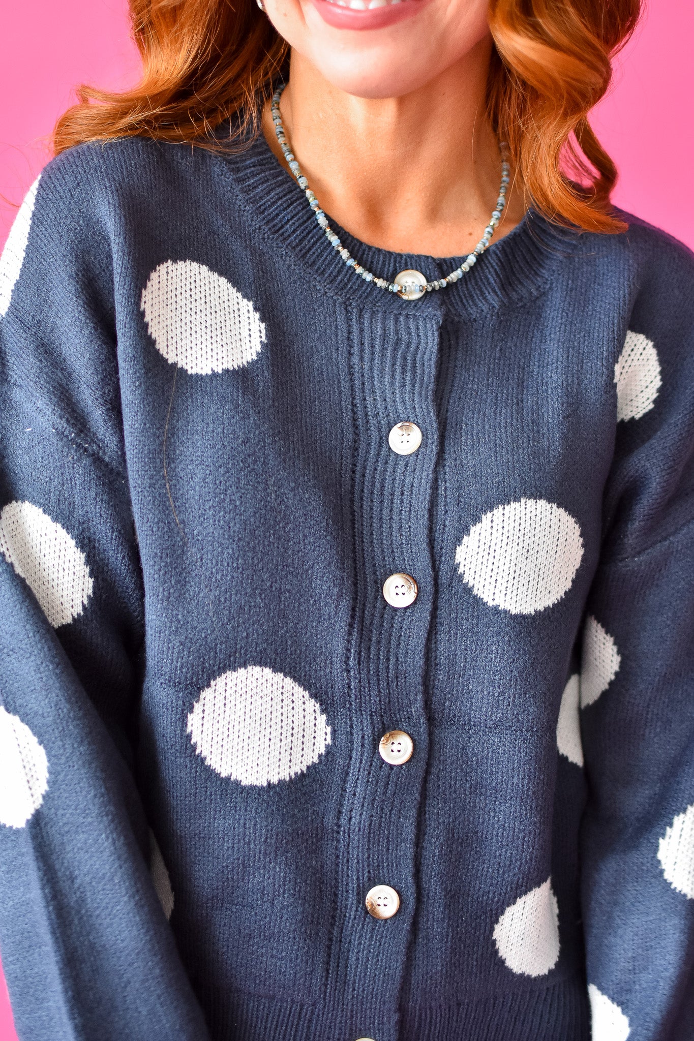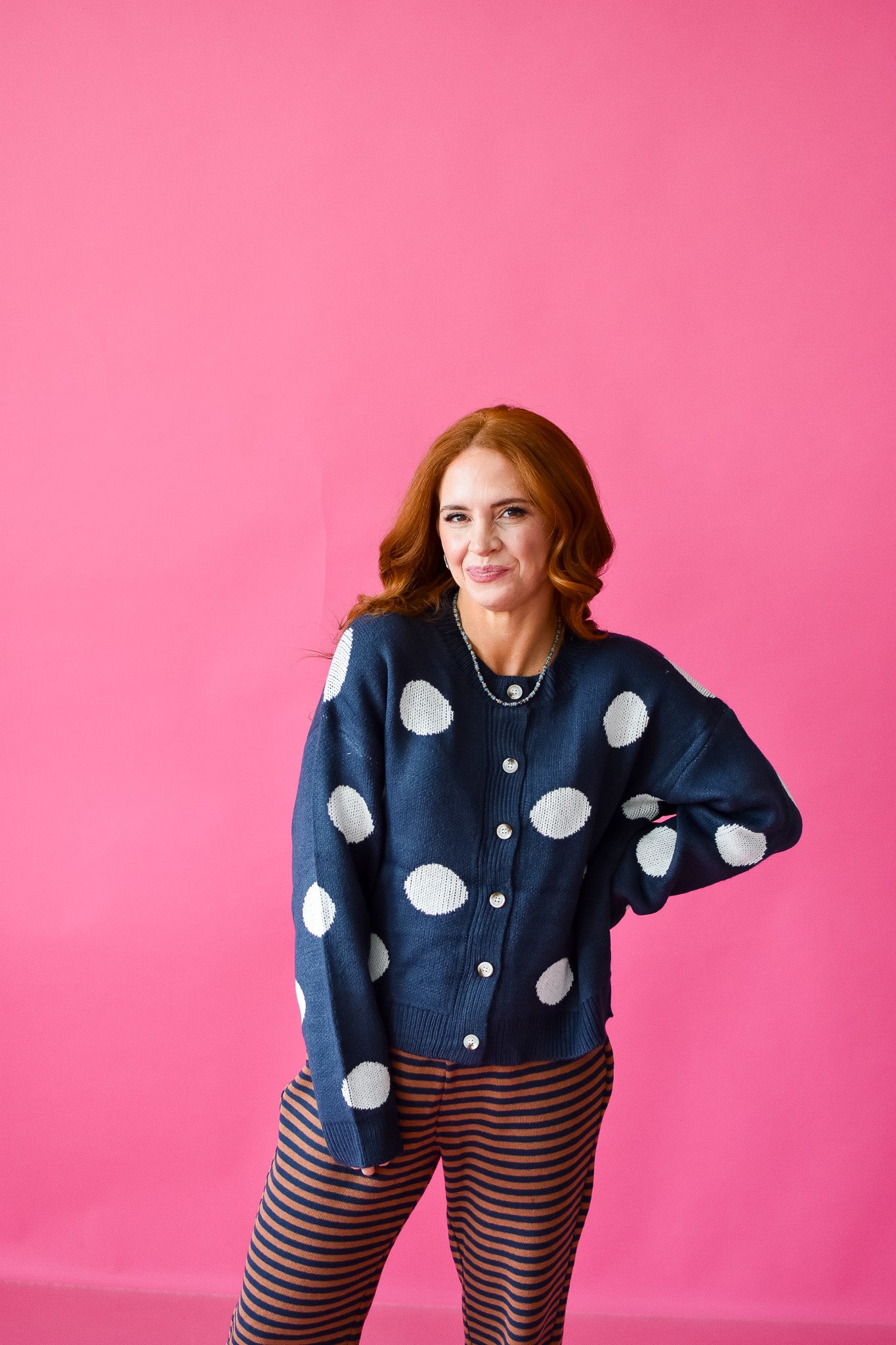 The Blythe Polka Dot Cardigan brings cheerful charm to your everyday wardrobe. Crafted in navy and cream, this classic polka dot pattern adds a touch of whimsy to any outfit. Featuring functional buttons for easy layering, it's perfect for transitioning between seasons or adding dimension to your look. Whether you're dressing up or keeping it casual, this versatile cardigan delivers both style and practicality with a fun, timeless appeal.