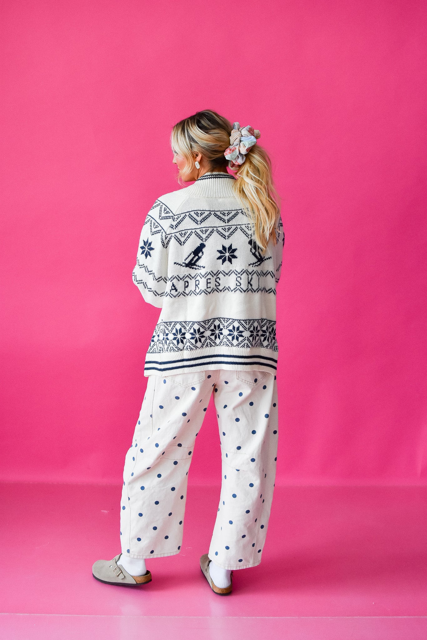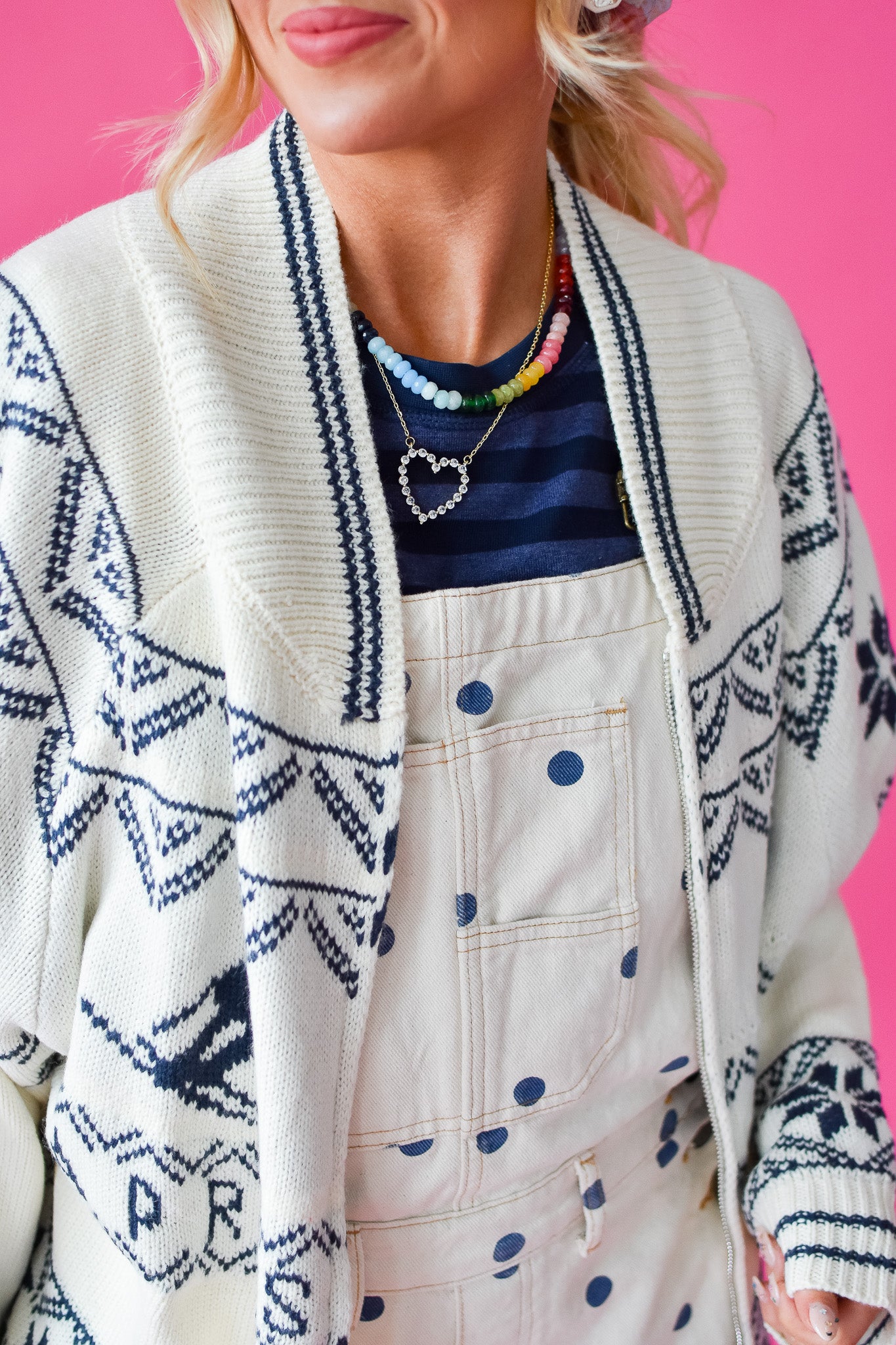 Wrap yourself in alpine luxury with the Breckenridge Aprés Ski Knit Cardigan—your new après-slope essential. This oversized knit features a creamy ivory base accented with rich navy details, creating a chic contrast that works as hard as you do on the slopes. The sleek silver zipper adds a touch of modern sophistication, while the cozy construction keeps you warm and comfortable whether you're sipping hot cocoa by the fireplace or heading out for evening adventures. Perfect for layering over your favorite base layers or wearing solo for effortless mountain style.