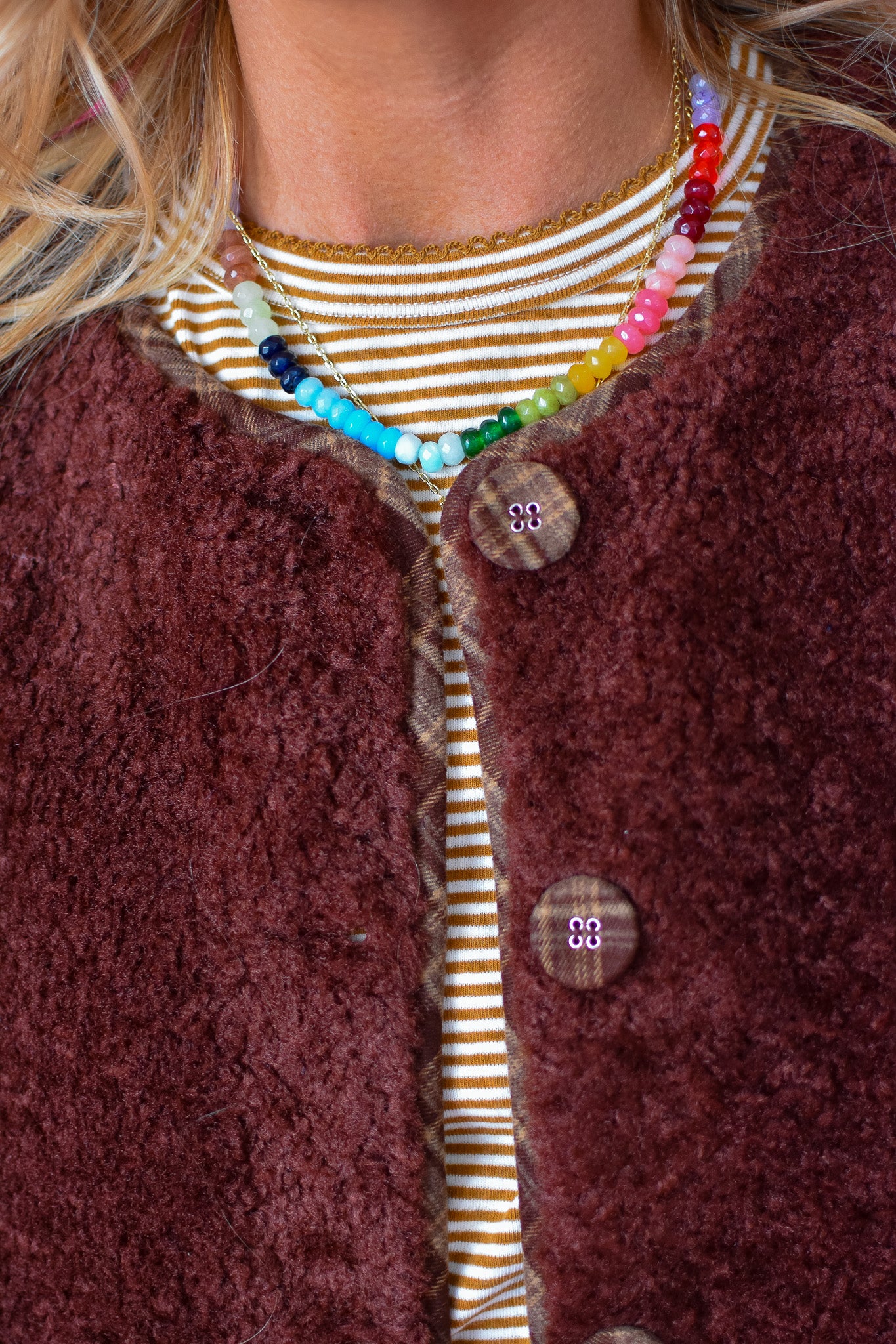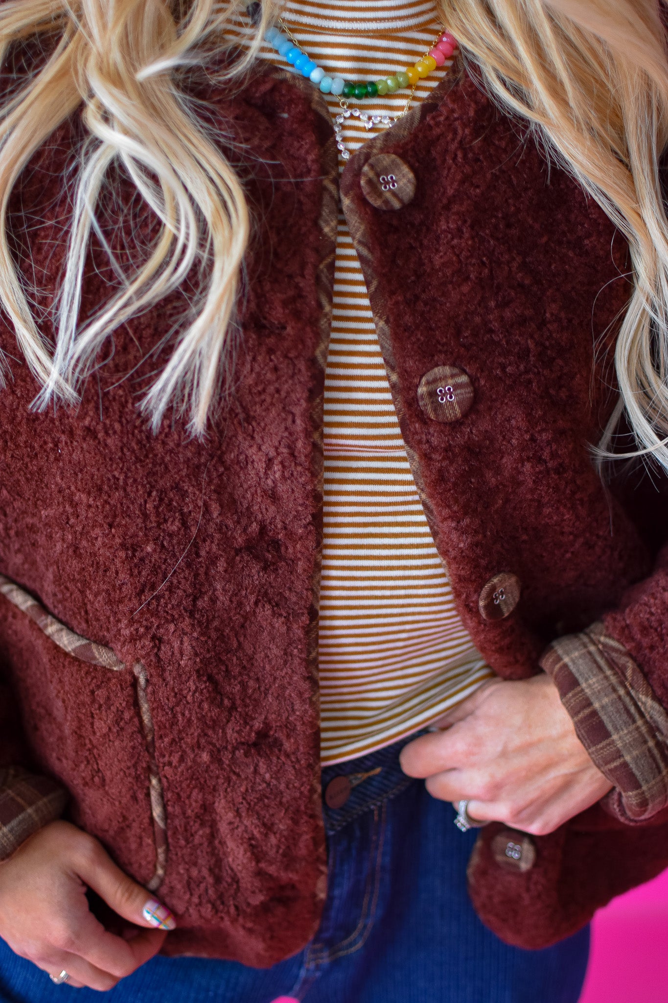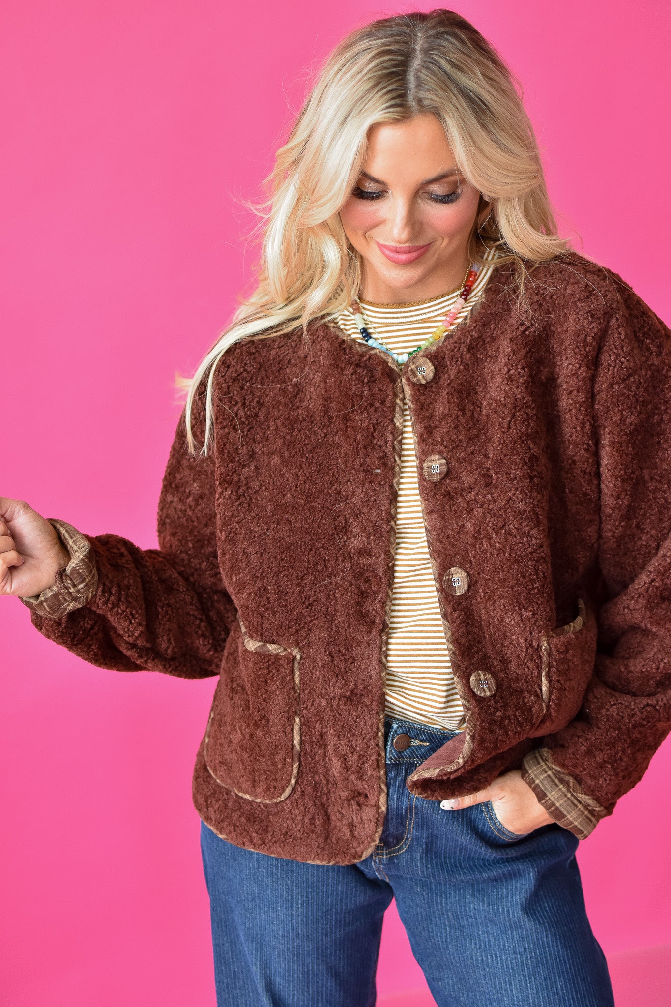 Wrap yourself in cozy charm with this brown sherpa fleece jacket that's equal parts comfort and character. Featuring a relaxed fit that lets you move freely, functional buttons for easy layering, and delightful tartan details that add a touch of preppy flair. Perfect for casual days when you want to feel snug without sacrificing style. This jacket proves that looking good and feeling great don't have to be mutually exclusive.