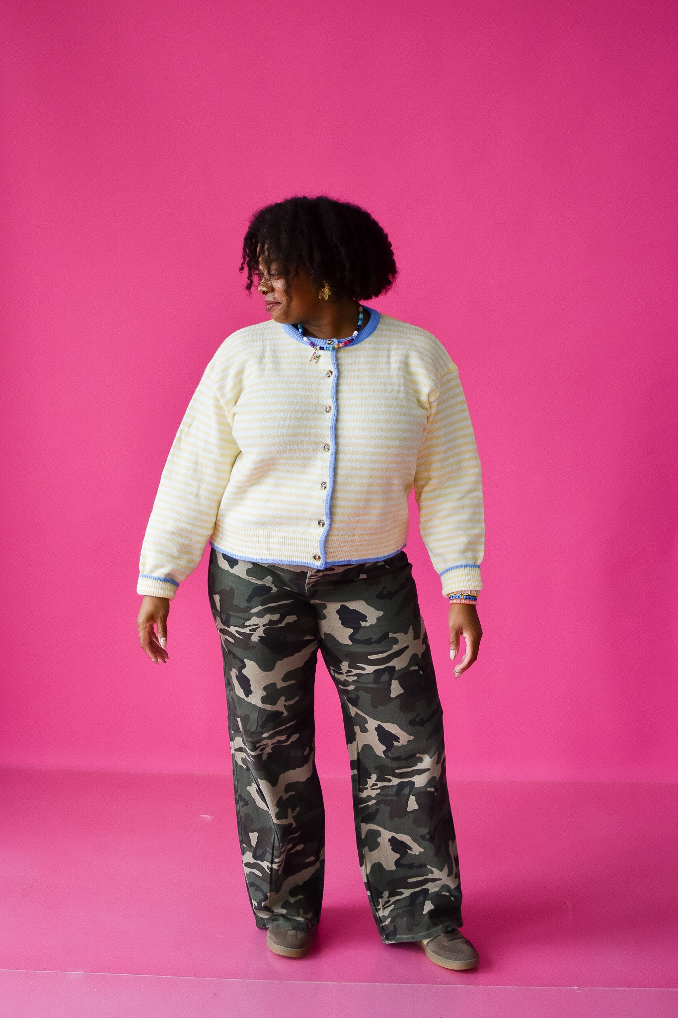 Add a burst of cheerful style to your wardrobe with the Brooks Stripe Cardigan. This sweet butter yellow knit features a playful cornflower blue trim and a relaxed fit that makes it perfect for layering. Pair it with your favorite jeans or camo pants to create a funky, fun look that's effortlessly cool and cozy all day long.