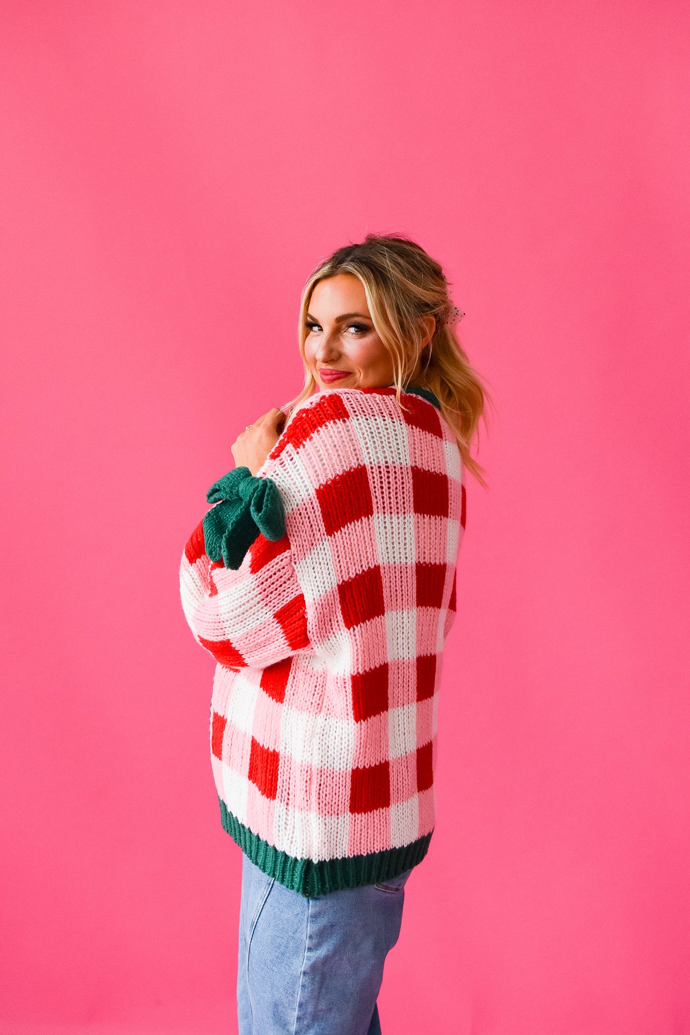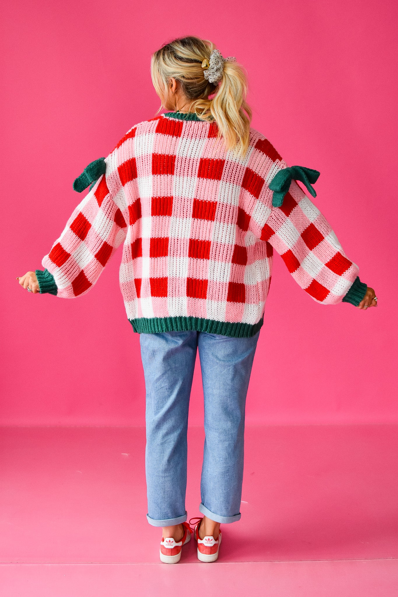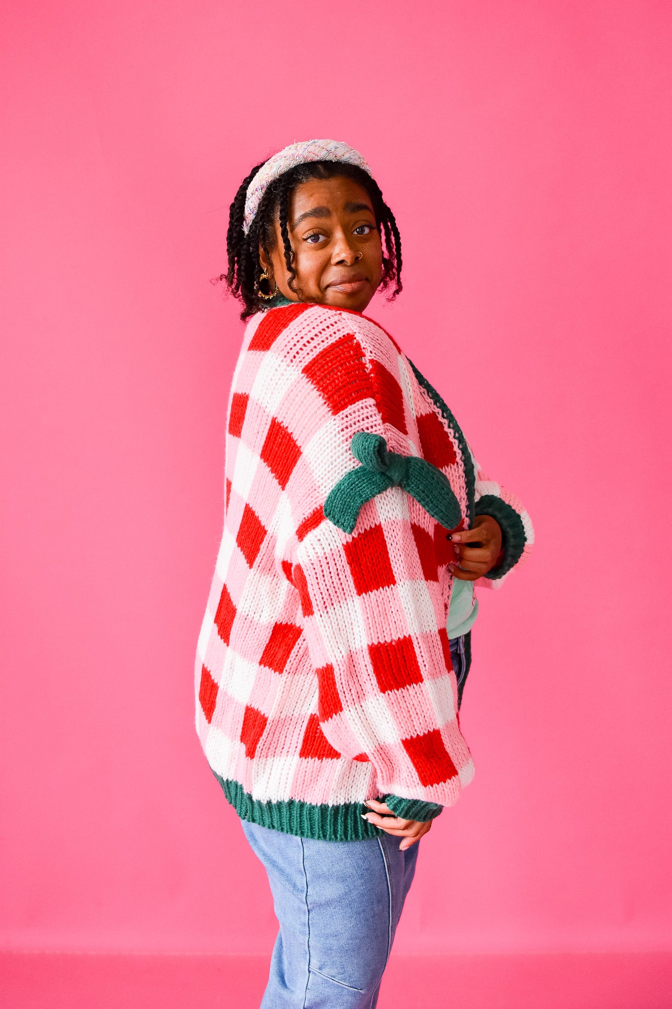 Wrap yourself in festive charm with this open-front Christmas Check Cardigan. Its playful pink and red check pattern pops with a surprise green bow detail on the sleeves, adding a cute twist to cozy oversized comfort. Perfect for holiday gatherings or chilly days when you want both warmth and whimsy.