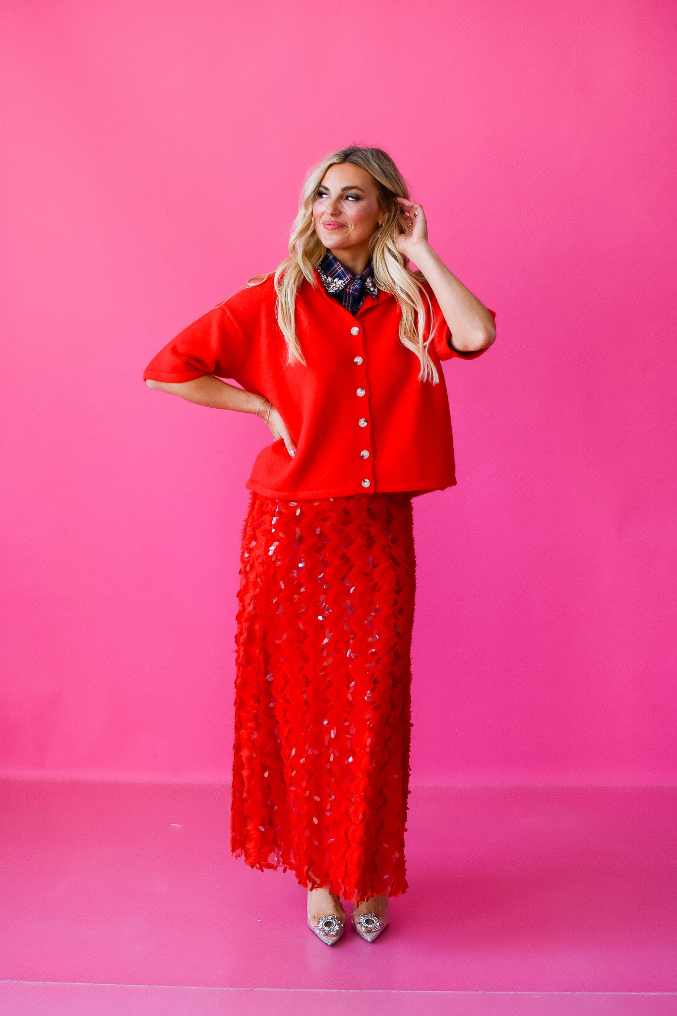 Slip into pure sparkle with the Eloise Sequin Maxi Skirt—your new go-to for holiday parties, date nights, and girls' nights out. Covered head-to-toe in shimmering red sequins, this show-stopping piece catches every light on the dance floor. The maxi length keeps things elegant while the playful skort silhouette gives you freedom to move and groove. Whether you're hitting a pop-up bar or making a grand entrance at a holiday celebration, this stunner delivers major glamour with zero fuss. Dress it up with heels and a sleek top, or keep it fun and casual—either way, you're guaranteed to turn heads.