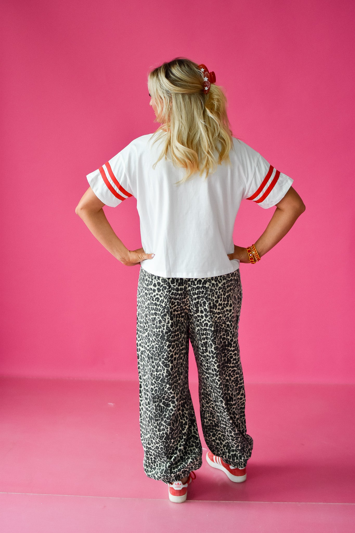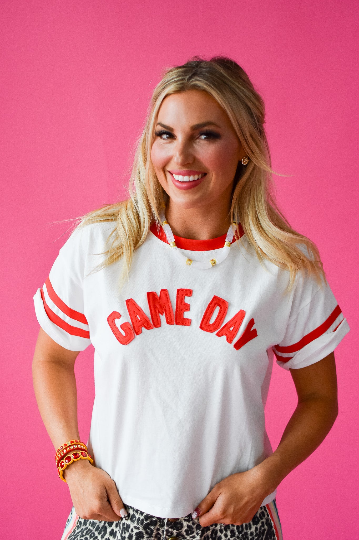 Get ready to cheer in style with the Game Day Boxy Tee! Its relaxed, boxy fit pairs perfectly with fun pants or your favorite denim, while varsity red stripes and embroidered patch letters add a spirited touch. Comfortable and playful, this tee is made for game day and beyond.