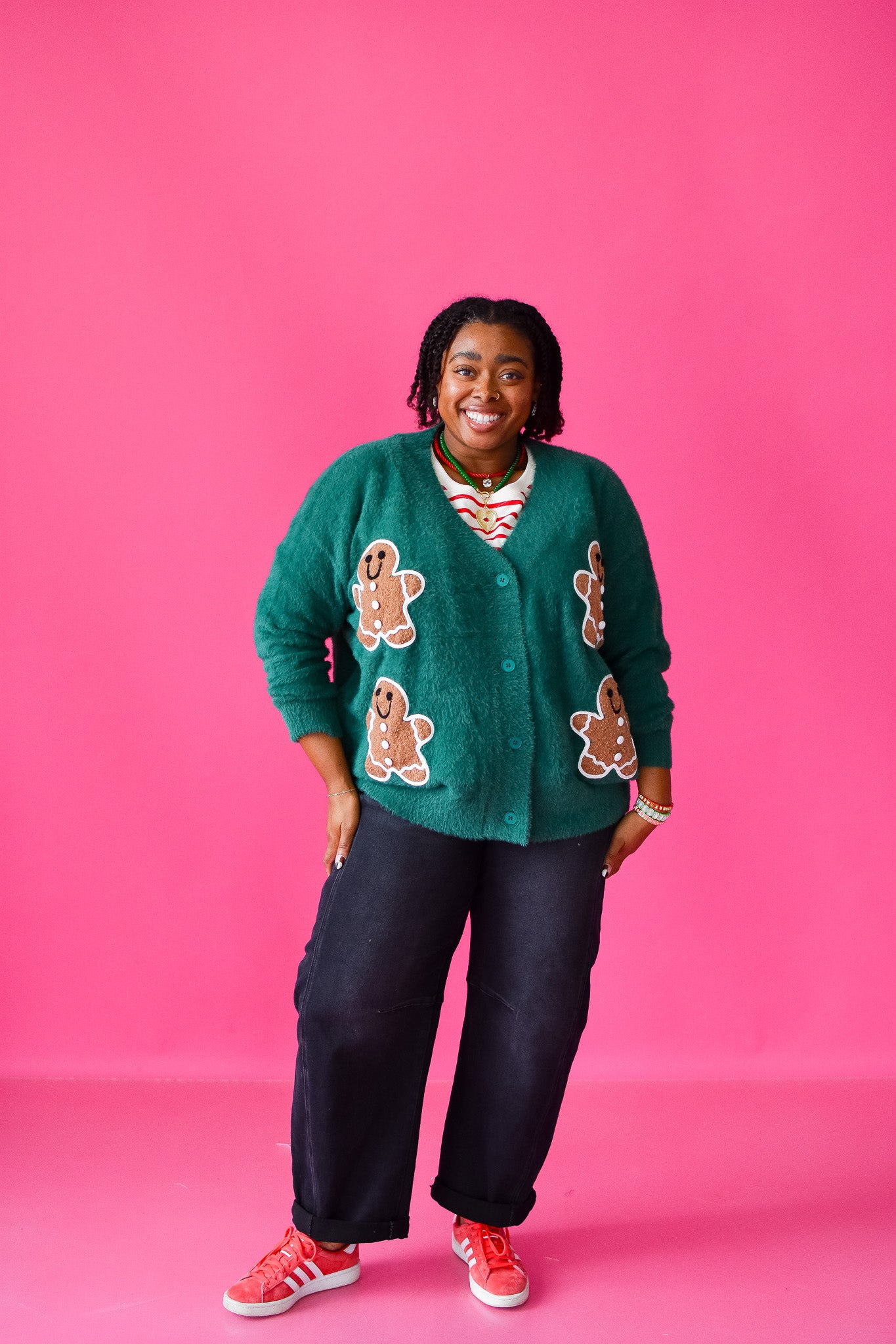 Cozy up in this playful Gingerbread Knit Oversized Cardigan, featuring a chunky brushed knit in festive green with charming brown gingerbread buttons. Perfectly oversized for comfort, it pairs effortlessly with denim or leggings for a fun, casual look that’s both warm and spirited.
