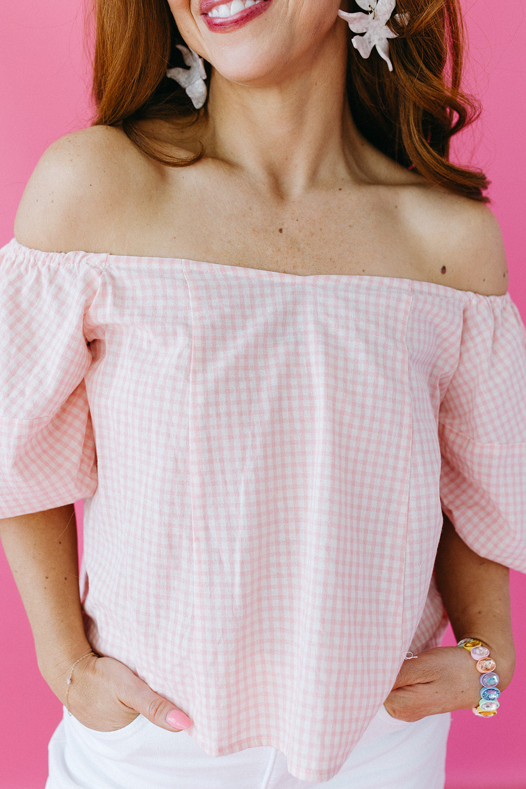 Design Details | Baby Pink Gingham Print | Off-The-Shoulder Neckline | Slight Bubble Sleeve