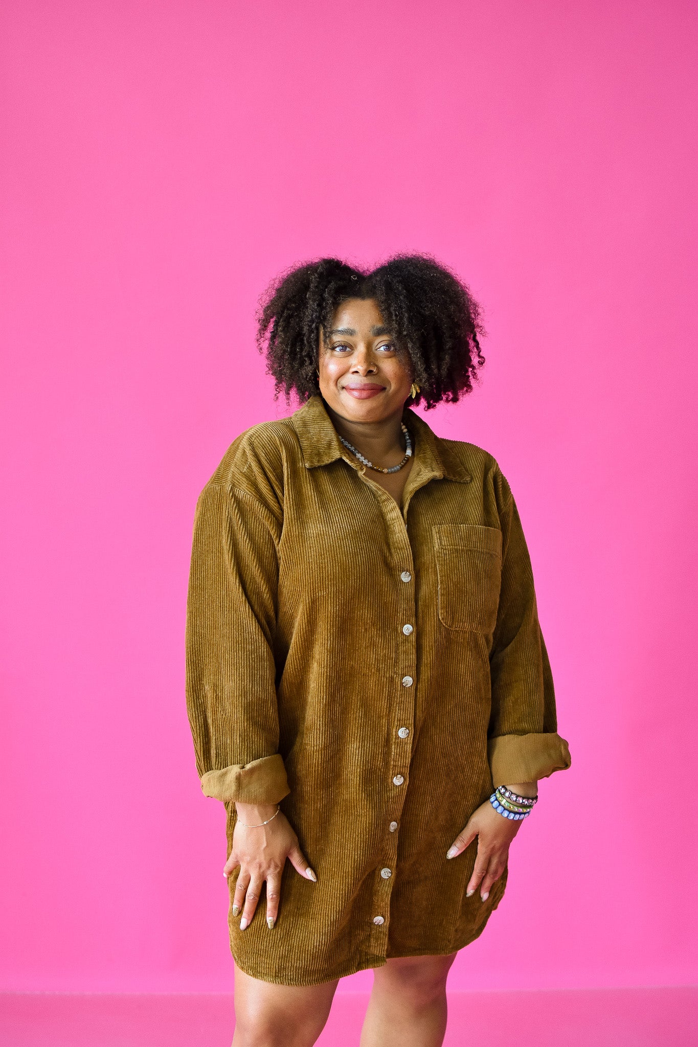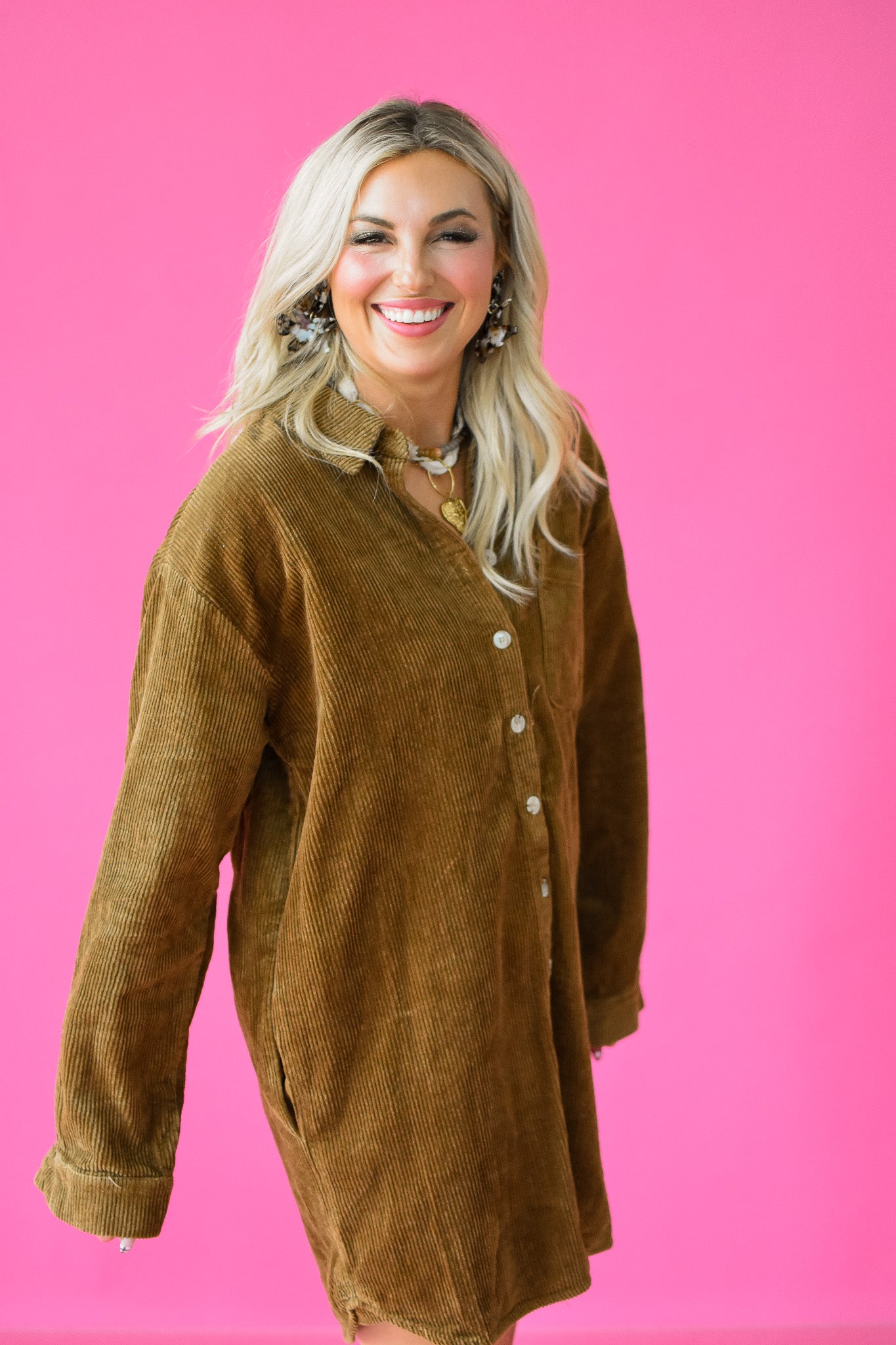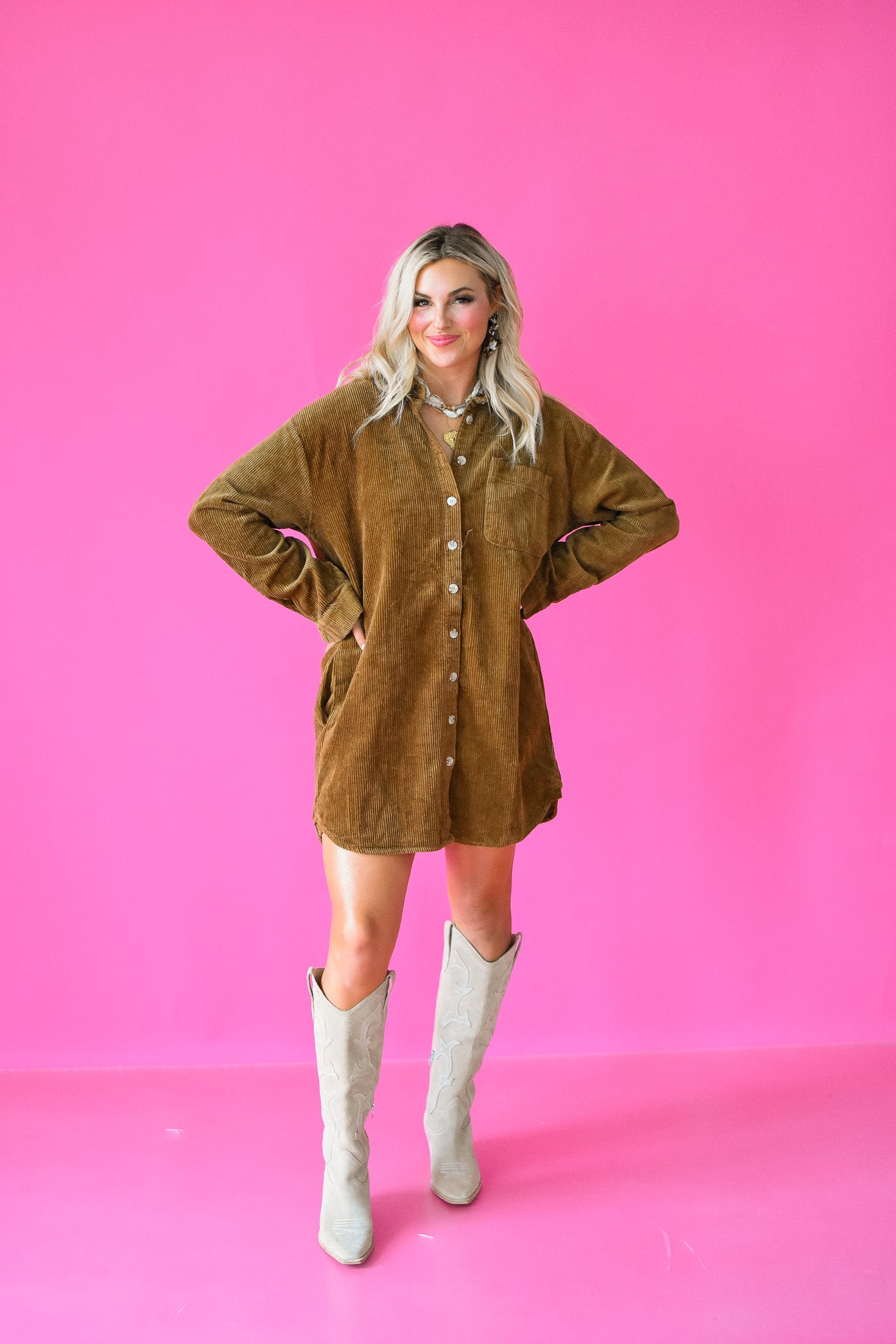 The Junie Corduroy Dress combines cozy camel corduroy with a relaxed, roomy fit for effortless style and comfort. Its long sleeves and classic button-up front make it perfect for layering or wearing solo on breezy days. Whether you're out exploring or lounging at home, this dress adds a touch of playful charm to your wardrobe without compromising ease.