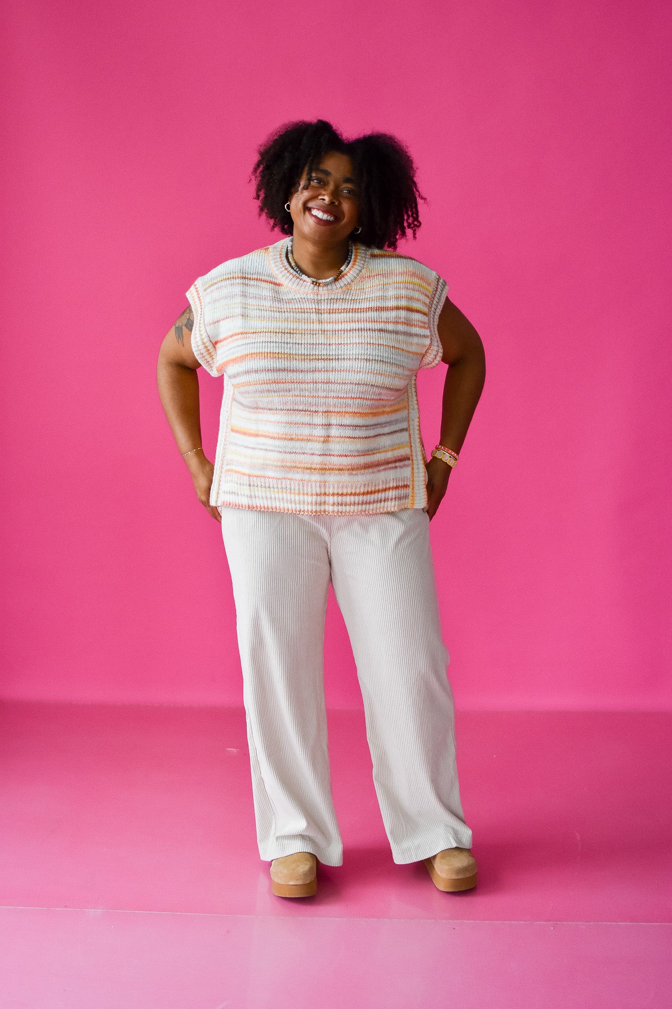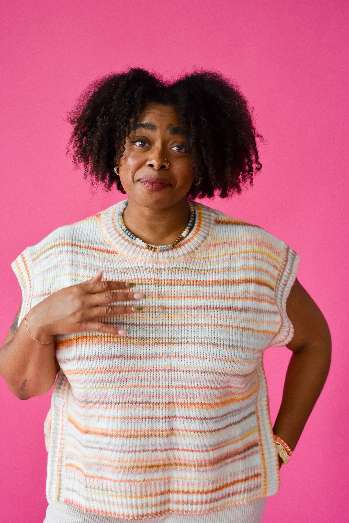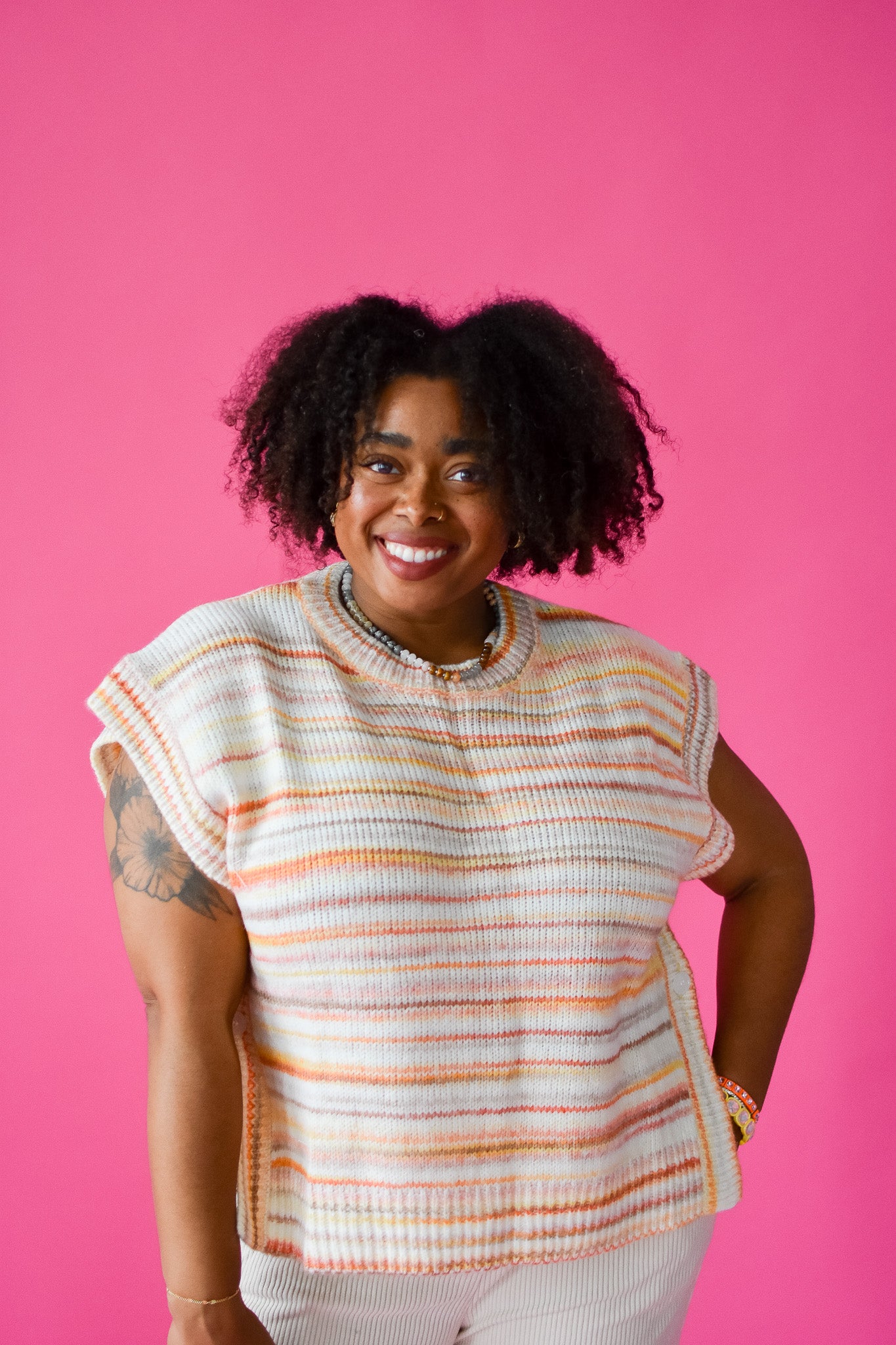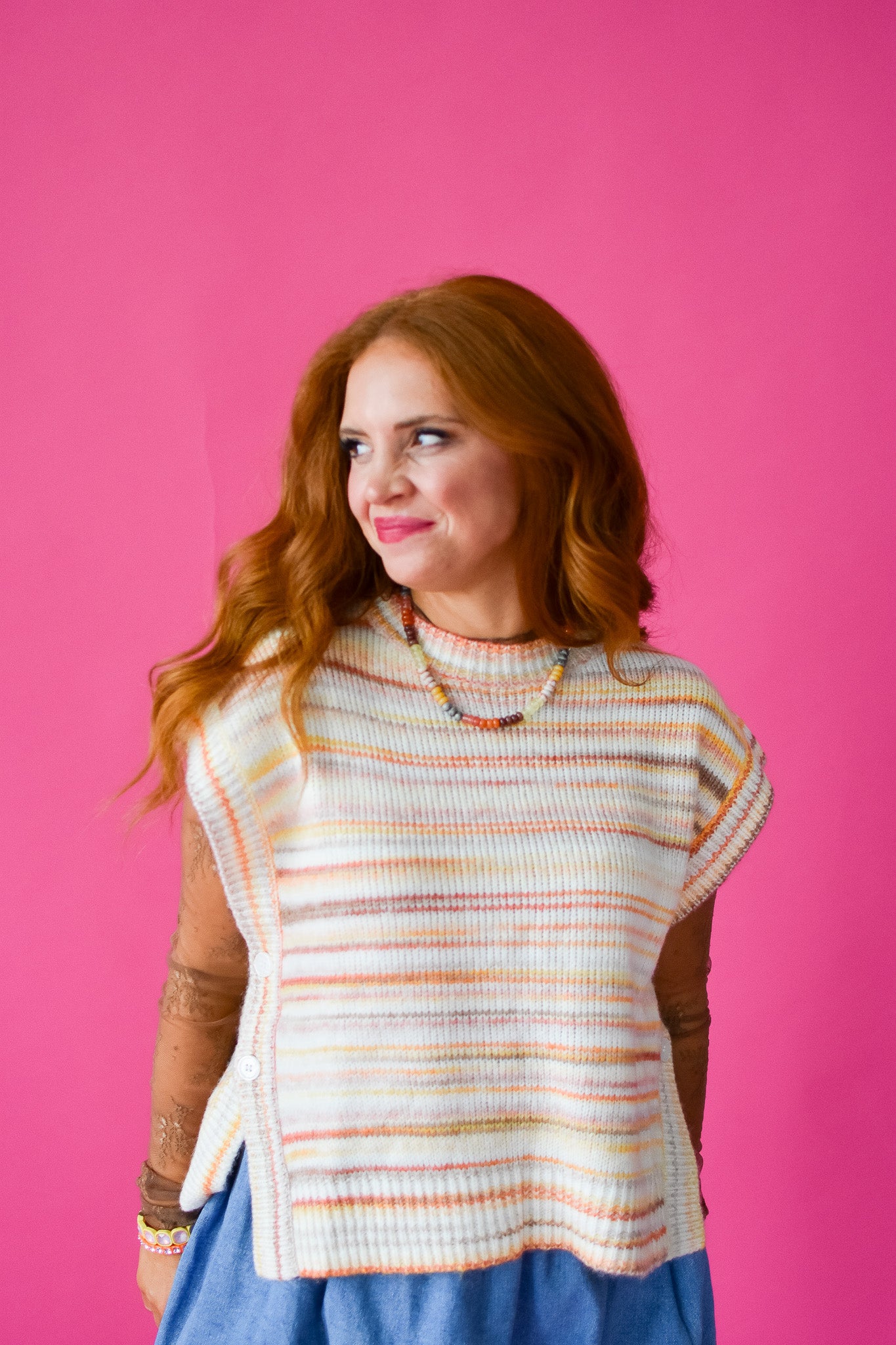 Get cozy and chic with the Kacey Sweater Vest! This sunkissed knit vest features playful side buttons and a sleeveless design, perfect for layering over your favorite tops or wearing solo on warmer days. Its versatile style lets you mix and match effortlessly while adding a fun, sunlit vibe to any outfit.