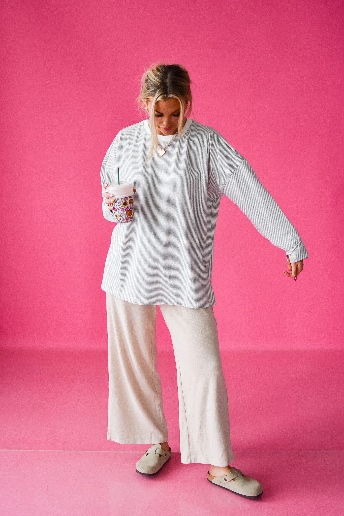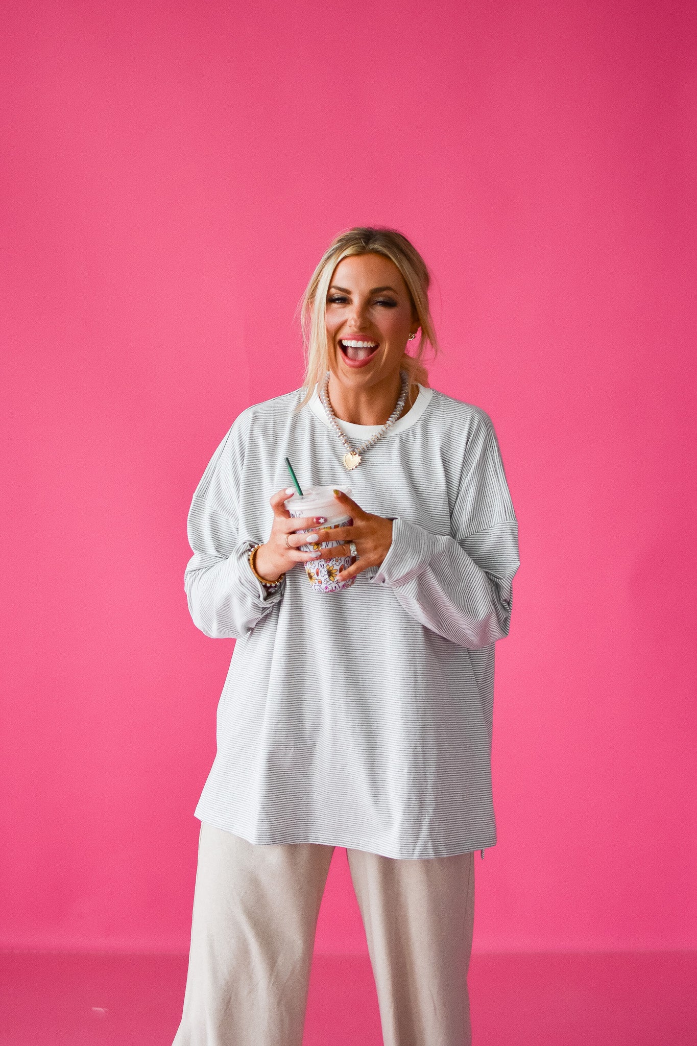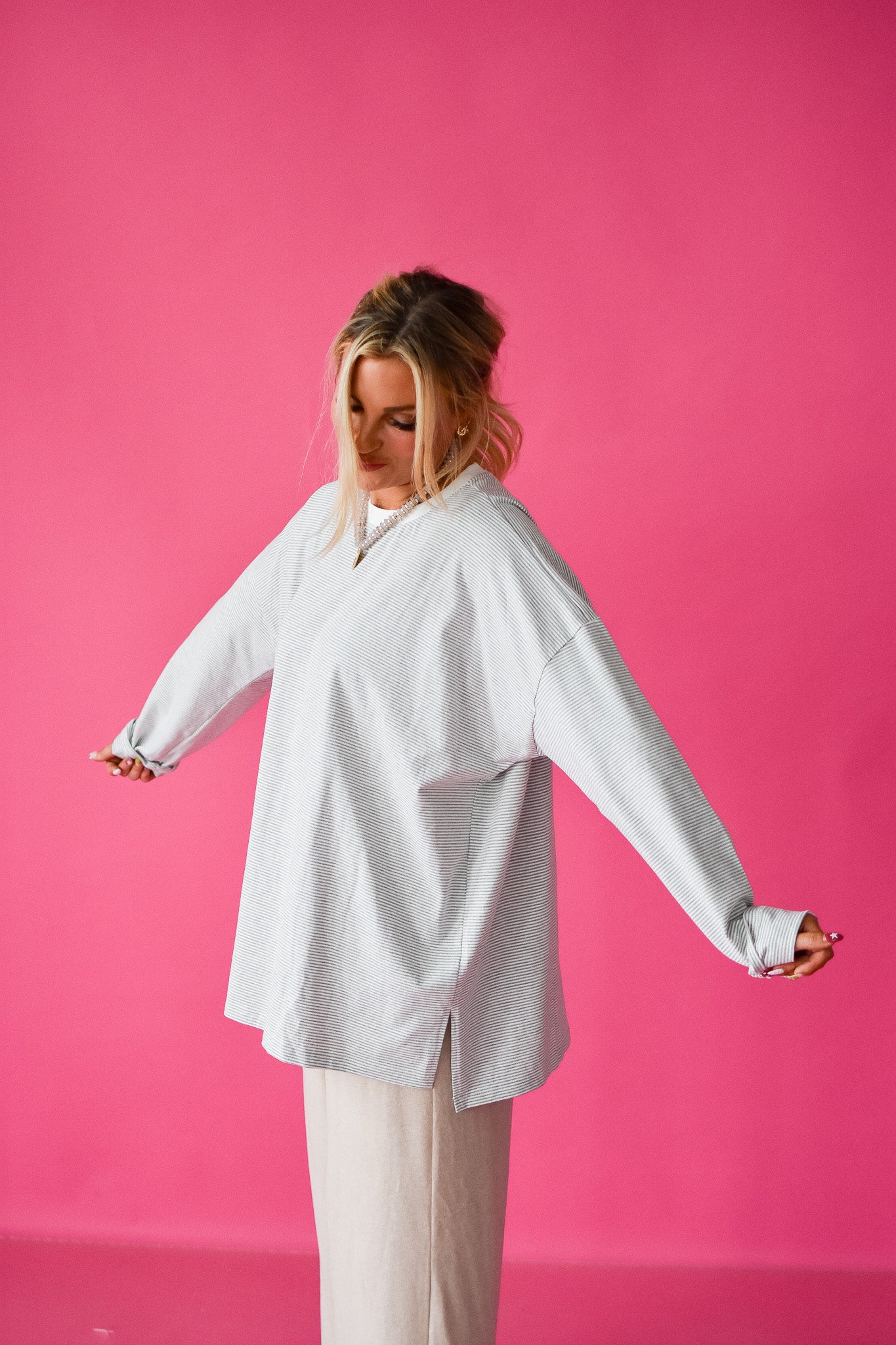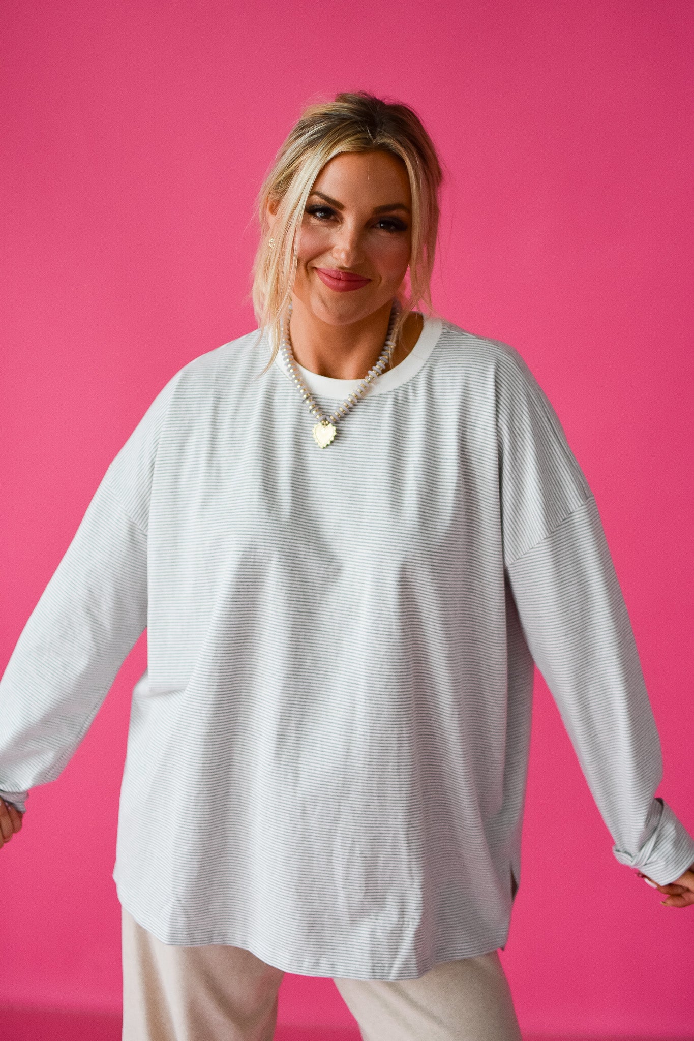 Embrace cozy comfort with the Kelly Ann Oversized Stripe Top. Featuring long sleeves and playful side slits, this crewneck blends grey and white mini stripes for a casual-chic look. Its roomy fit makes it perfect for layering or lounging with a fun, relaxed vibe.