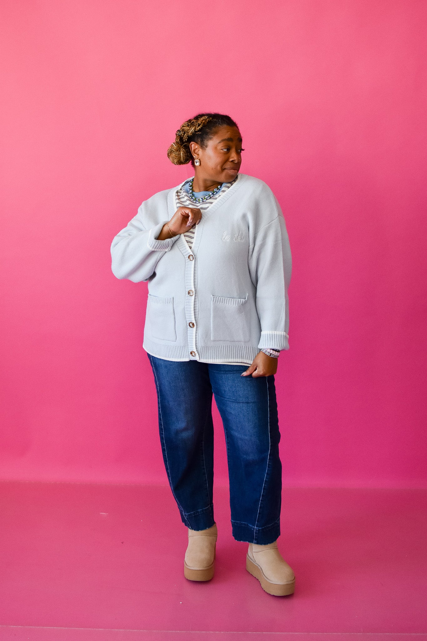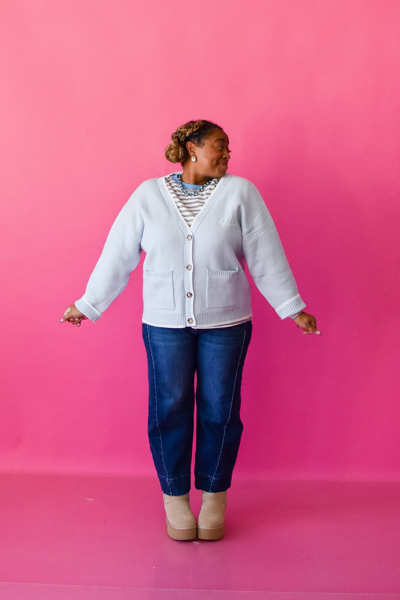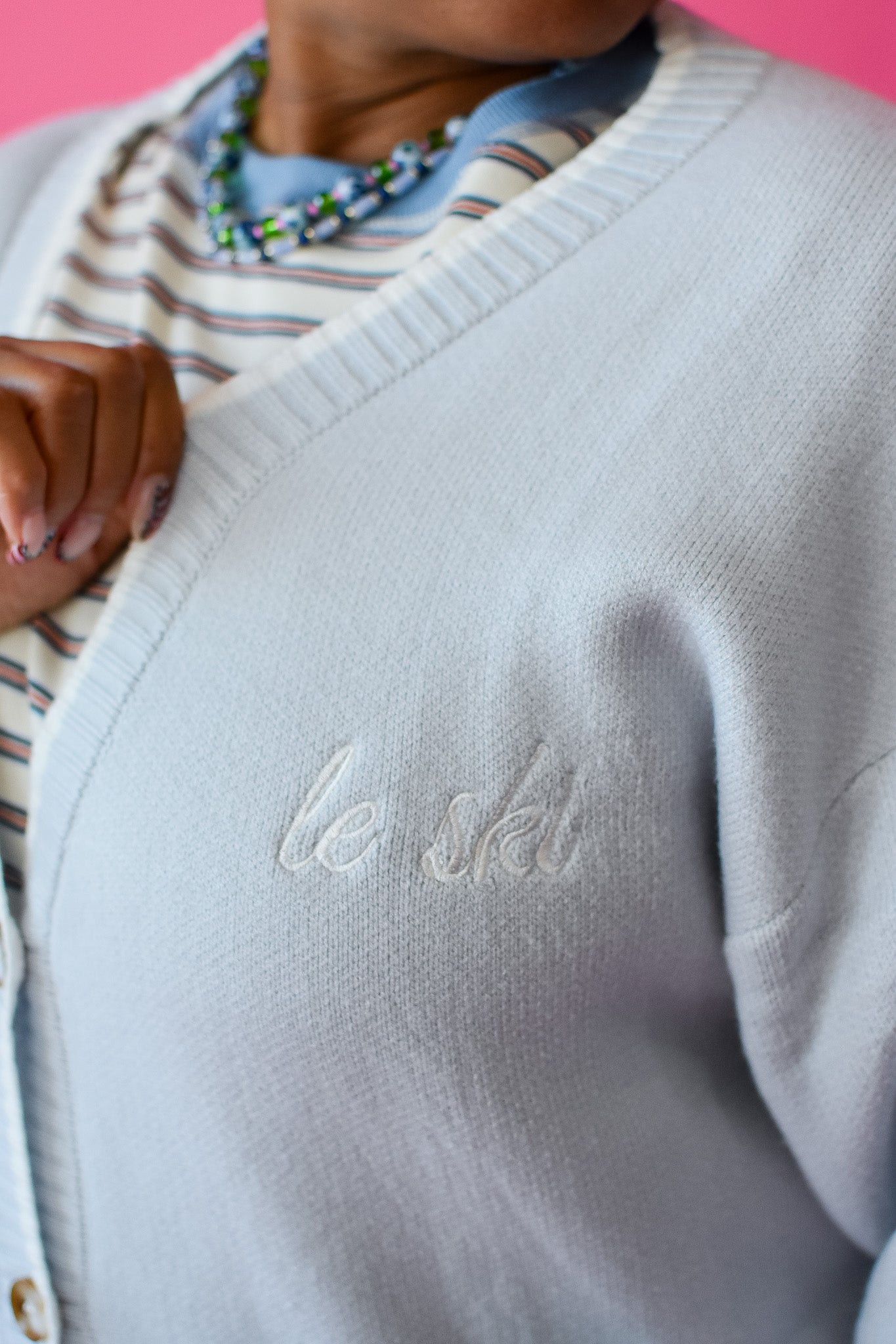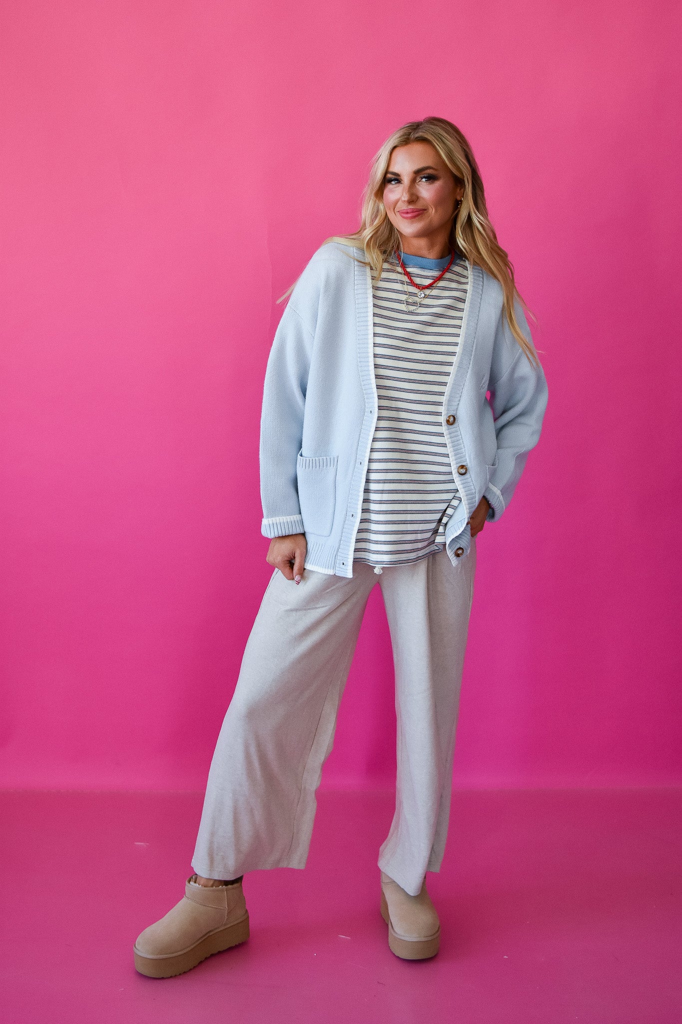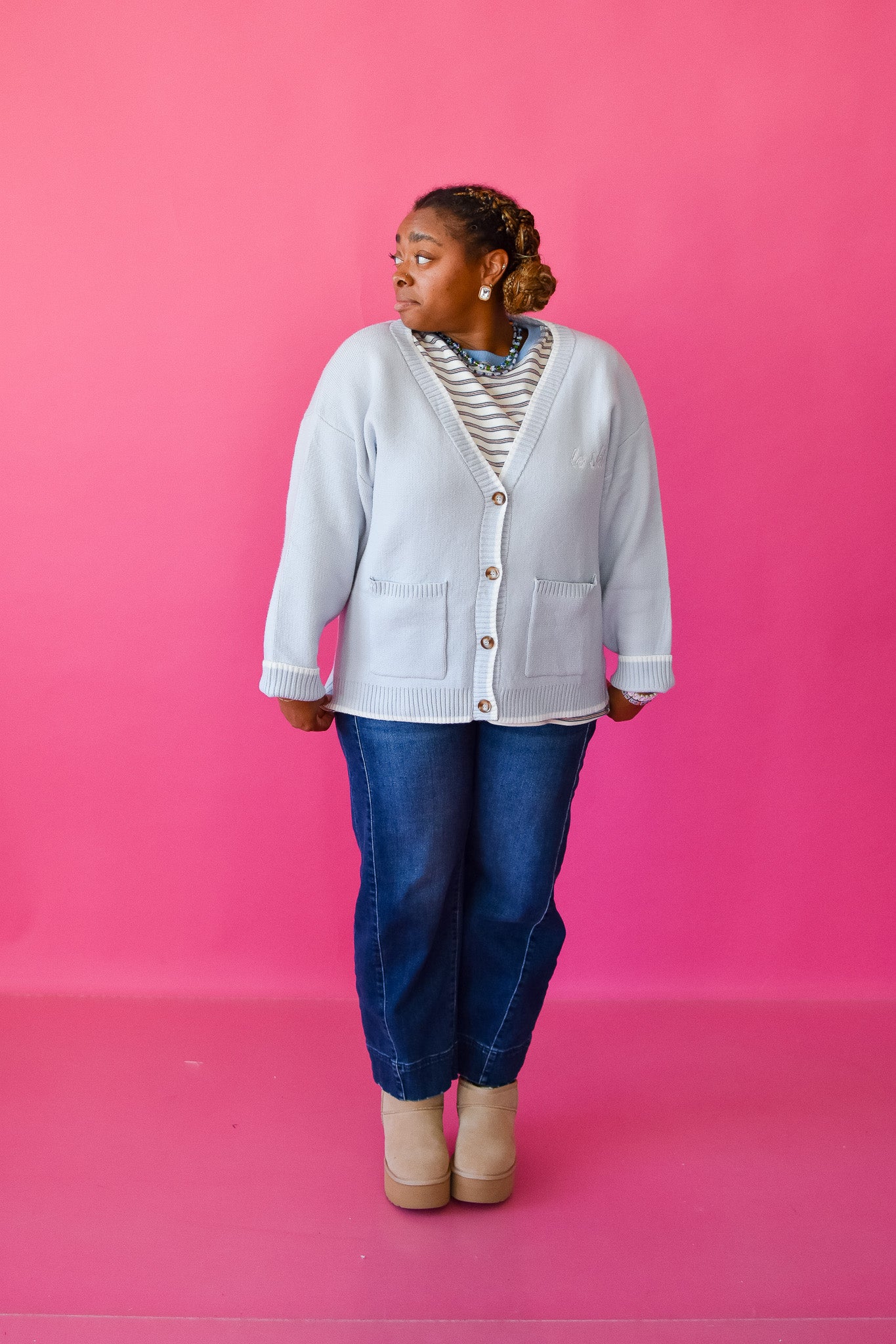 Layer up for alpine adventures in this breezy light blue cardigan that's equal parts cozy and effortlessly cool. The relaxed fit drapes perfectly over your favorite sweaters, while the deep V-neck adds just enough style to keep things interesting. Functional buttons and front pockets mean you've got somewhere to stash your hands (and snacks) when the mountain calls. Whether you're hitting the slopes or just channeling ski lodge vibes, this is your new go-to for those crisp winter days when comfort is non-negotiable.