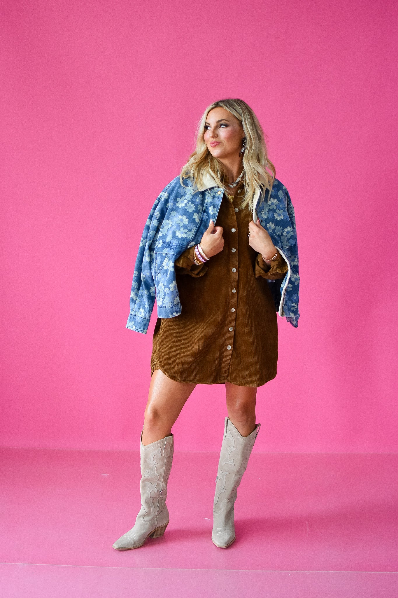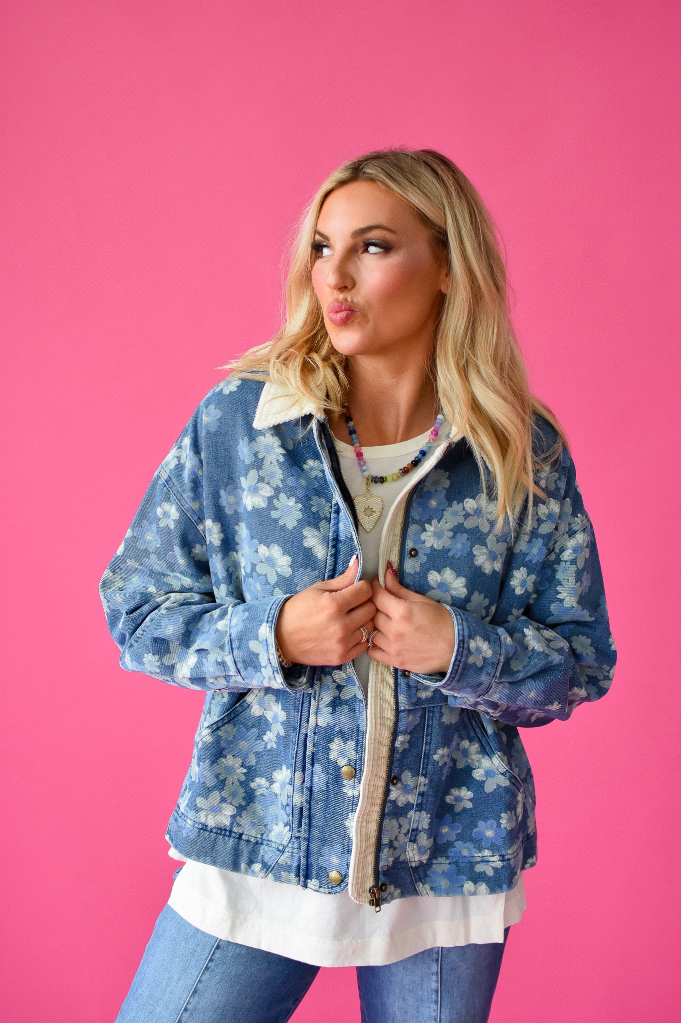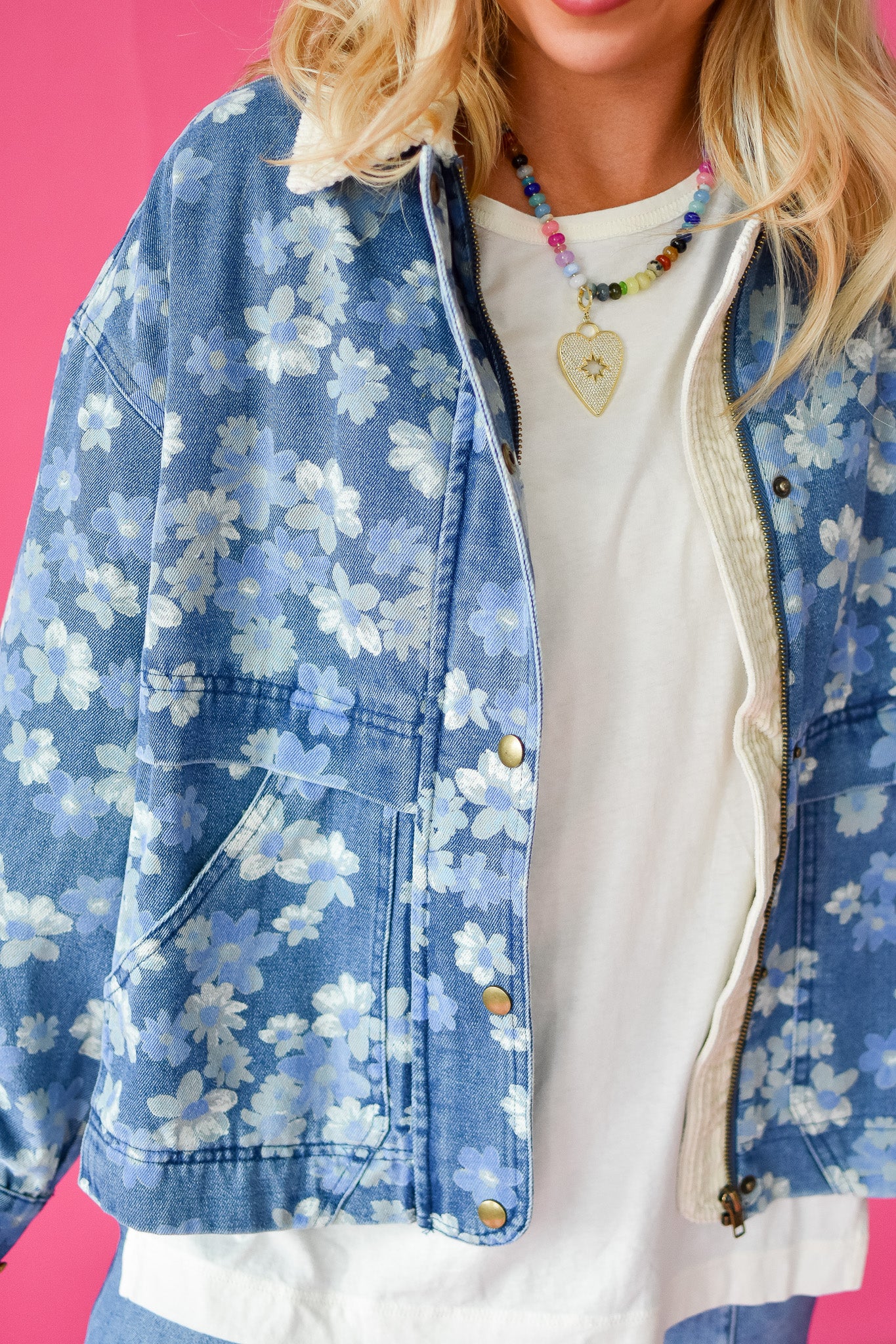 Step out in fun, oversized style with the Madelyn Floral Denim Barn Jacket. Its blue printed floral design brings a splash of whimsy, while the cozy corduroy collar adds a touch of rustic charm. Featuring both buttons and a zipper, it lets you play with your look effortlessly. Perfect for layering, this jacket combines playful patterns with practical comfort for your everyday adventures.