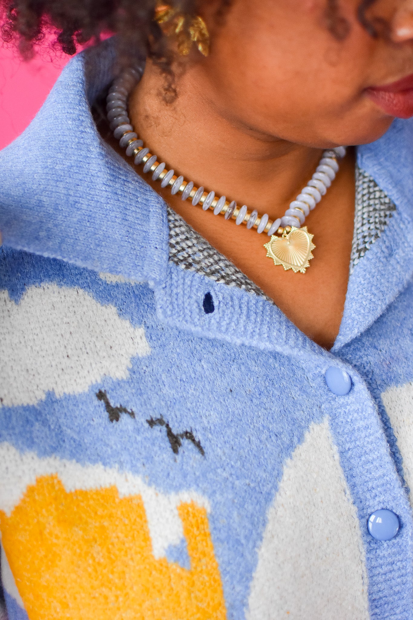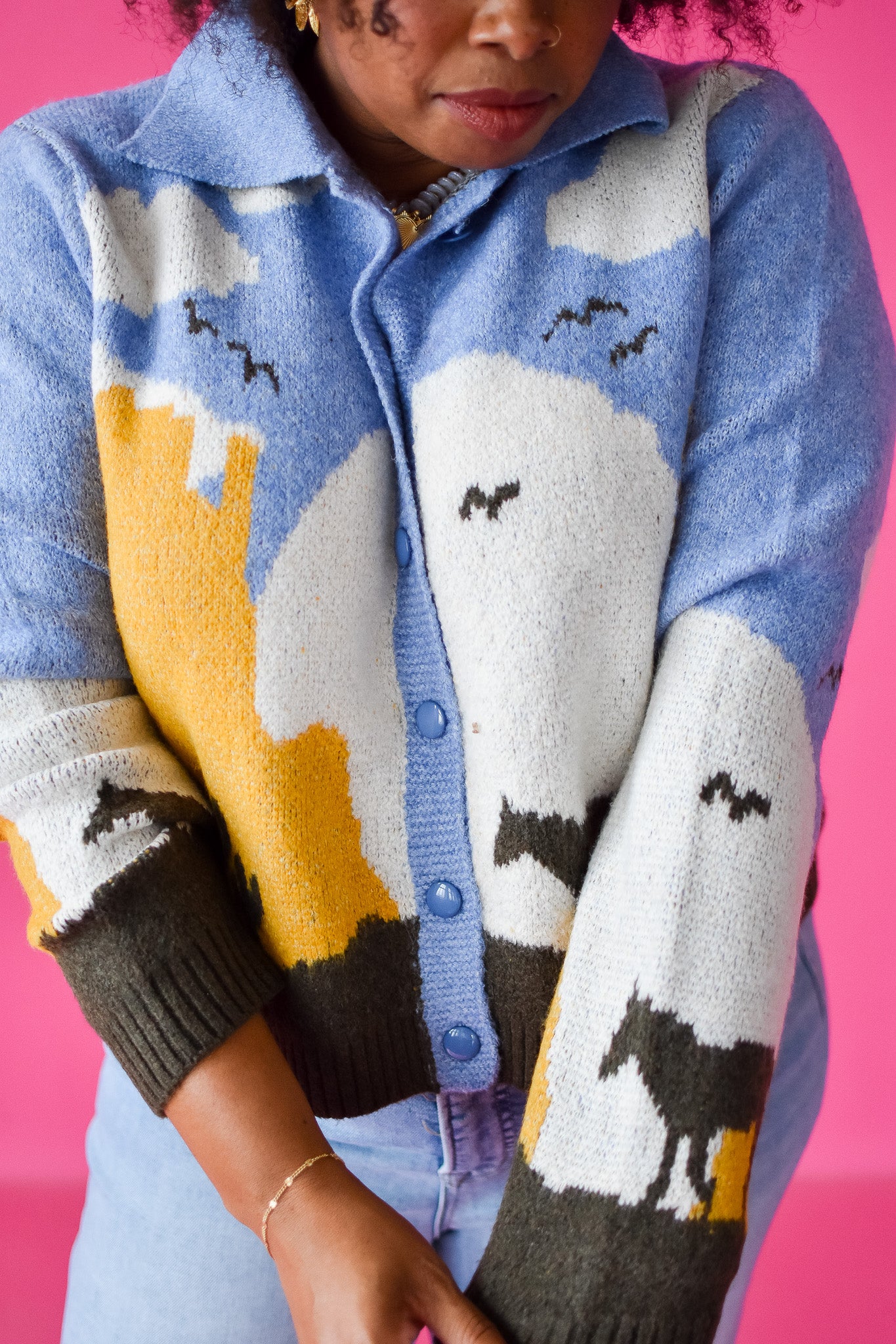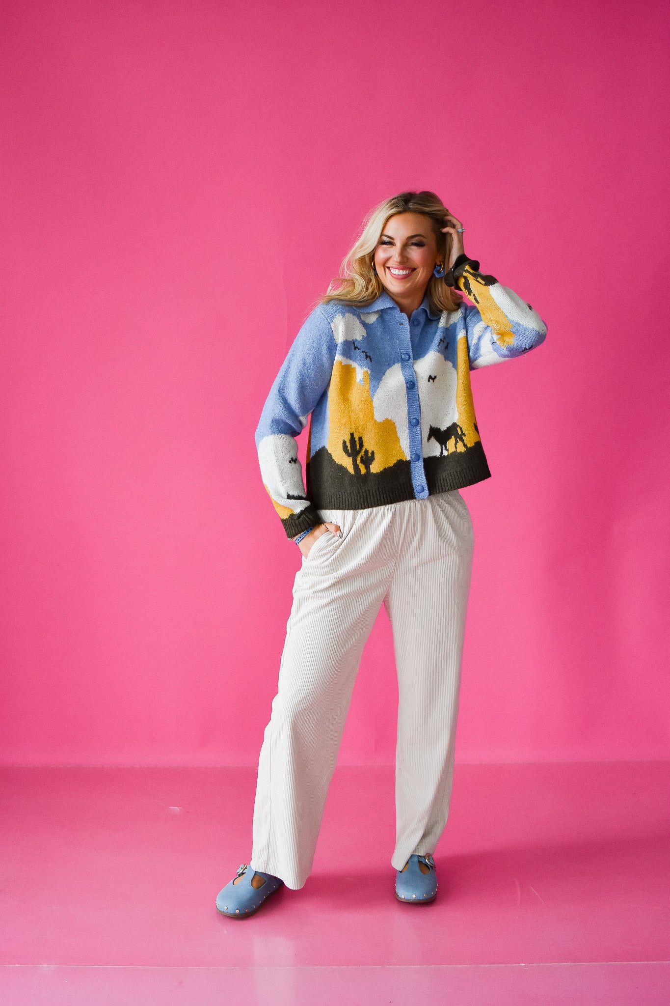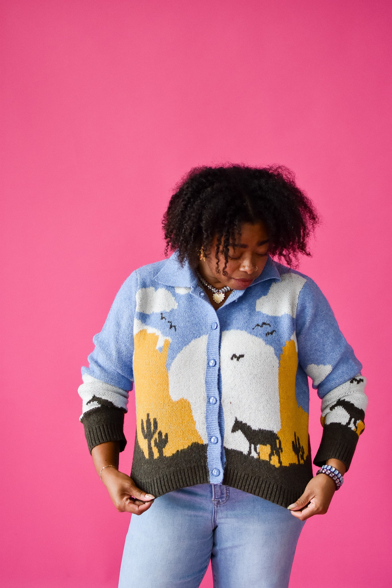 Step into rustic charm with the Magnolia Cardigan, a playful take on western style. This button-up cardigan features a cozy chambray blue base accented by dark brown and yellow details, evoking the spirit of open plains and sunset rides. The collared design adds a touch of classic flair, perfect for layering during cool evenings or casual outings. Embrace warmth and personality in one effortlessly stylish piece.