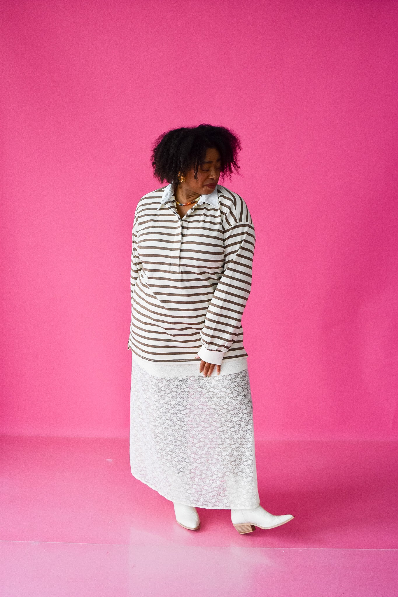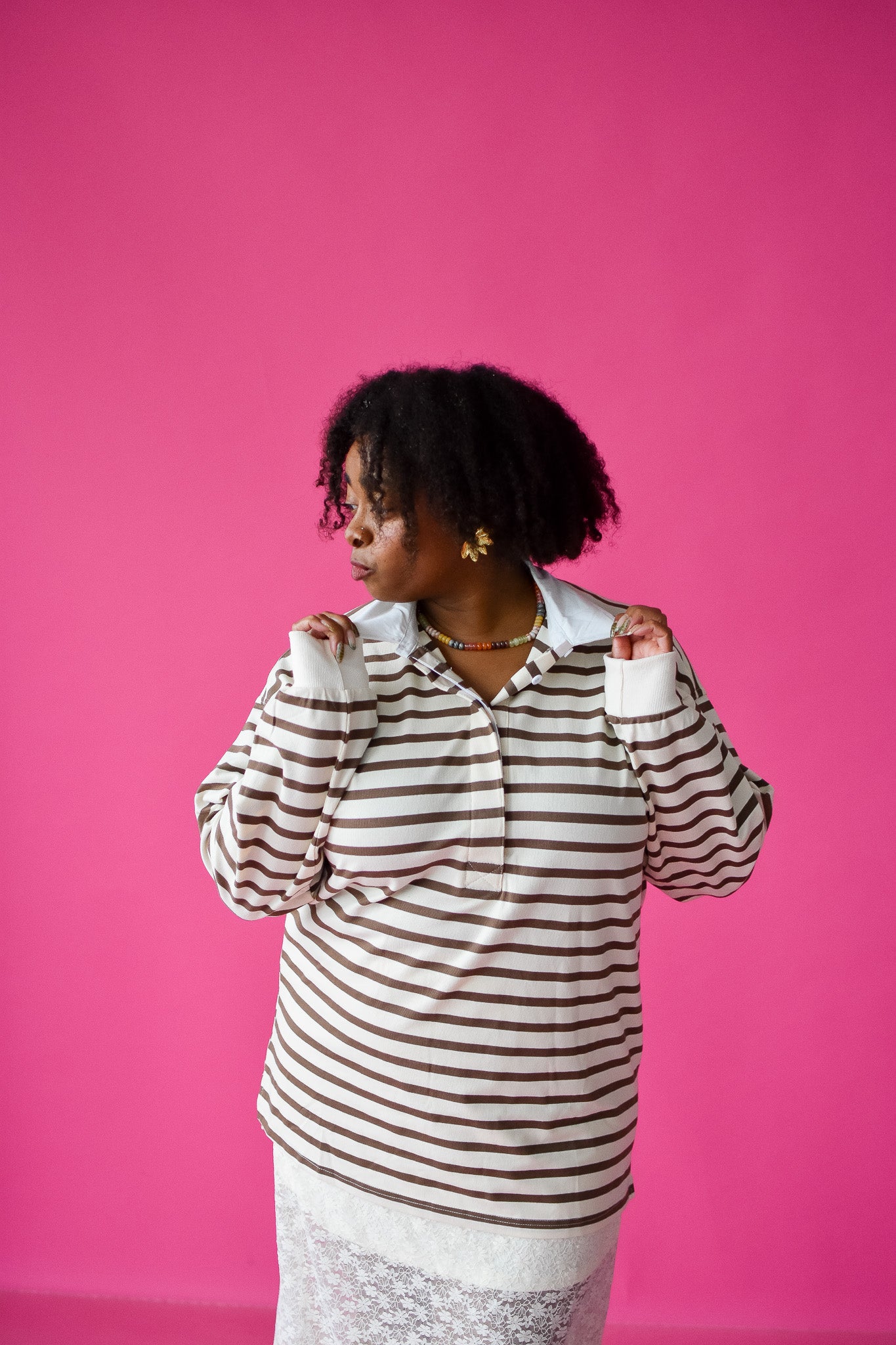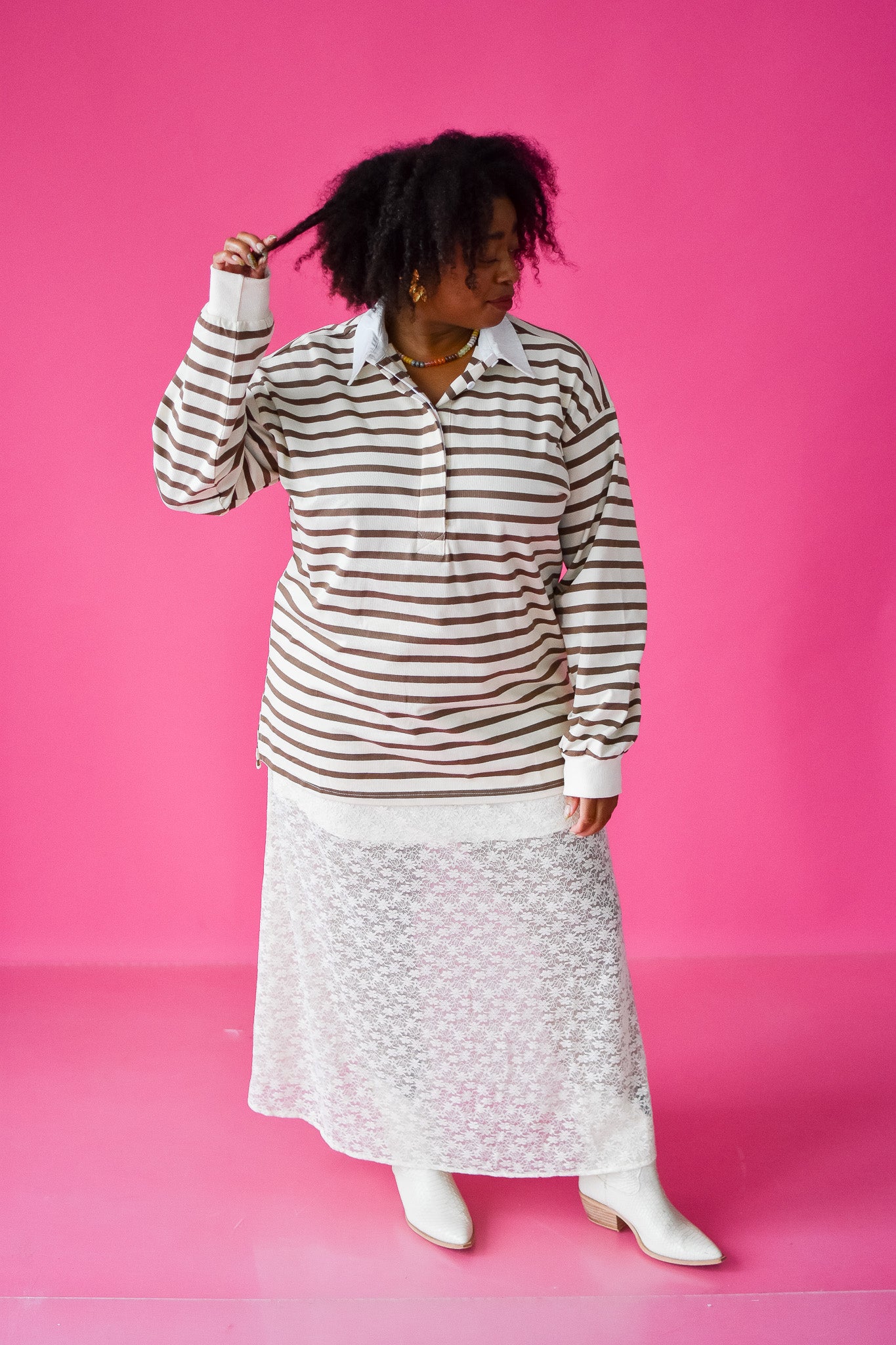 Get cozy in the Mira Oversized Rugby Top, where creamy whites meet rich browns for a laid-back, stylish vibe. Its longer length and roomy fit make it perfect for layering or lounging, while the classic collar adds a touch of sporty charm. Ready to add comfy coolness to your wardrobe? This top has your back.