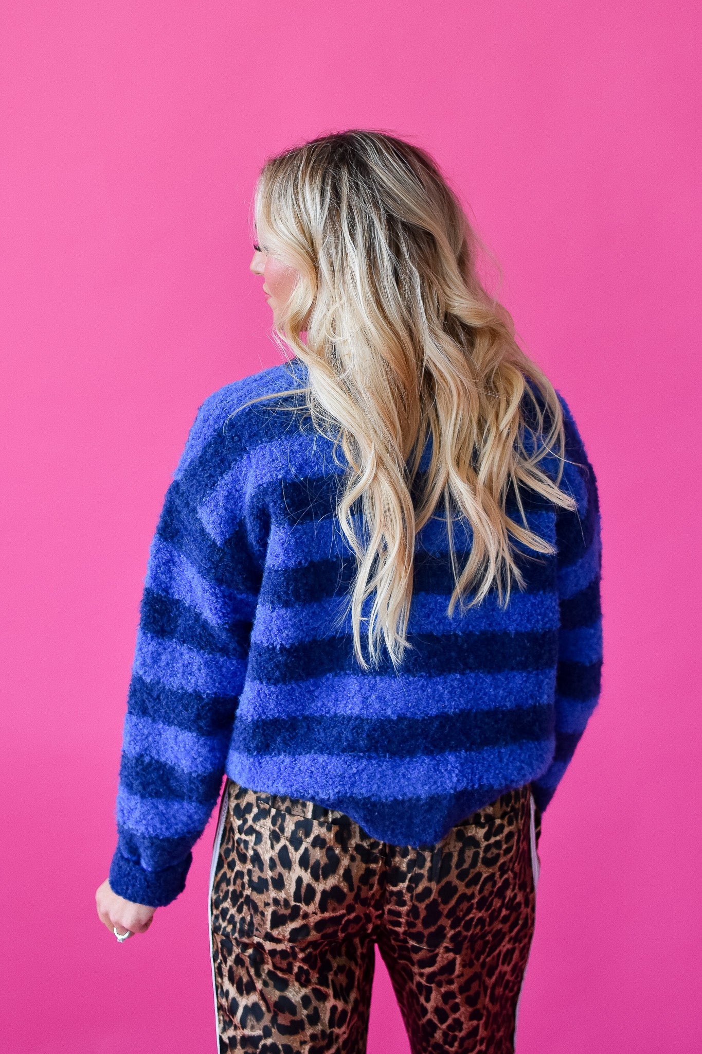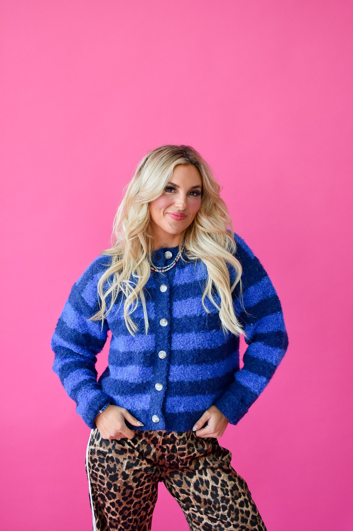 Layer up with the Natalie Brushed Striped Cardigan, your new go-to for effortless style. This cozy piece features a classic navy and blue striped pattern with a soft brushed finish that feels as good as it looks. Complete with button-up closure and a relaxed fit, it's perfect for throwing over your favorite tee or dress. Whether you're heading to brunch or settling in for a casual day, this striped essential keeps you comfortable and chic.