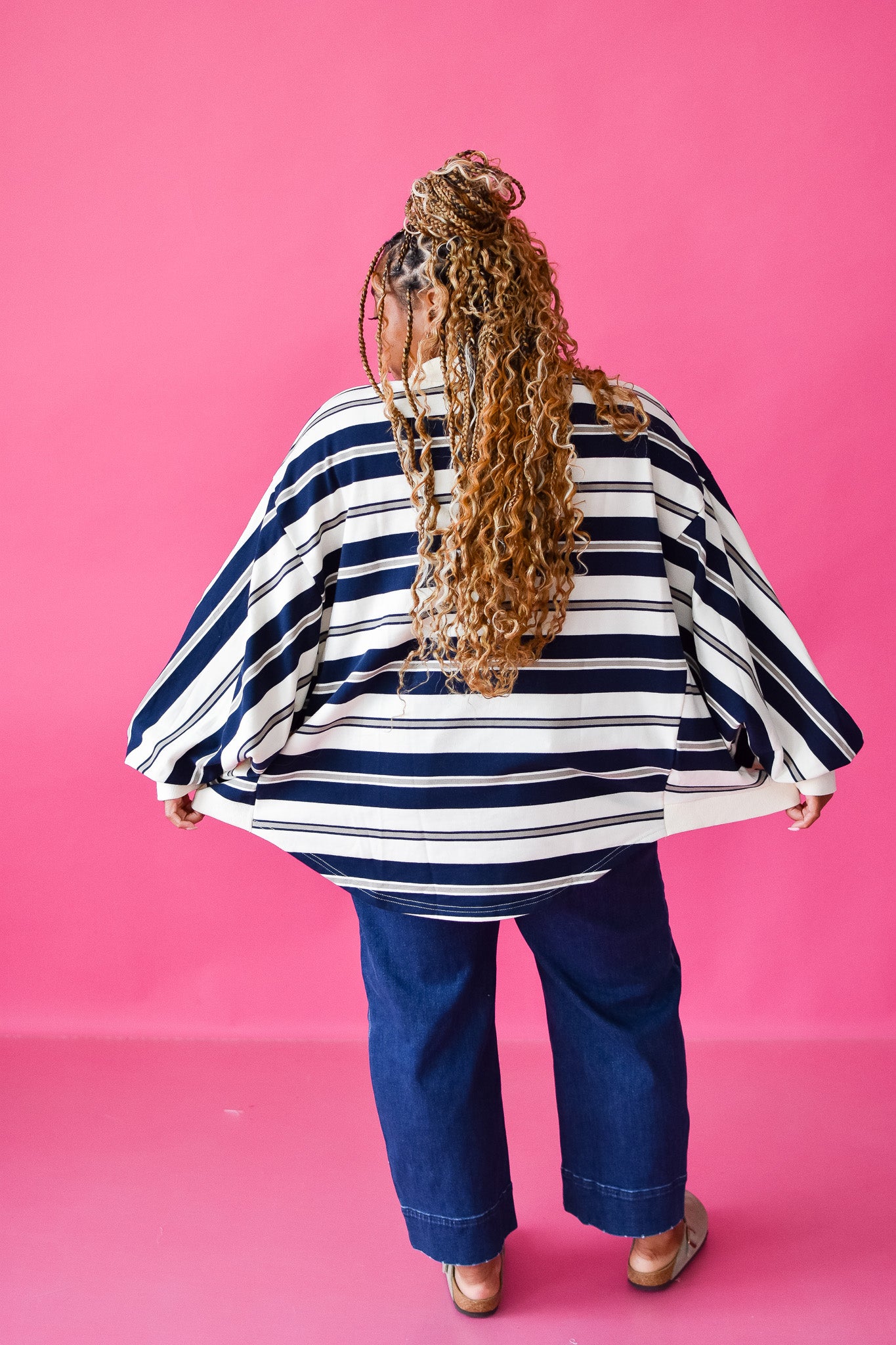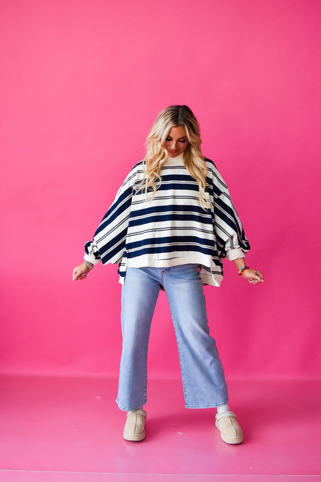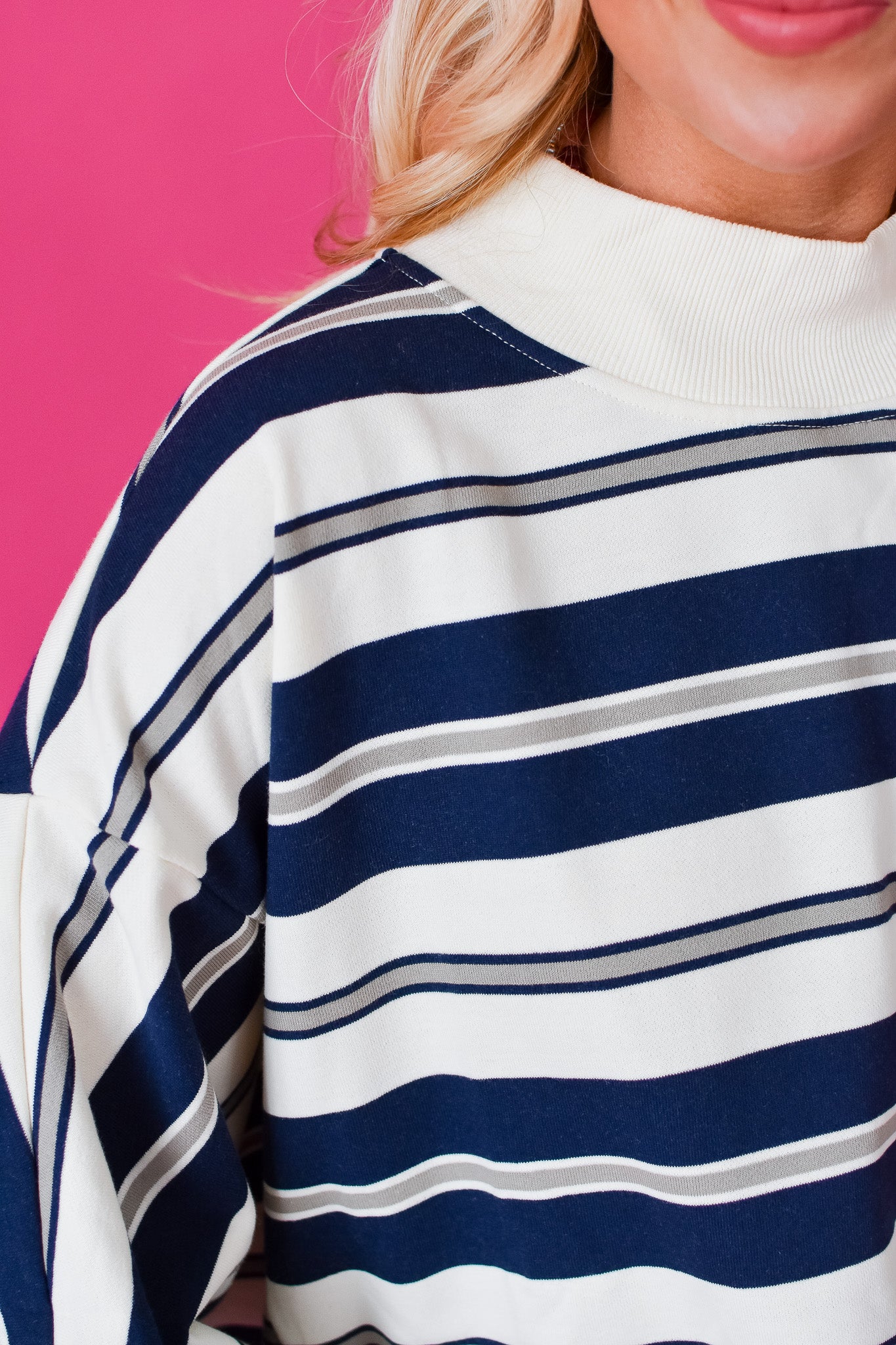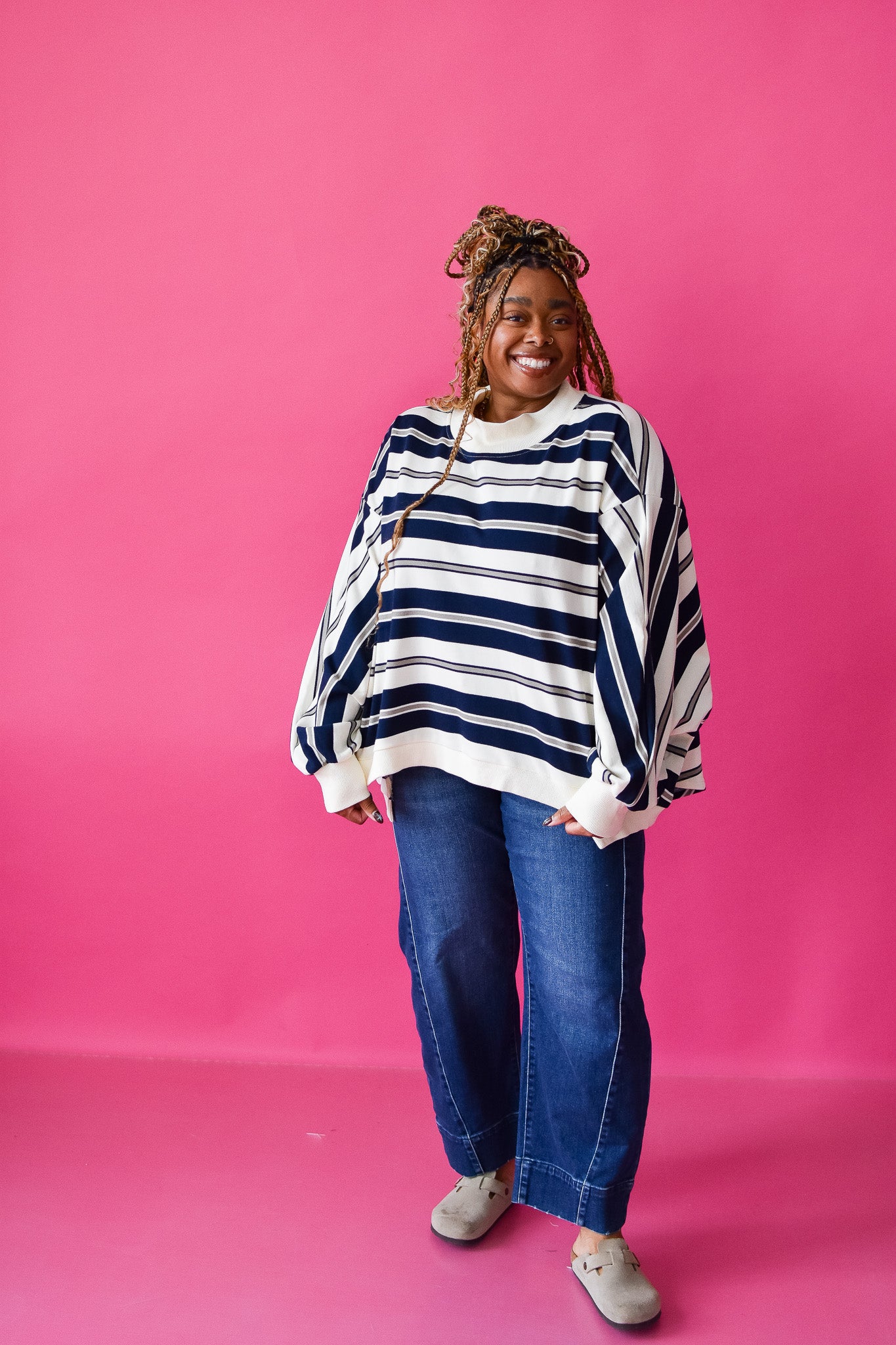 Throw on this Navvy striped oversized mock neck top and instantly level up your comfort game. The relaxed fit drapes effortlessly over your frame, perfect for those days when you want to look put-together without trying too hard. Classic stripes add visual interest while the crew neckline keeps things timeless and versatile. Layer it, wear it solo, or make it your new go-to for casual vibes that actually feel good.