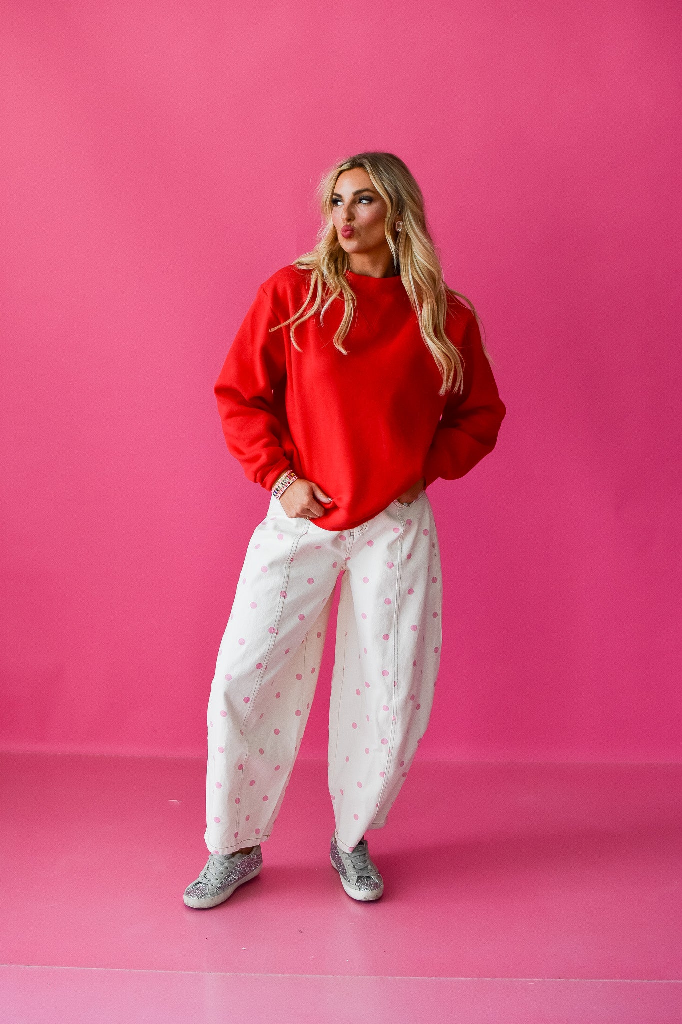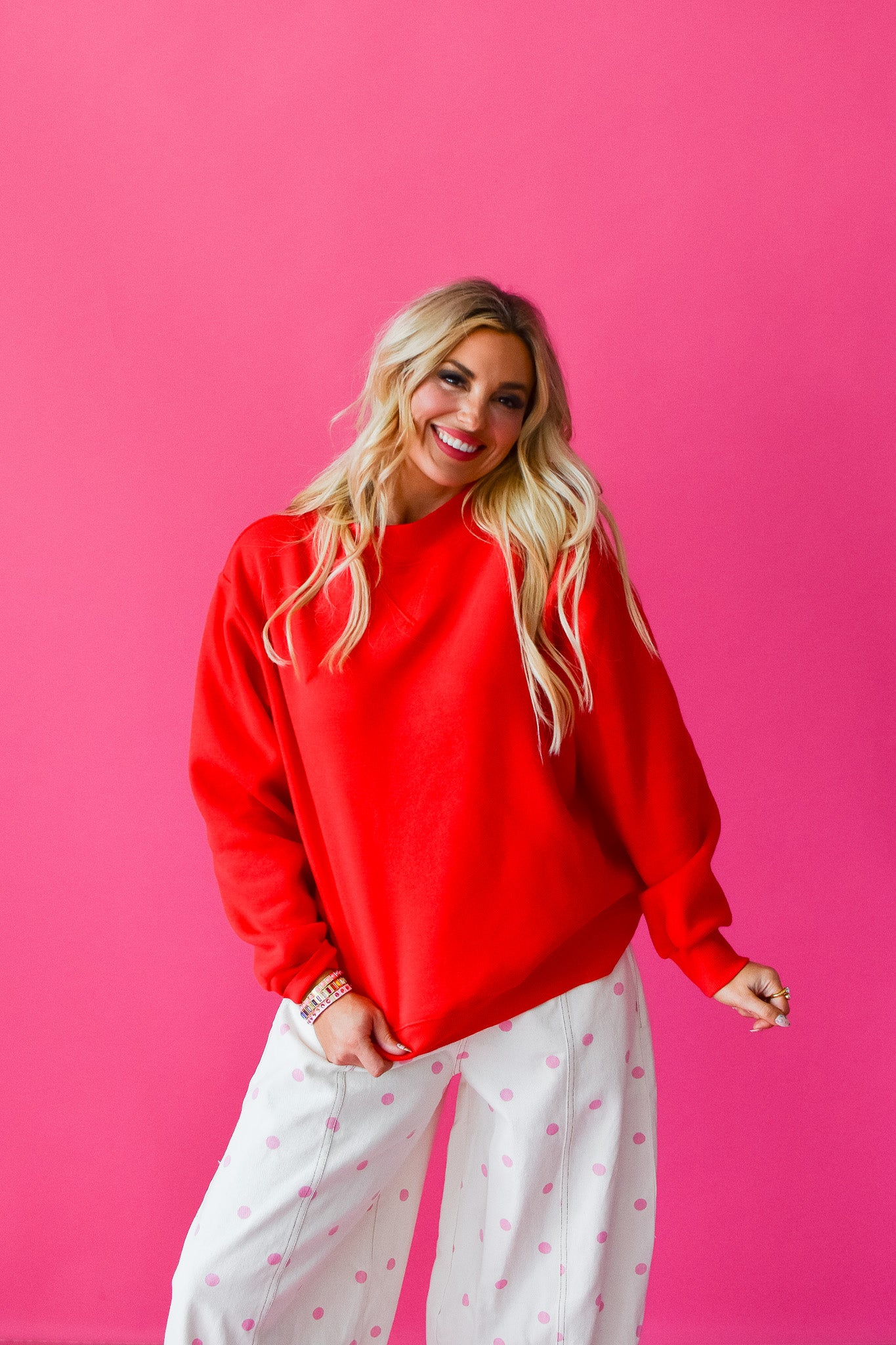 Wrap yourself in cozy vibes with the Olivia Mock Neck Sweatshirt. This oversized red essential features a fleece lining that keeps you toasty warm, while the wide mock neck adds a touch of laid-back style. The generous fit is perfect for lounging, running errands, or just being comfortably you. Soft, snug, and effortlessly cool—your new favorite sweatshirt awaits.