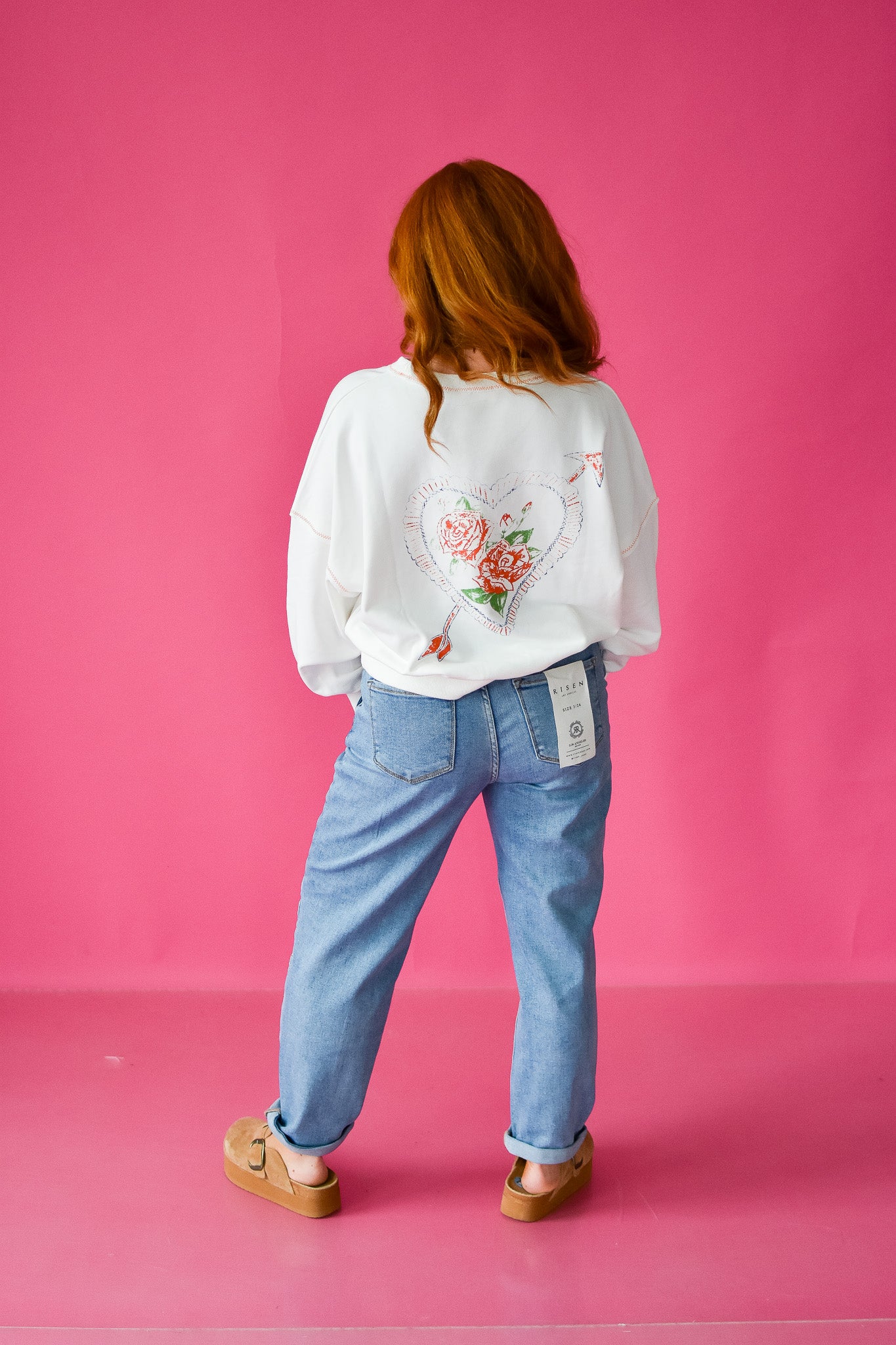 The Payton Sweatshirt brings cozy comfort with a playful twist, featuring fun rose stitching on a crisp white background. Its relaxed fit makes it perfect for casual days paired with your favorite jeans or effortlessly stylish when dressed up with a vibrant skirt. Embrace a fresh, relaxed look that's both charming and versatile.