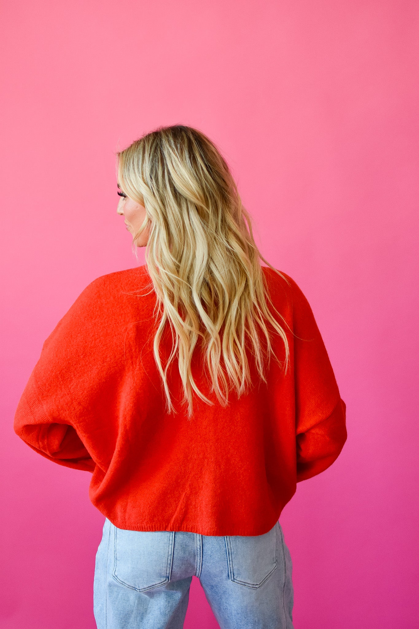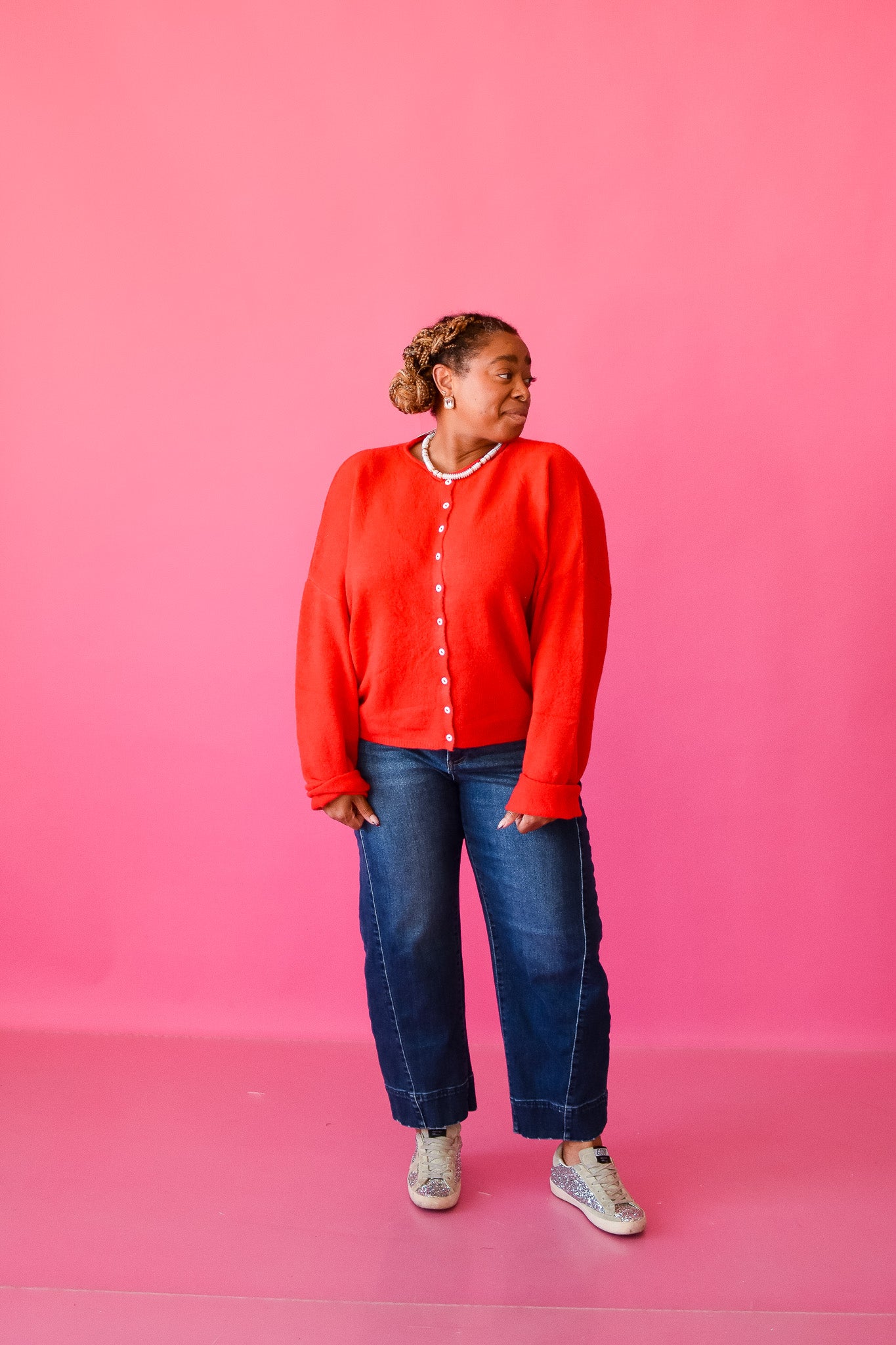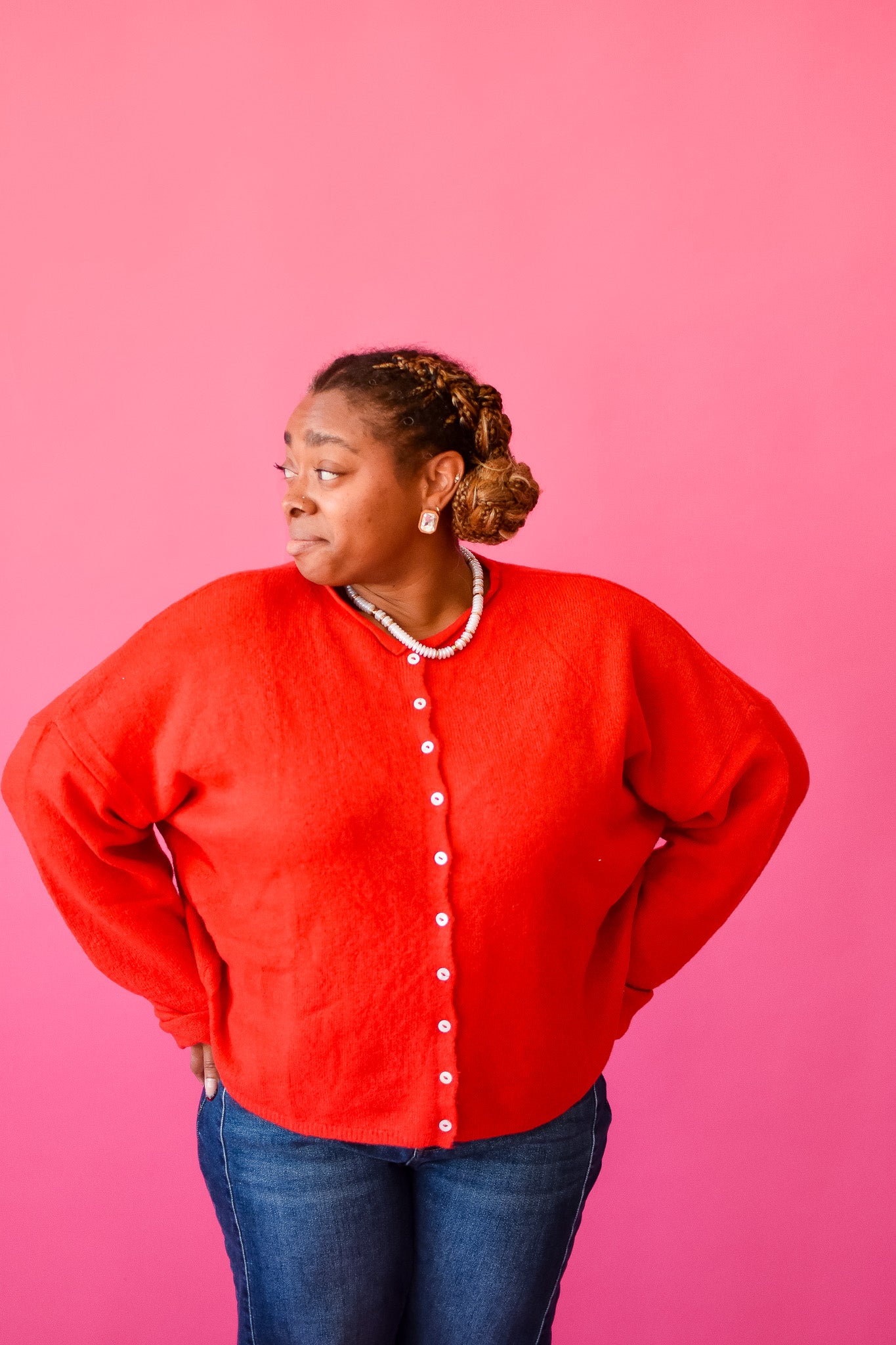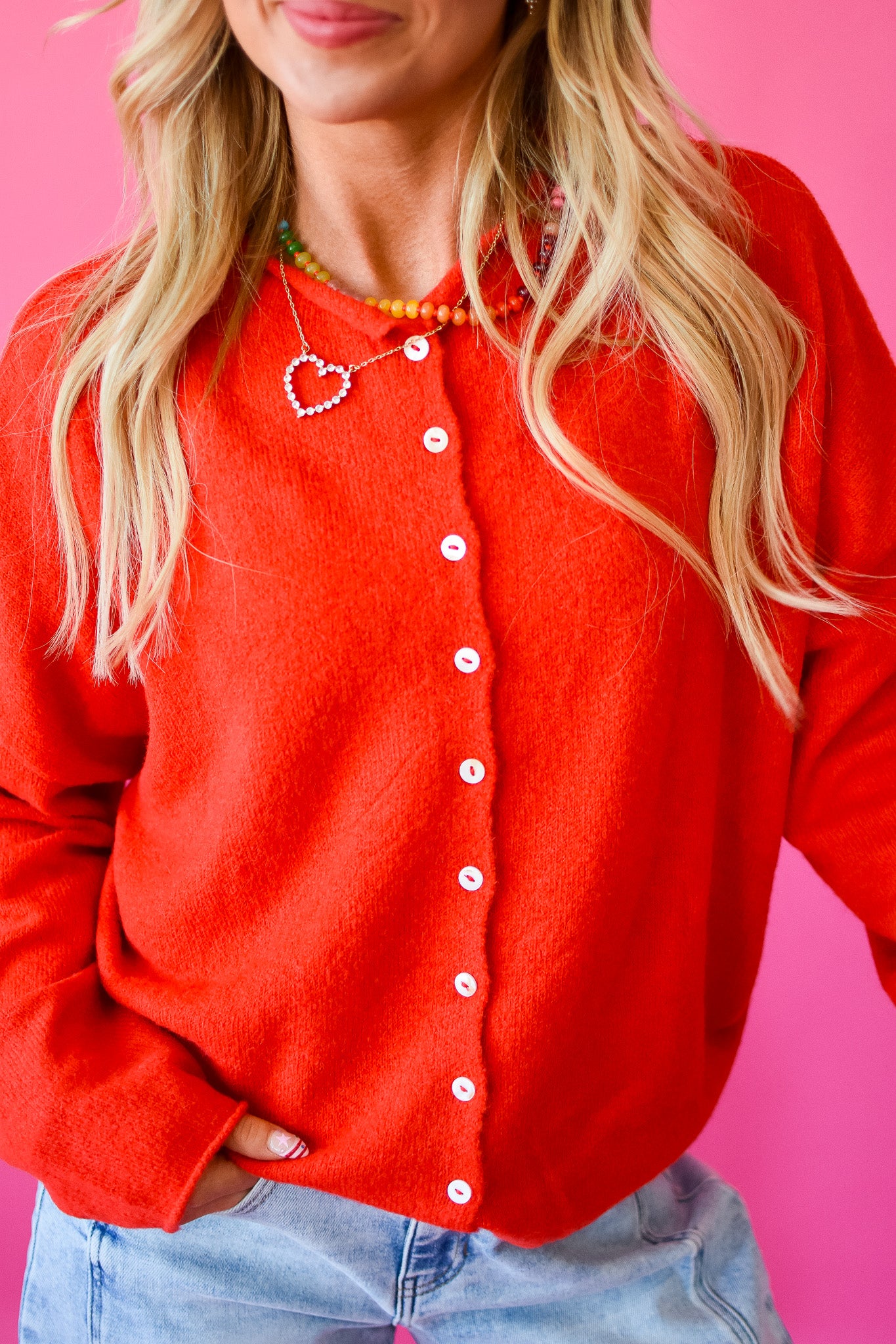 Get ready to go viral in our playful Piper Cardigan! This tomato red button up cardigan features super soft fabric, white buttons and an oversized, relaxed fit for maximum comfort and style.