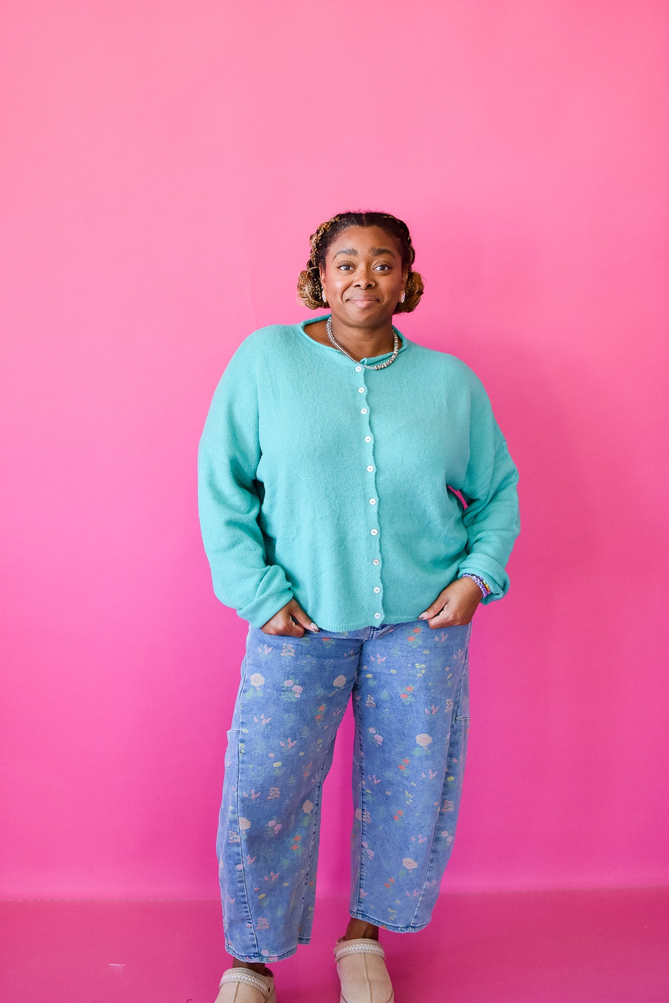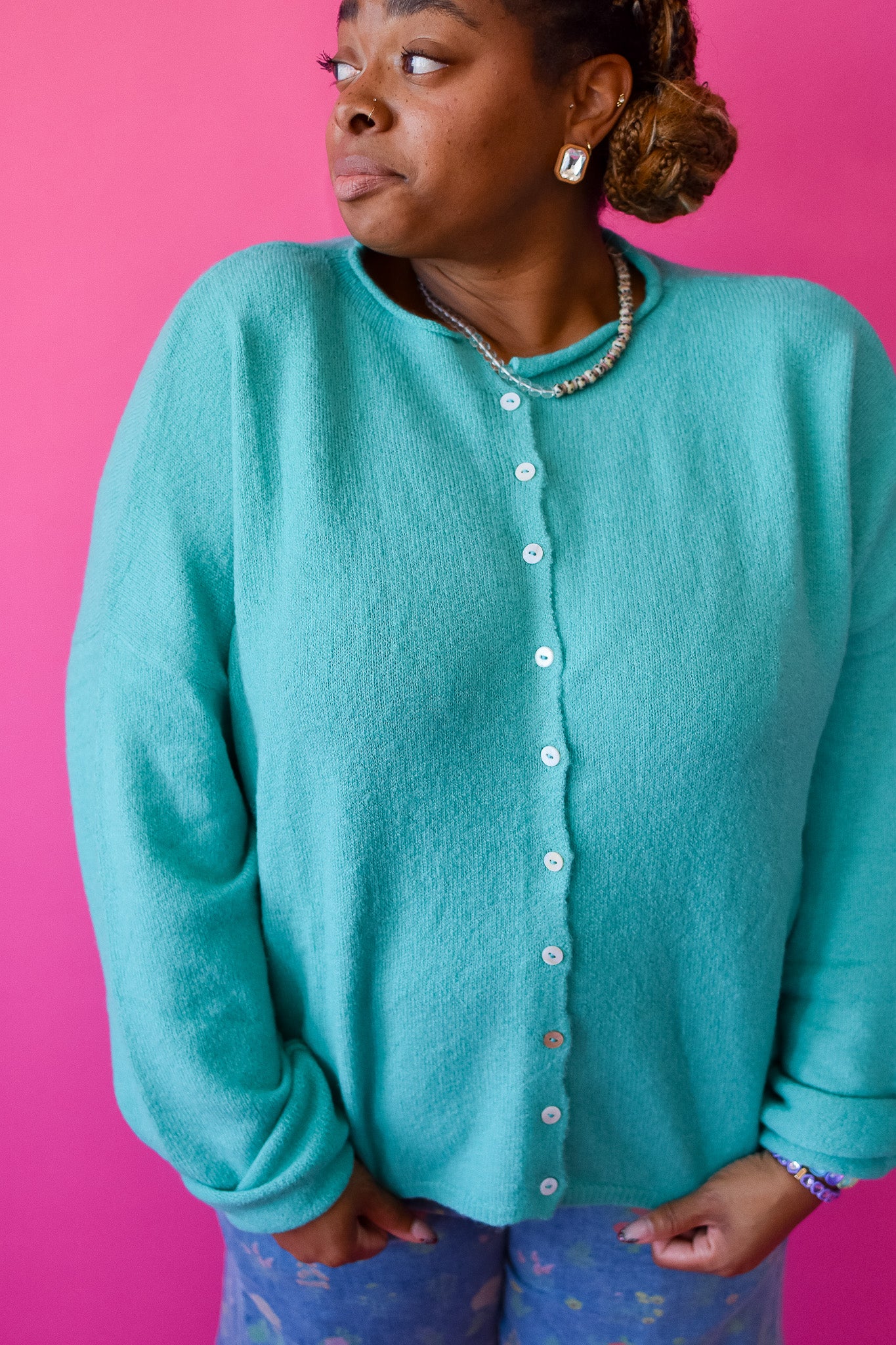 Get ready to go viral in our playful Piper Cardigan! This turquoise button up cardigan features super soft fabric, white buttons and an oversized, relaxed fit for maximum comfort and style.