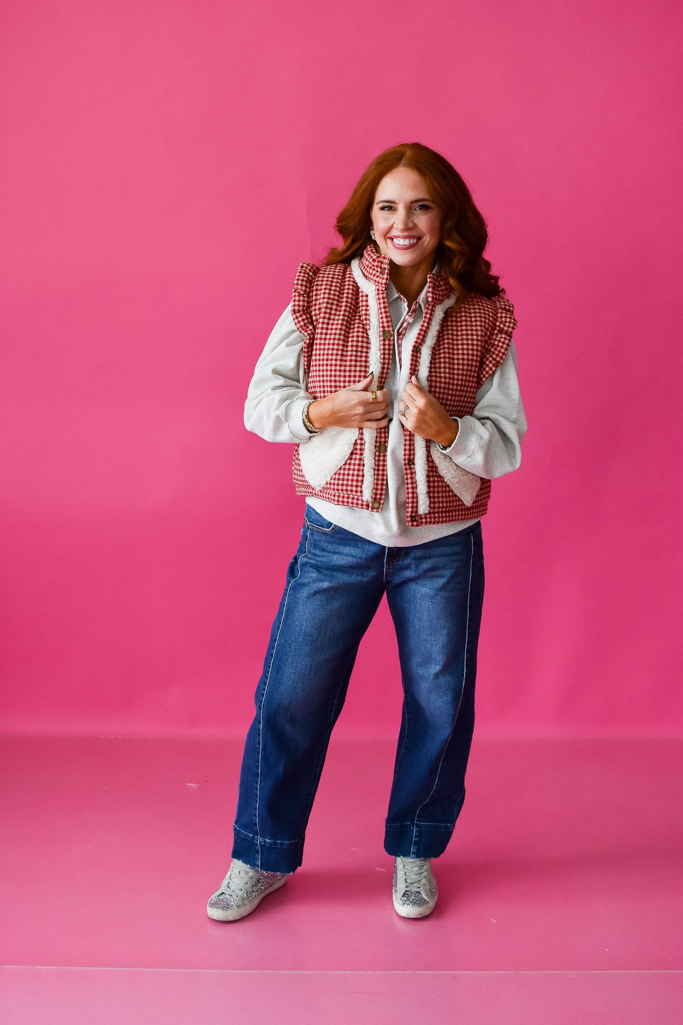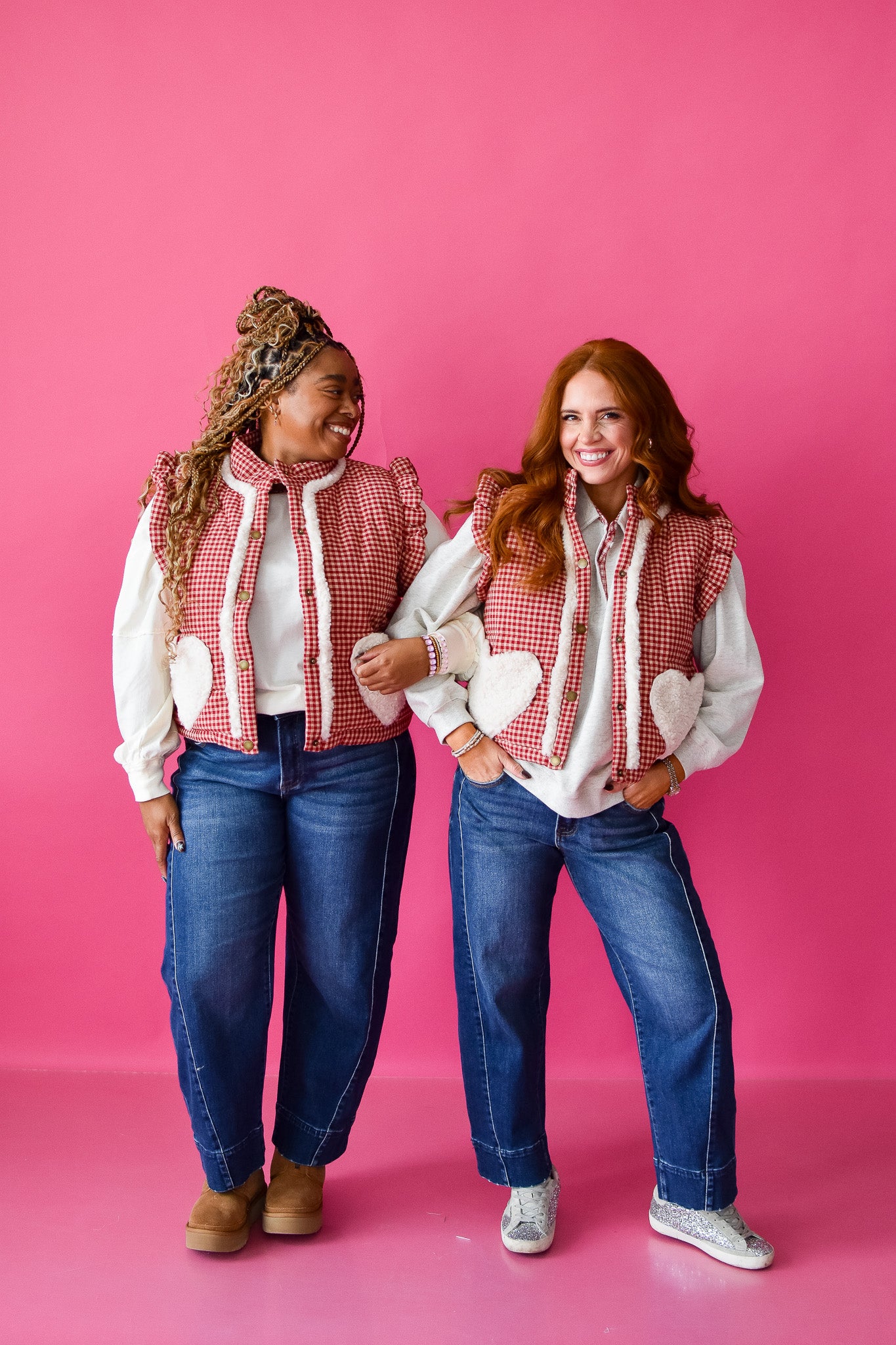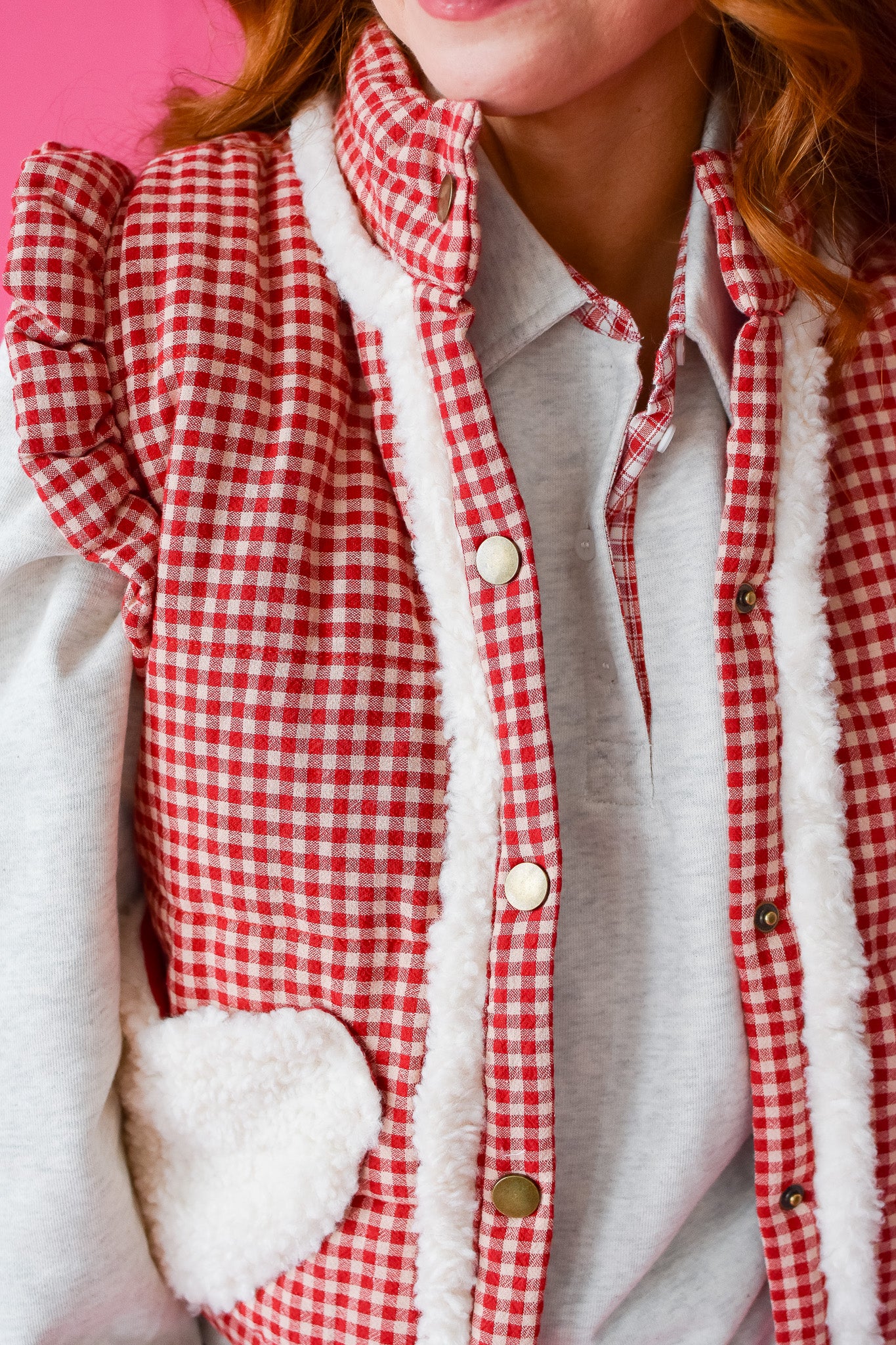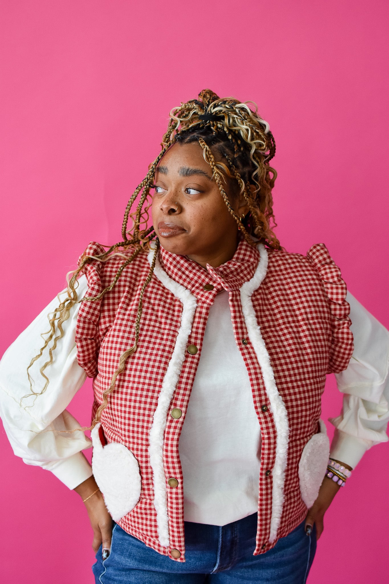 Cozy up in this adorable gingham sherpa vest that's equal parts comfort and charm. Featuring a relaxed fit, delicate ruffles cascading down the shoulders, and sweet cream hearts adorning the pockets, the Quincy is your new go-to layering piece. Whether you're embracing the season or planning ahead for Valentine's Day, this playful vest brings warmth and whimsy to any outfit.
