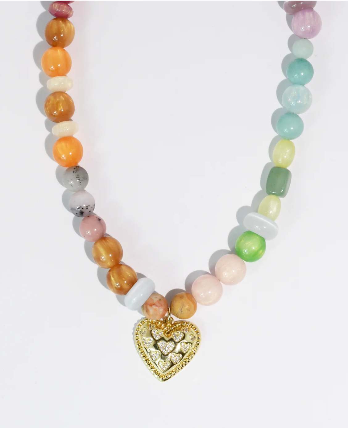 This vibrant beaded necklace brings instant joy with its chunky rainbow gemstones and gleaming gold heart charm. Each colorful bead catches the light beautifully, creating a cheerful statement piece that works as well layered with other necklaces as it does worn solo. Perfect for adding a pop of personality to any outfit, whether you're dressing up or keeping it casual. The sturdy gold heart charm serves as a sweet reminder to wear your heart on your sleeve—literally!