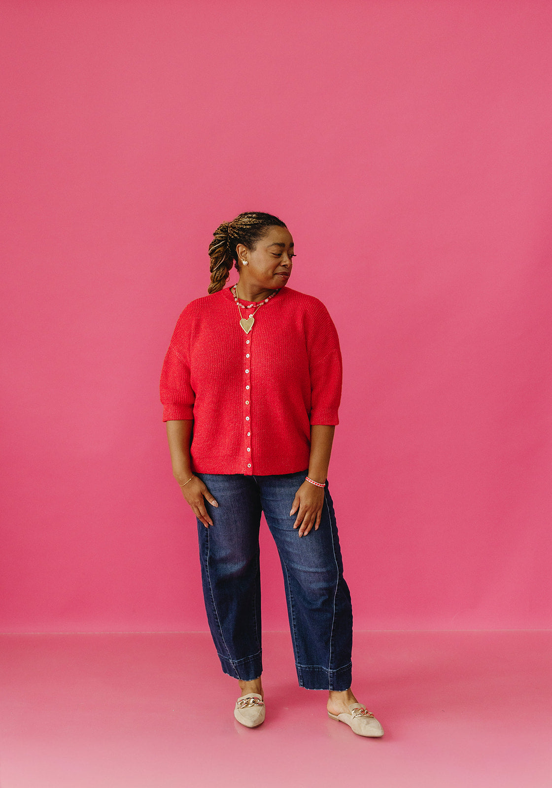 The Rowan Cardigan is an absolute dream—seriously, the fit is a 10/10. Crafted from incredibly soft fabric with functional buttons that actually work, this is the cardigan you've been waiting for. Perfect for Valentine's Day or any day you want to feel effortlessly put-together, it features slimmer sleeves that hit right at your elbow for a flattering silhouette. Similar fit to our beloved Piper style, but with that extra tailored touch. Your new favorite layer awaits.
