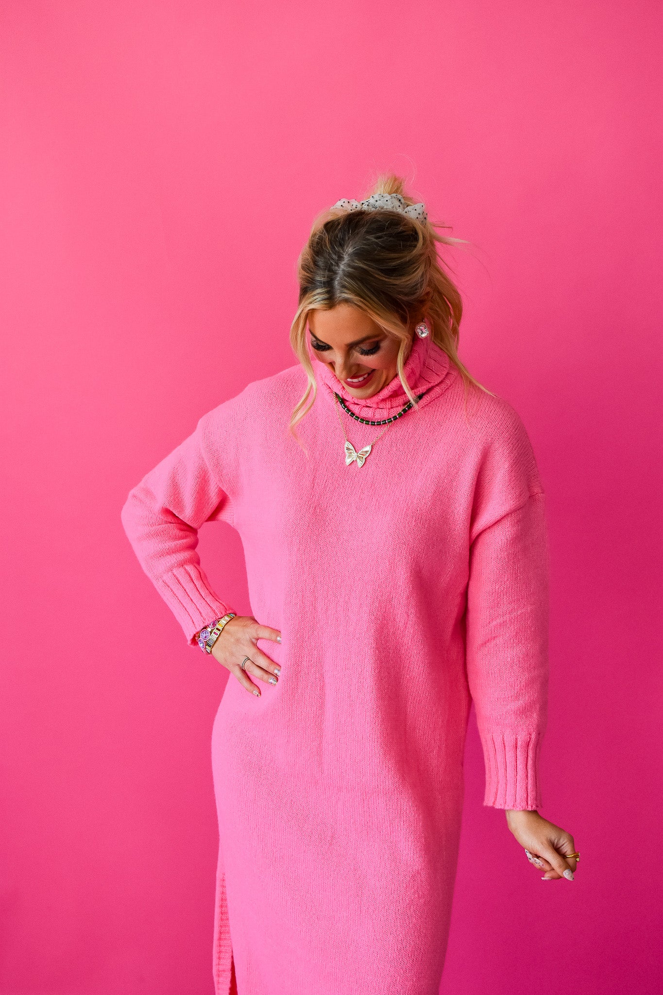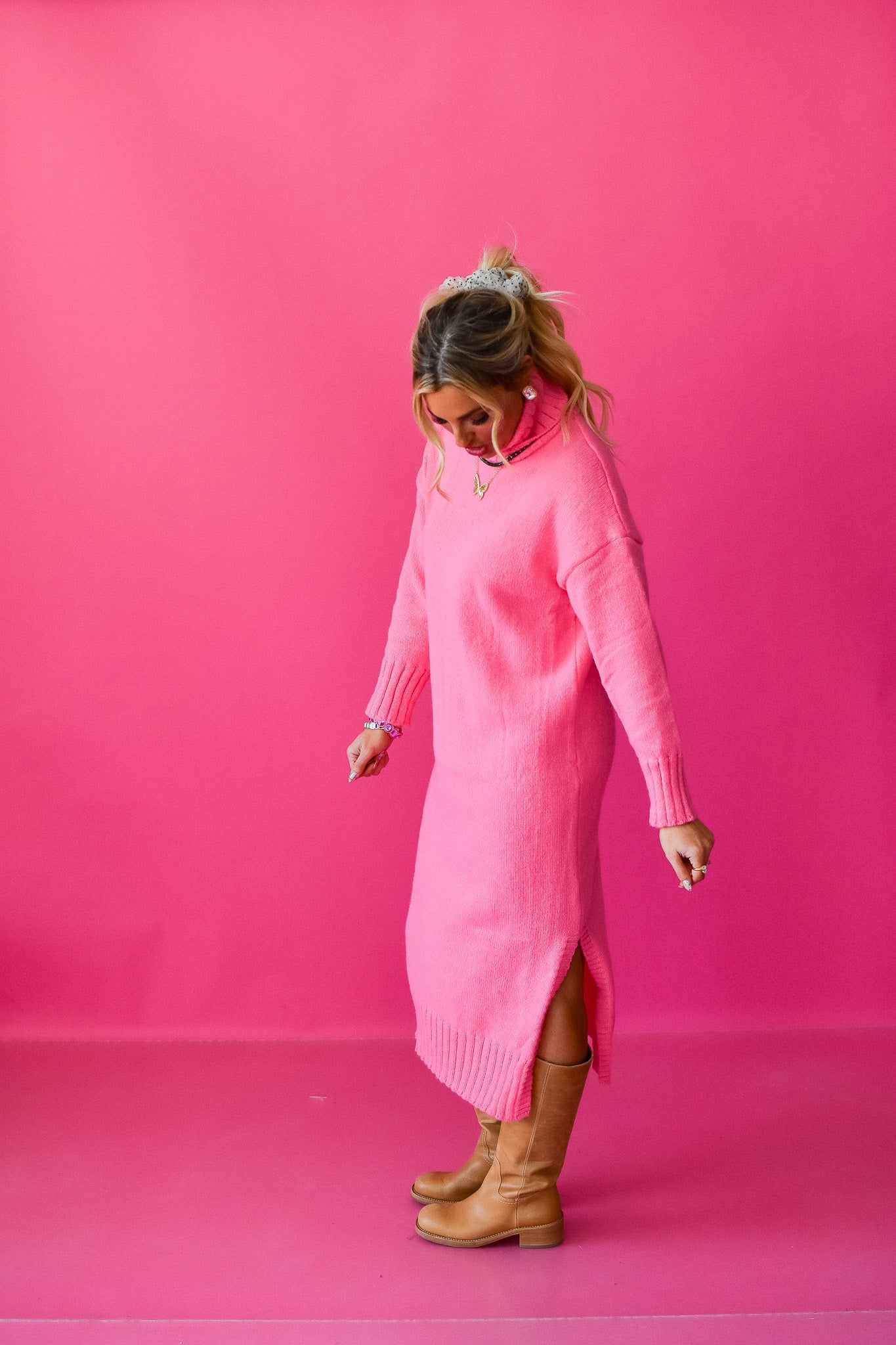 Wrap yourself in cozy vibes with the Sophia Midi Sweater Dress in Pink—your new go-to for effortless winter style. This chunky knit beauty features a relaxed, comfortable fit that lets you move freely while keeping you toasty warm. The eye-catching pink hue brings a fun pop of color to dreary days, making it perfect for layering with your favorite scarf or wearing solo. From casual coffee runs to weekend hangouts, this maxi-length sweater dress delivers comfort without compromising on style.