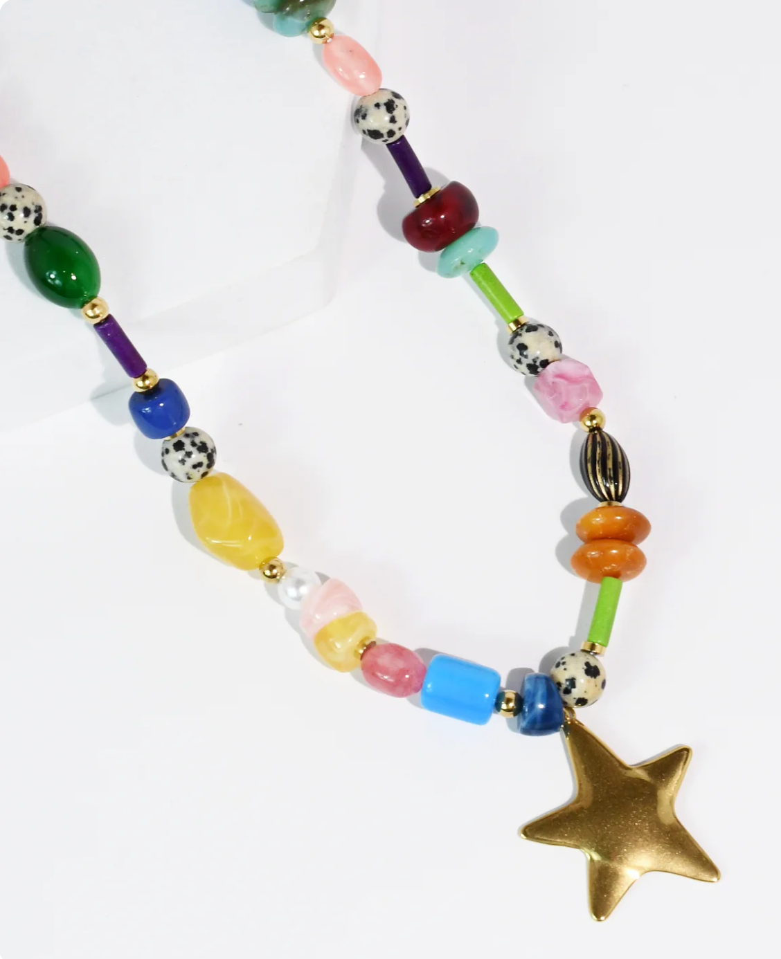 Make a bold statement with this funky star pendant necklace featuring a dazzling mix of multicolored beads. The eye-catching star charm sparkles with personality, while the eclectic bead selection creates a one-of-a-kind vibe that celebrates your unique style. Whether you're channeling cosmic energy or just want to stand out from the crowd, this playful piece delivers instant fun and flair. Layer it, wear it solo, or pair it with your favorite casual looks for that extra dash of whimsy.